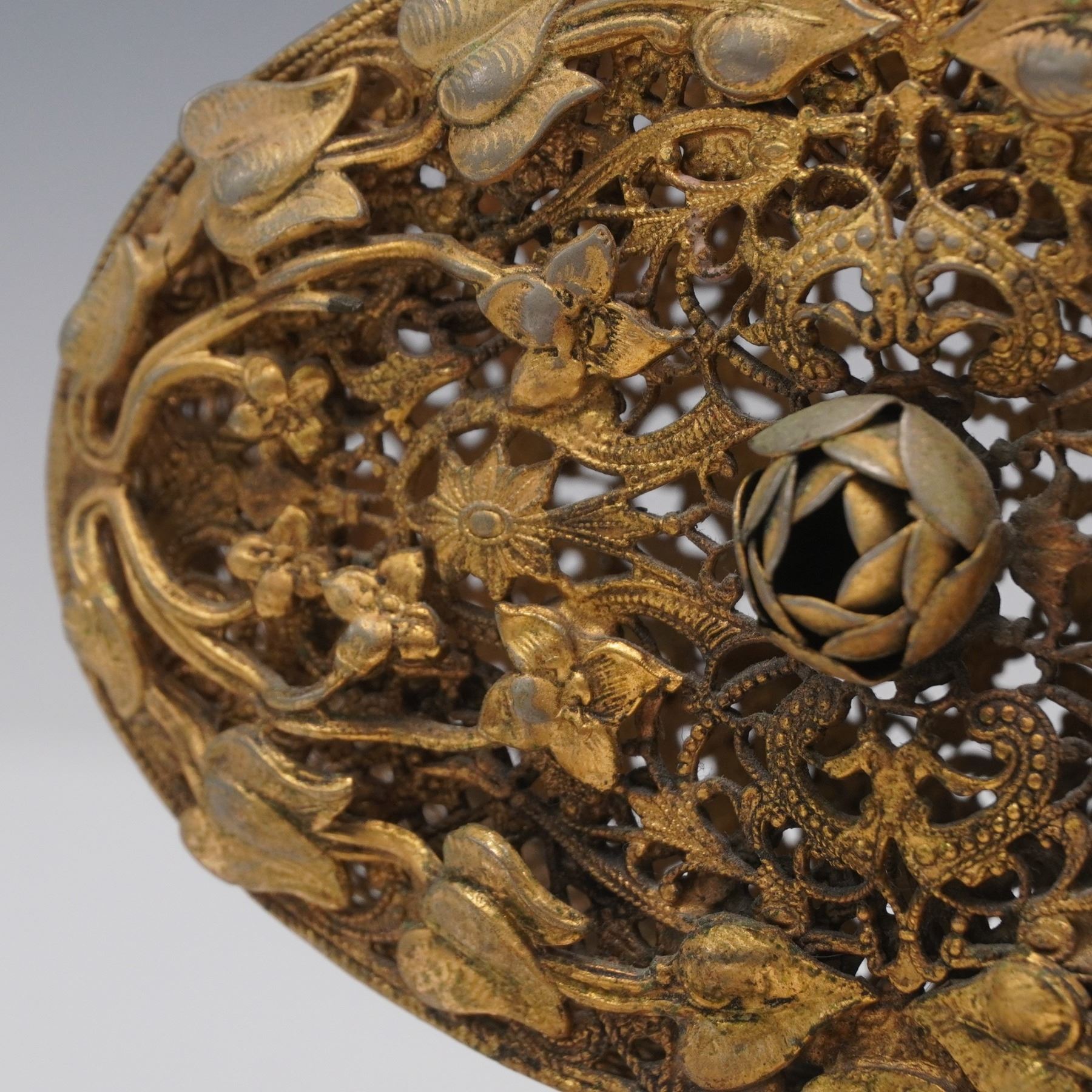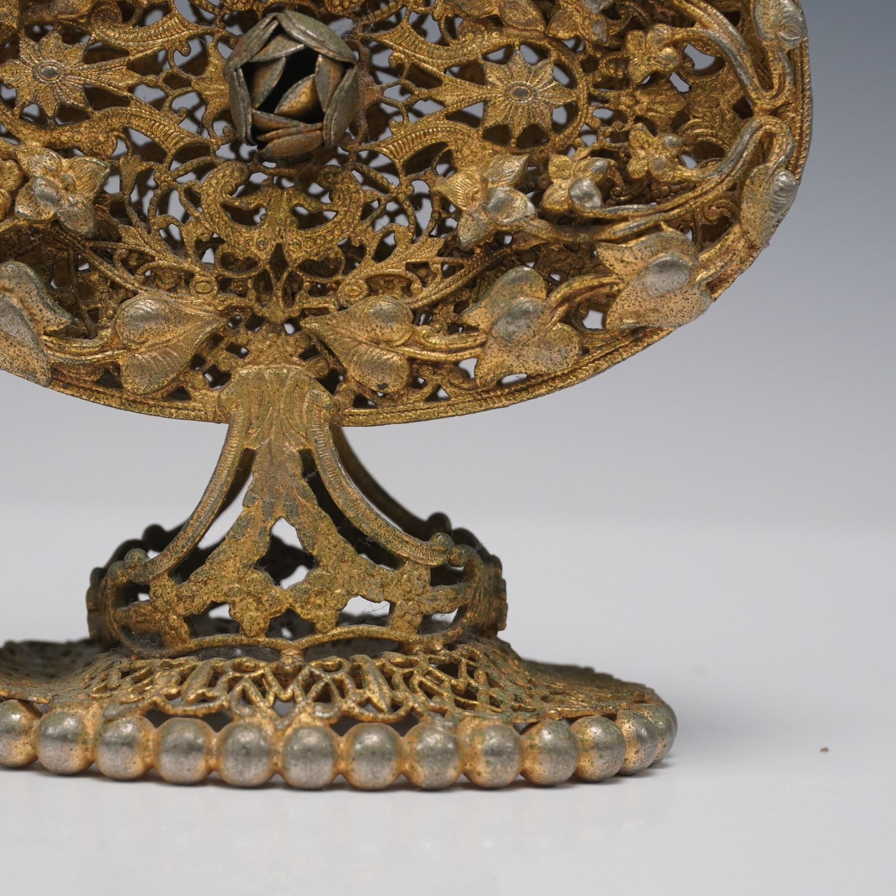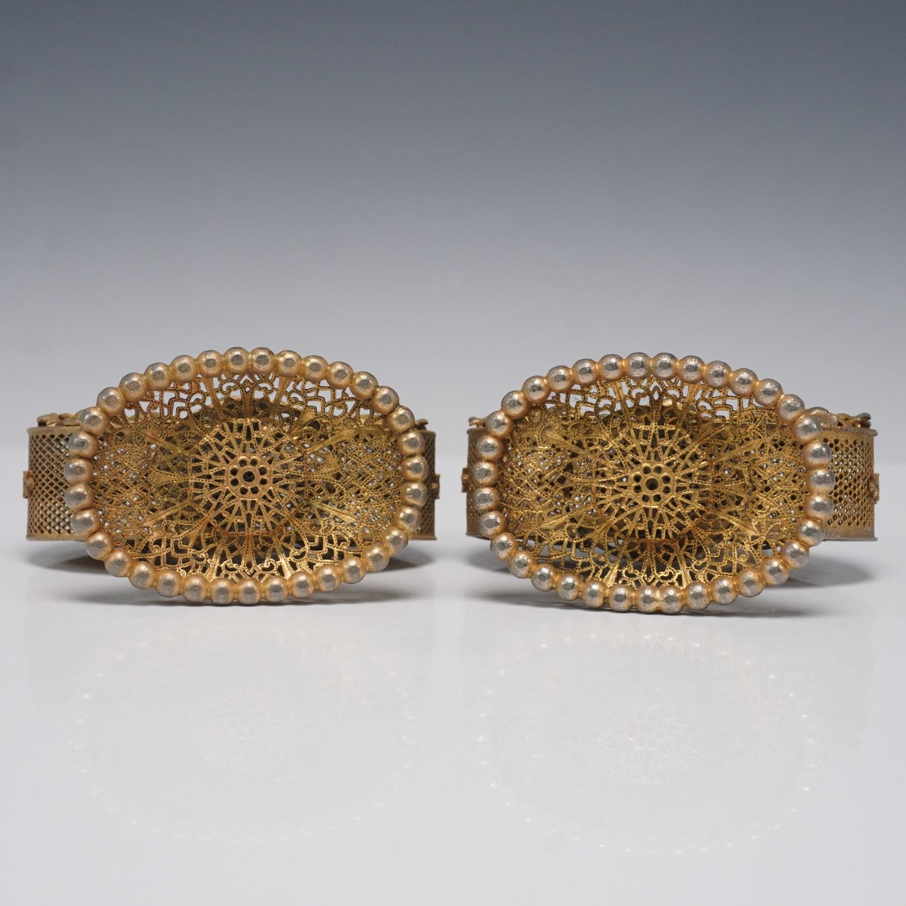 Set of two vintage gilt metal perfume bottles featuring ornate ormolu filigree with floral motifs and matching pierced stoppers. Classic Hollywood Regency vanity decor with rich patina and intricate openwork.