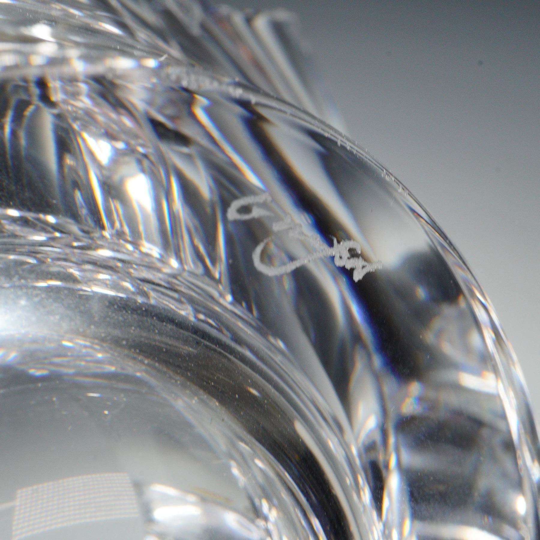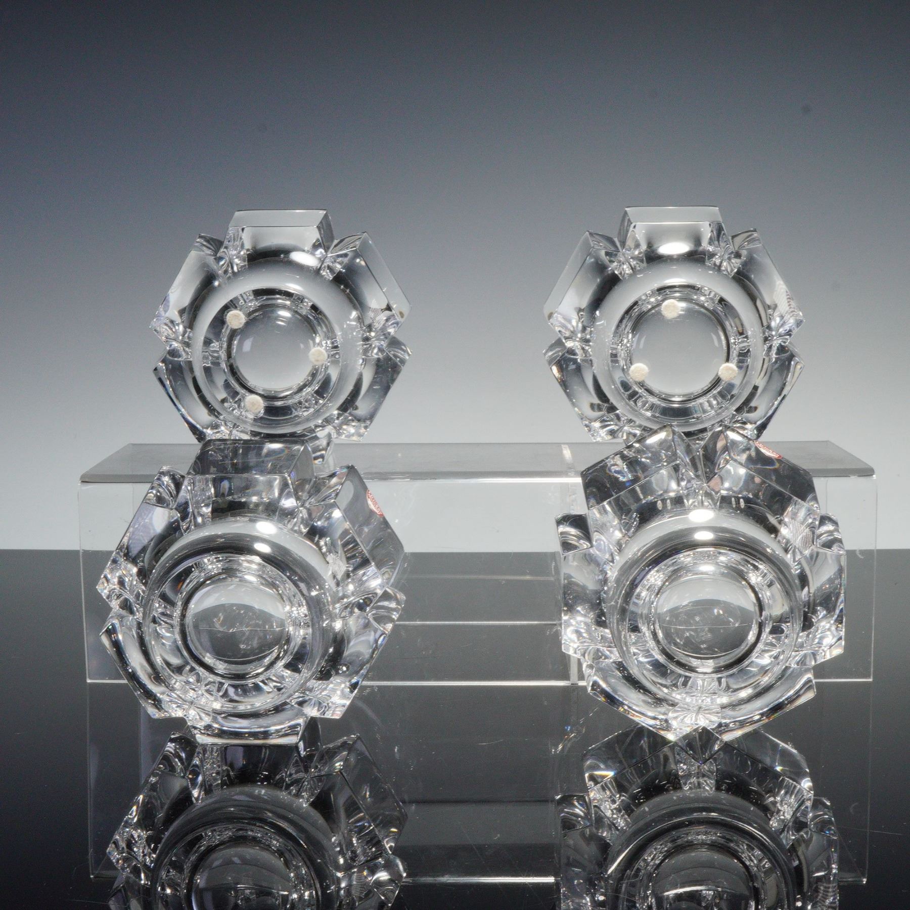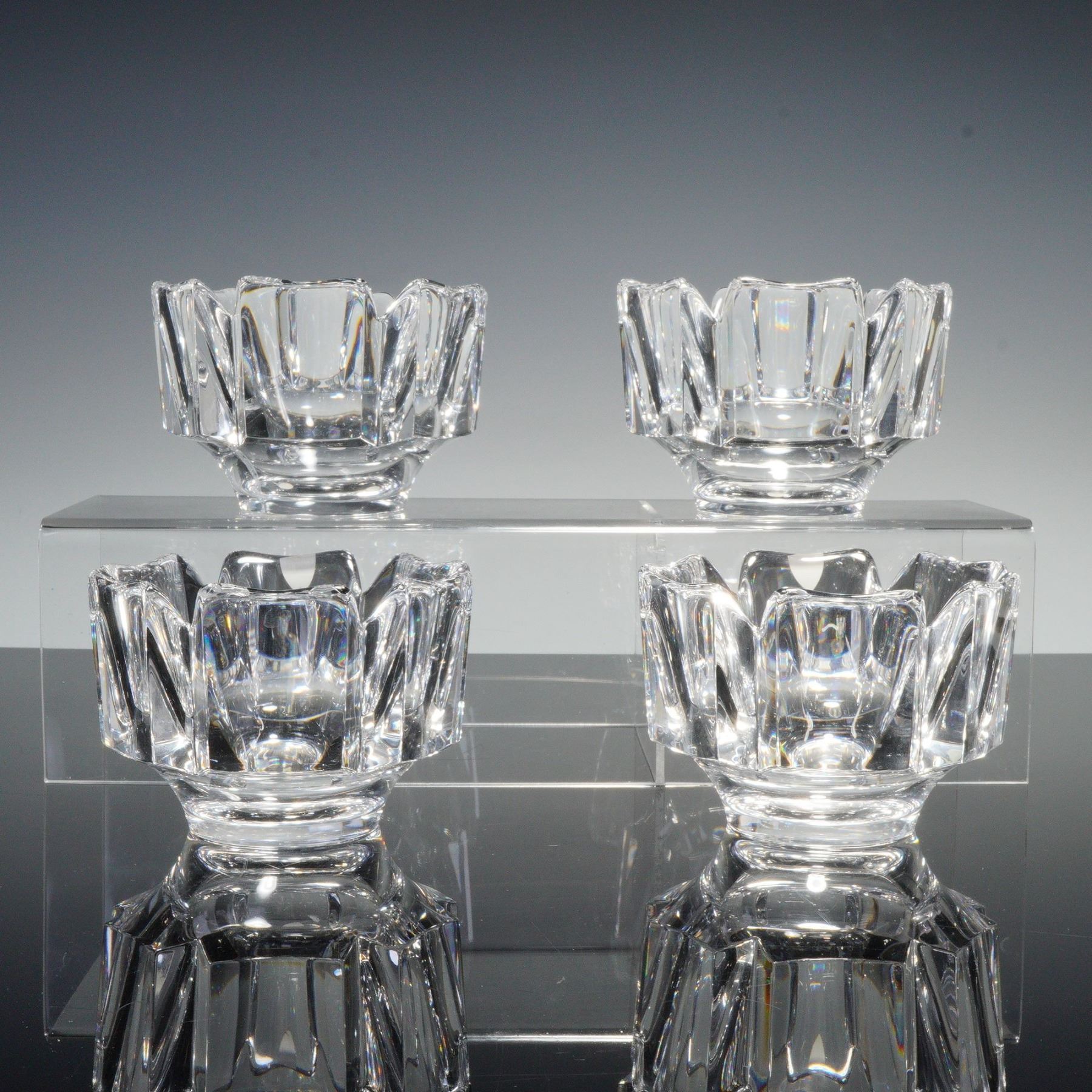 Four crystal bowls from the Corona series by Orrefors, Sweden. Each displays a sculpted form with deep vertical cuts radiating from the base to create a crown-like rim. The bowls are marked Orrefors on the base, with three retaining the original red label.