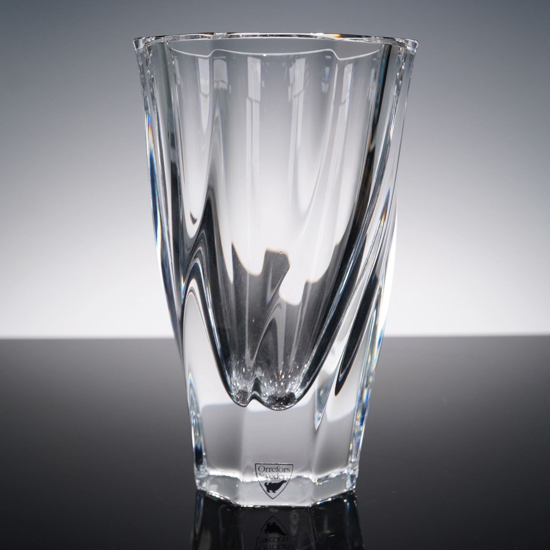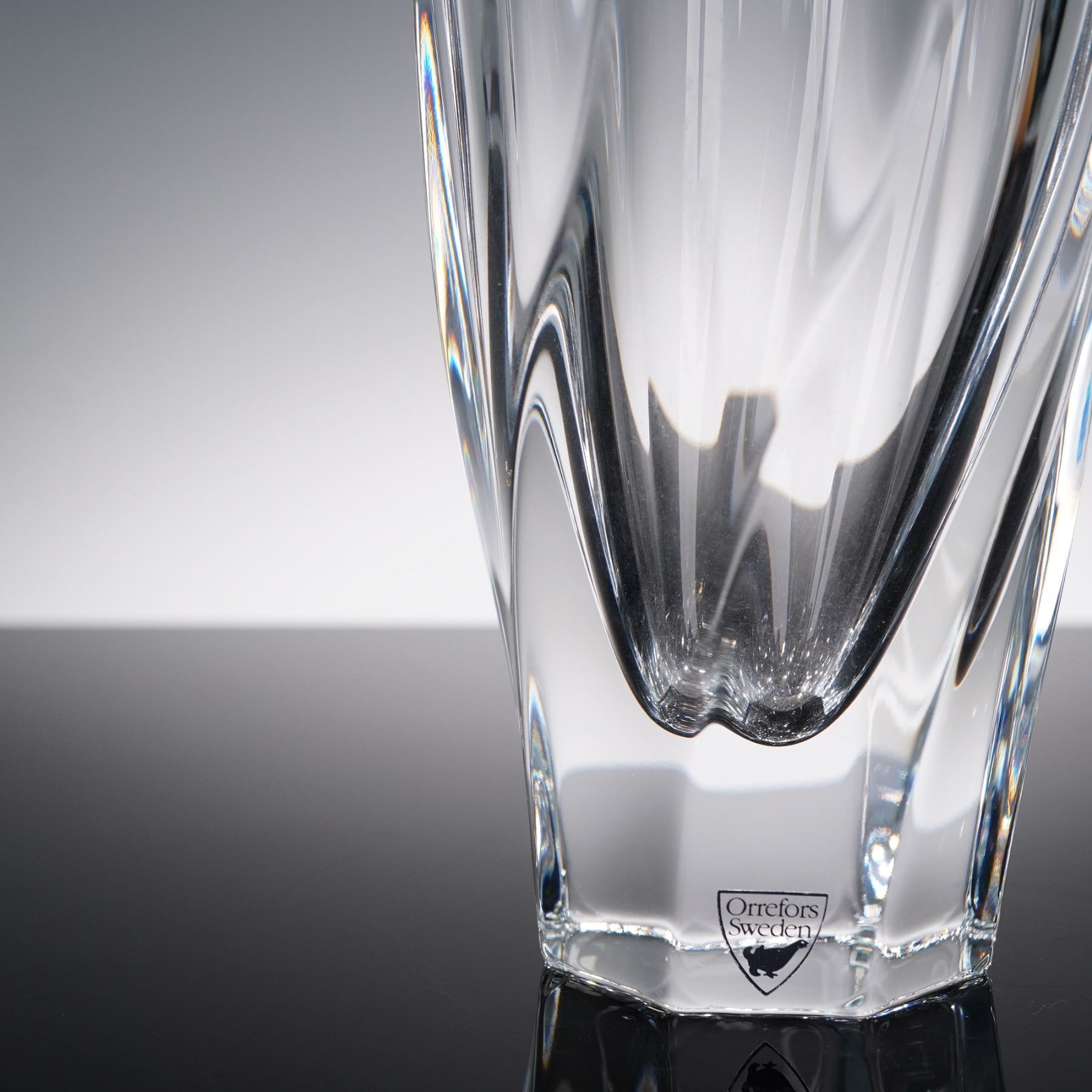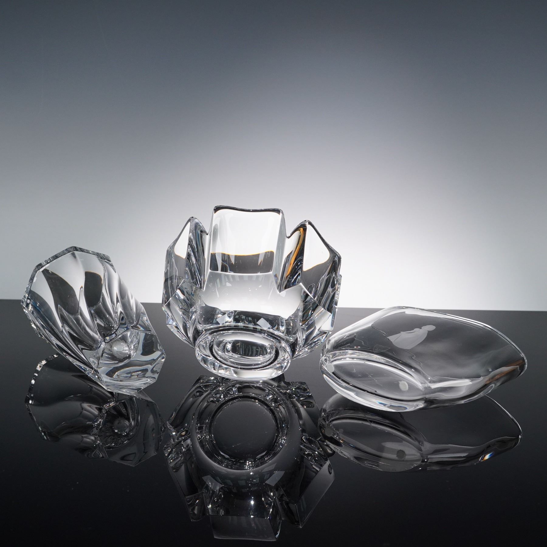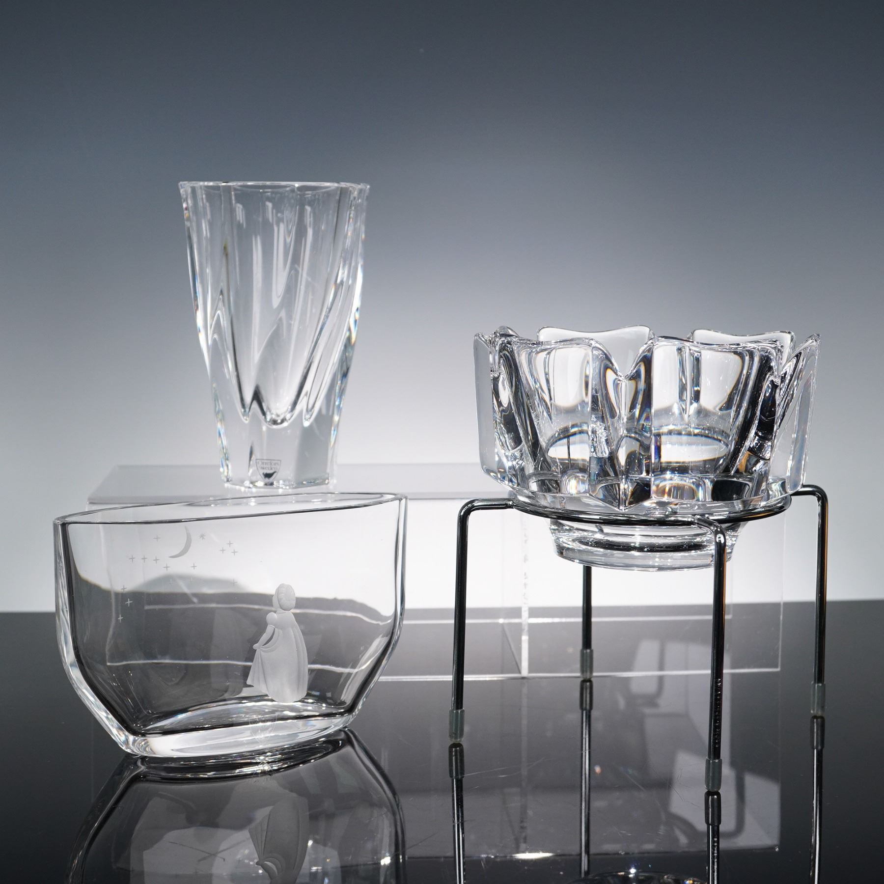 This Orrefors crystal trio features a modern faceted vase, a petite vase etched with a whimsical scene of a girl beneath a moon and stars, and a sculptural round bowl showcasing bold vertical cuts and presented on a metal stand. Each piece bears the Orrefors mark and reflects the brand's renowned Scandinavian craftsmanship and luminous clarity. Vase 1: 3.5"W x 6"H. Vase 2: 6.25"L x 2.5"W x 4"H. Vase 3 with stand: 7"W x 7"H.