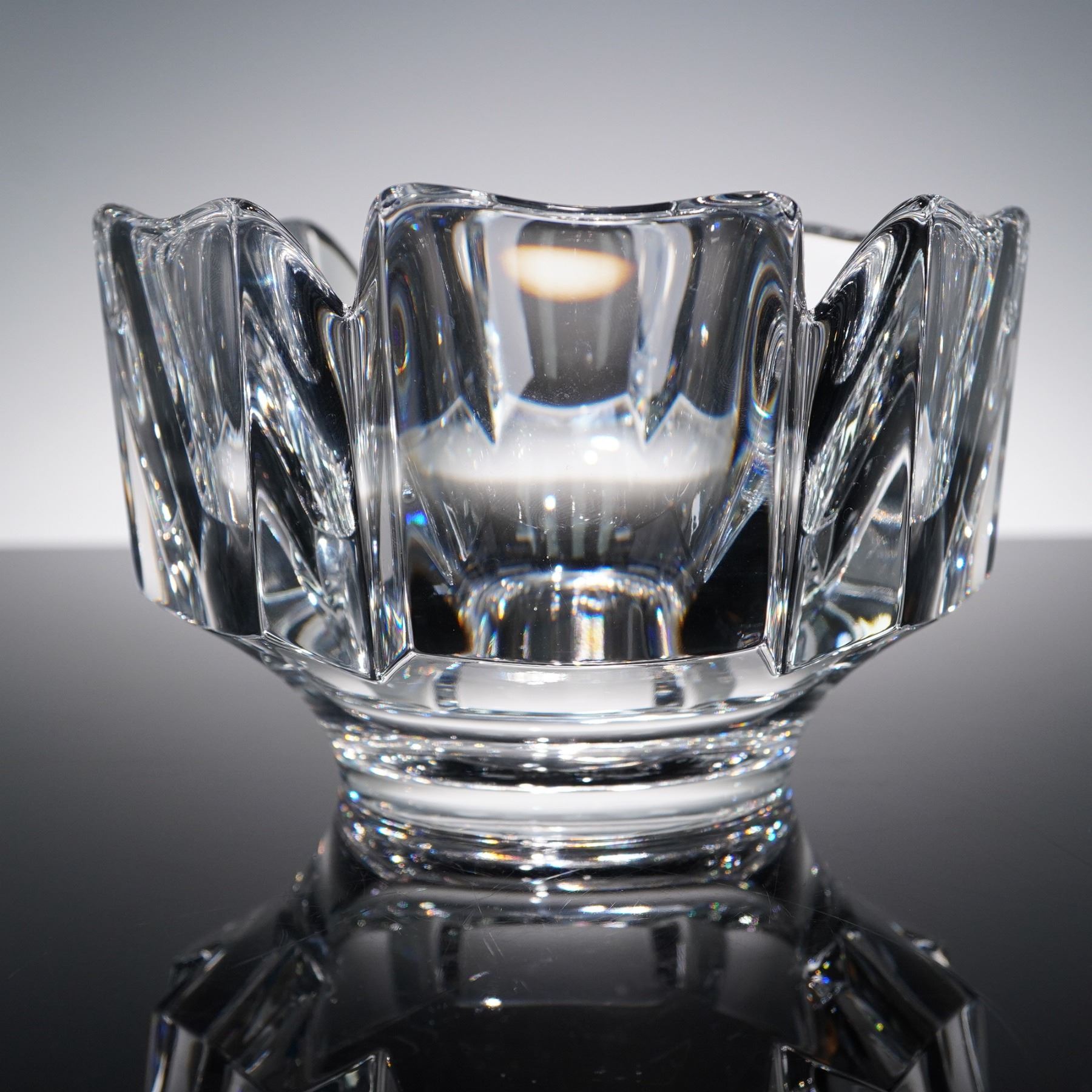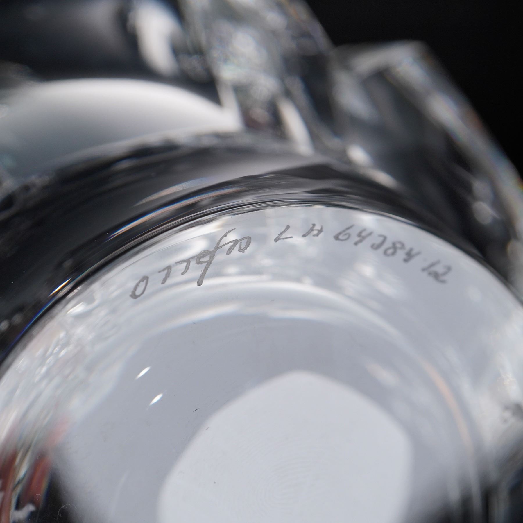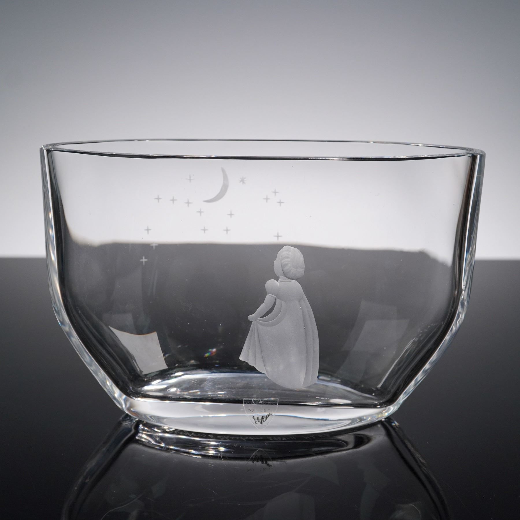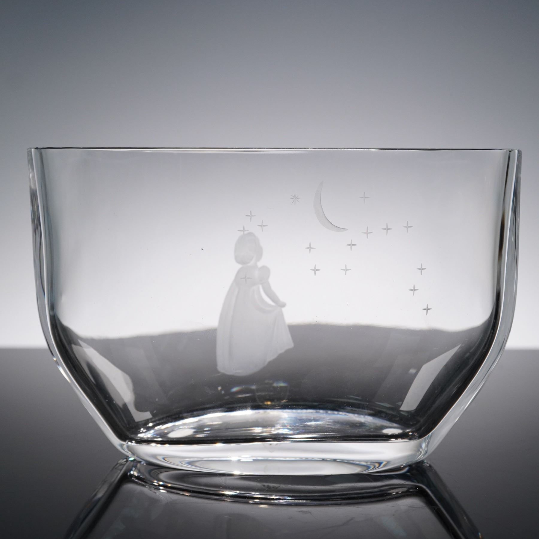 This Orrefors crystal trio features a modern faceted vase, a petite vase etched with a whimsical scene of a girl beneath a moon and stars, and a sculptural round bowl showcasing bold vertical cuts and presented on a metal stand. Each piece bears the Orrefors mark and reflects the brand's renowned Scandinavian craftsmanship and luminous clarity. Vase 1: 3.5"W x 6"H. Vase 2: 6.25"L x 2.5"W x 4"H. Vase 3 with stand: 7"W x 7"H.