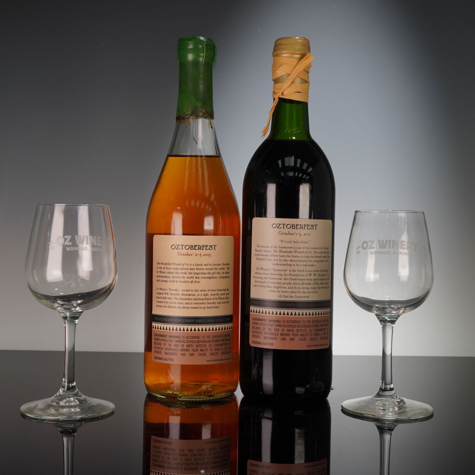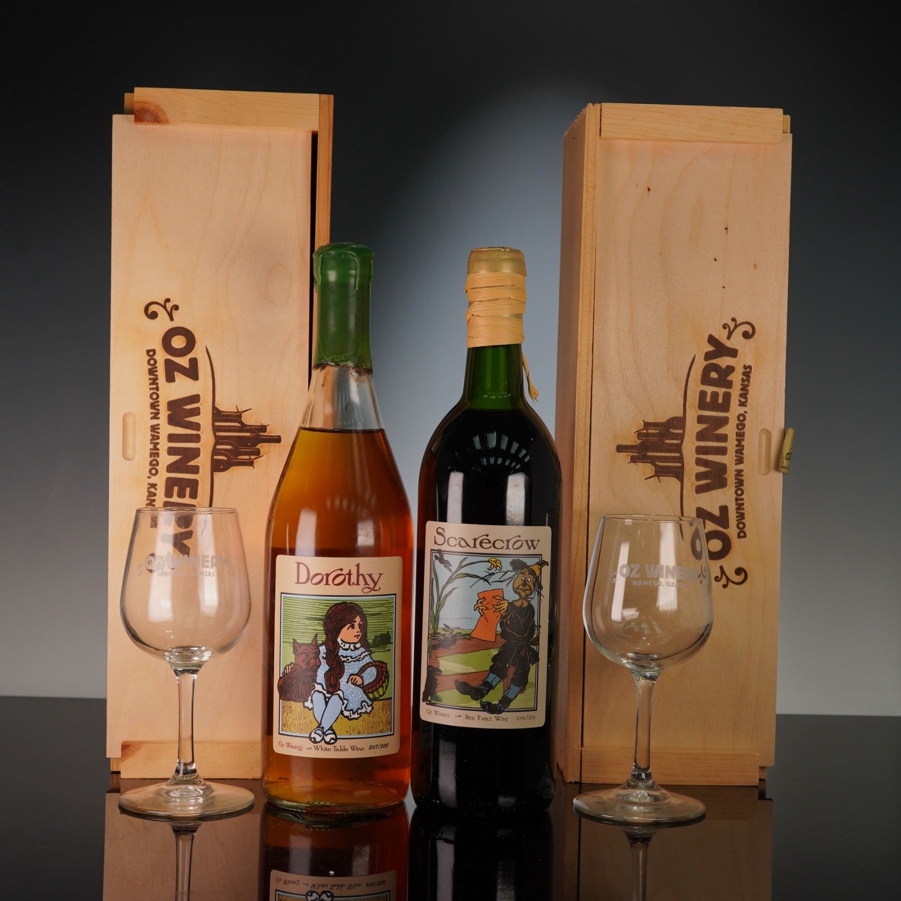 A charming duo from the Oz Winery of Wamego, Kansas, presented in their original branded wooden display crates. This set includes one bottle of Dorothy, edition number 267 of 500, a sweet white table wine, and one bottle of Scarecrow edition number 274 of 275, a bold red table wine, each featuring whimsical Wizard of Oz-themed labels and sealed with colorful wax tops embossed with the Oz logo. The lot also includes two matching Oz Winery stemmed wine glasses, completing a beautifully themed presentation perfect for collectors or enthusiasts of Kansas winemaking and classic storybook nostalgia. In-house shipping is not available for this lot. Winning Bidders will have to arrange to pick up their purchases at the Lion and Unicorn Auction Studios at 200 Oakwood Ln. Suite 200 Hollywood, Florida 33020, or make arrangements with their own third-party shipper. A local third-party shipper that can be contacted directly for a domestic shipping quote is: First Class Shipping Center 7826 NW 44th Street Sunrise, FL 33351 Tel: 754-800-7674 Fax : 954-999-5166 Email: 1shippingcenter@gmail.com URL: https://www.1shippingcenter.com