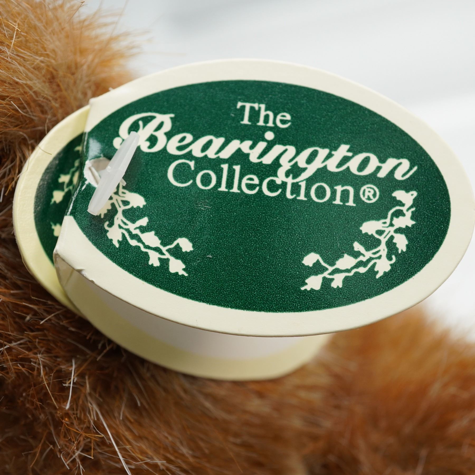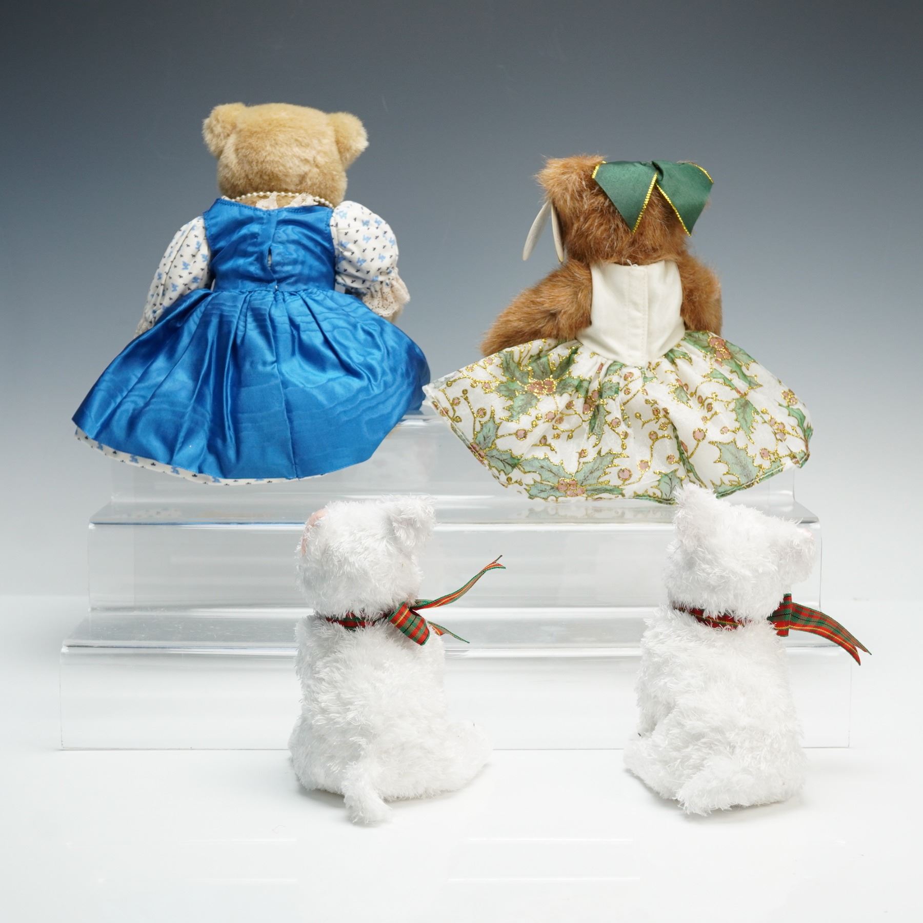 This 4-piece group includes one Bearington Collection Hollyday Dancer bear in green and gold holly-patterned dress, one plush bear in blue satin dress with lace trimmed sleeves and wearing a pearl necklace, and two Ty Beanie Baby dogs named Kirby, each a white terrier with plaid ribbon collar.