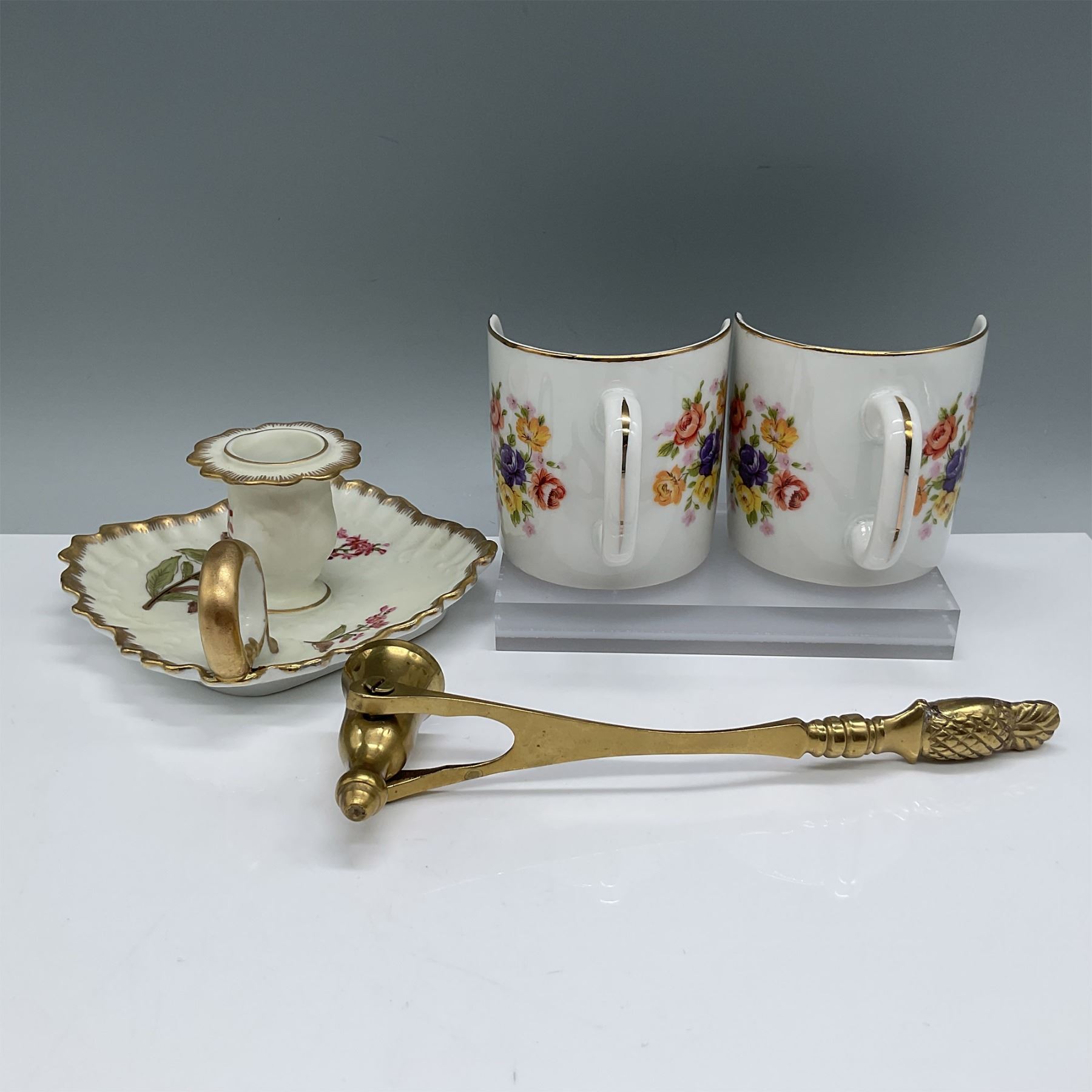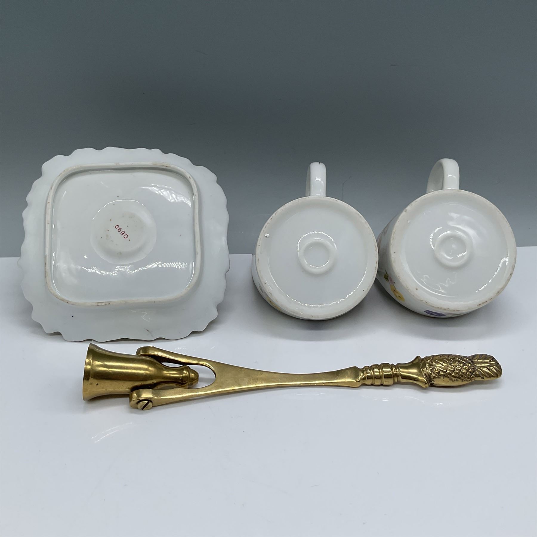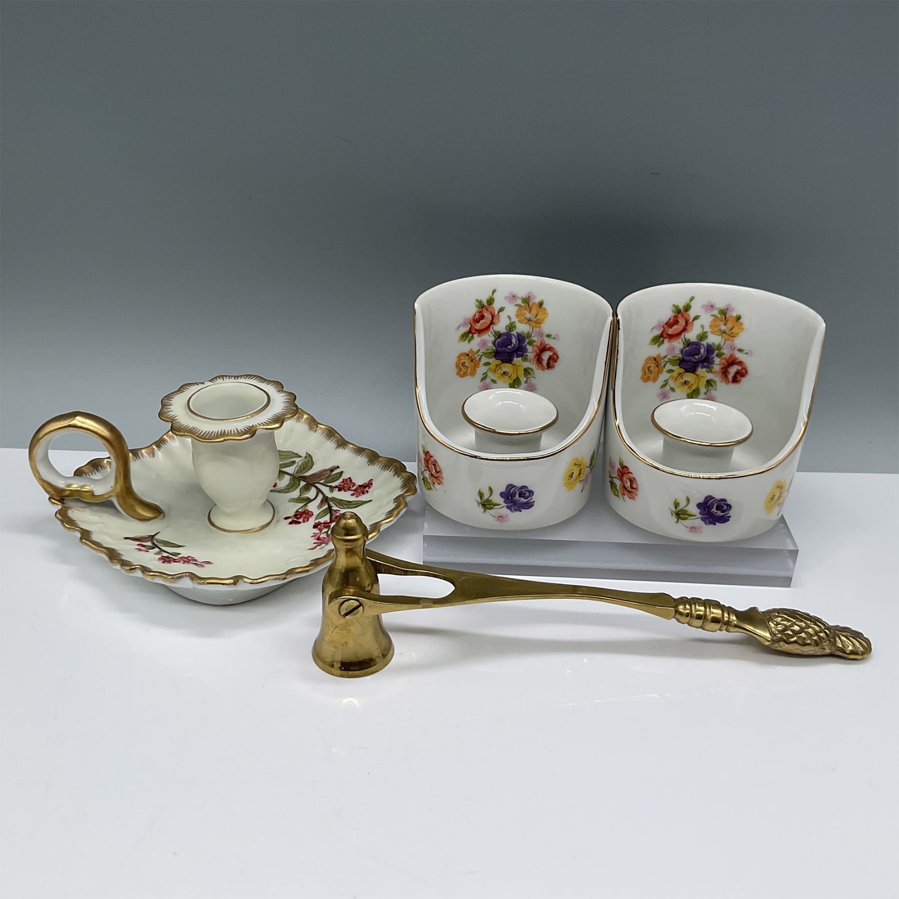 A charming 4-piece collection featuring two porcelain floral match holders with attached strikers, a matching porcelain chamberstick with scalloped edges, and a brass candle snuffer with an ornate handle. The porcelain pieces are adorned with hand-painted multicolor floral patterns and gold accents, adding elegance to their vintage aesthetic. The brass snuffer showcases intricate detailing, including a pineapple motif on the handle. The porcelain pieces are marked on the underside, indicating their maker. Largest piece measures 6"L x 5.5"W.