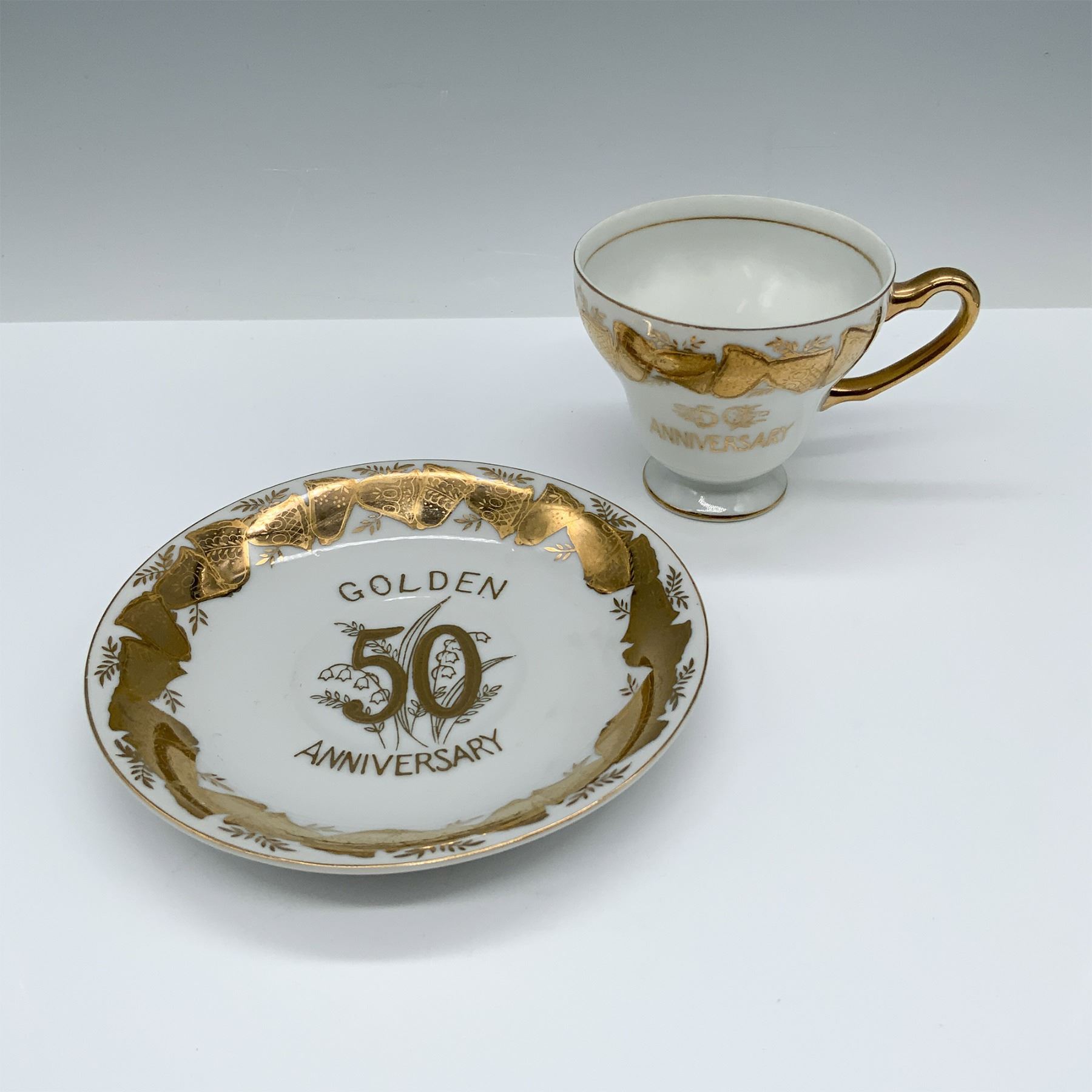 Beautiful duo of gilt cups that includes a tea cup and saucer set decorated with lilacs with a Paris backstamp, and a golden 50th anniversary tea cup and saucer set with a Japan sticker. Largest item measures 4.25"L x 3.25"W x 3"H.