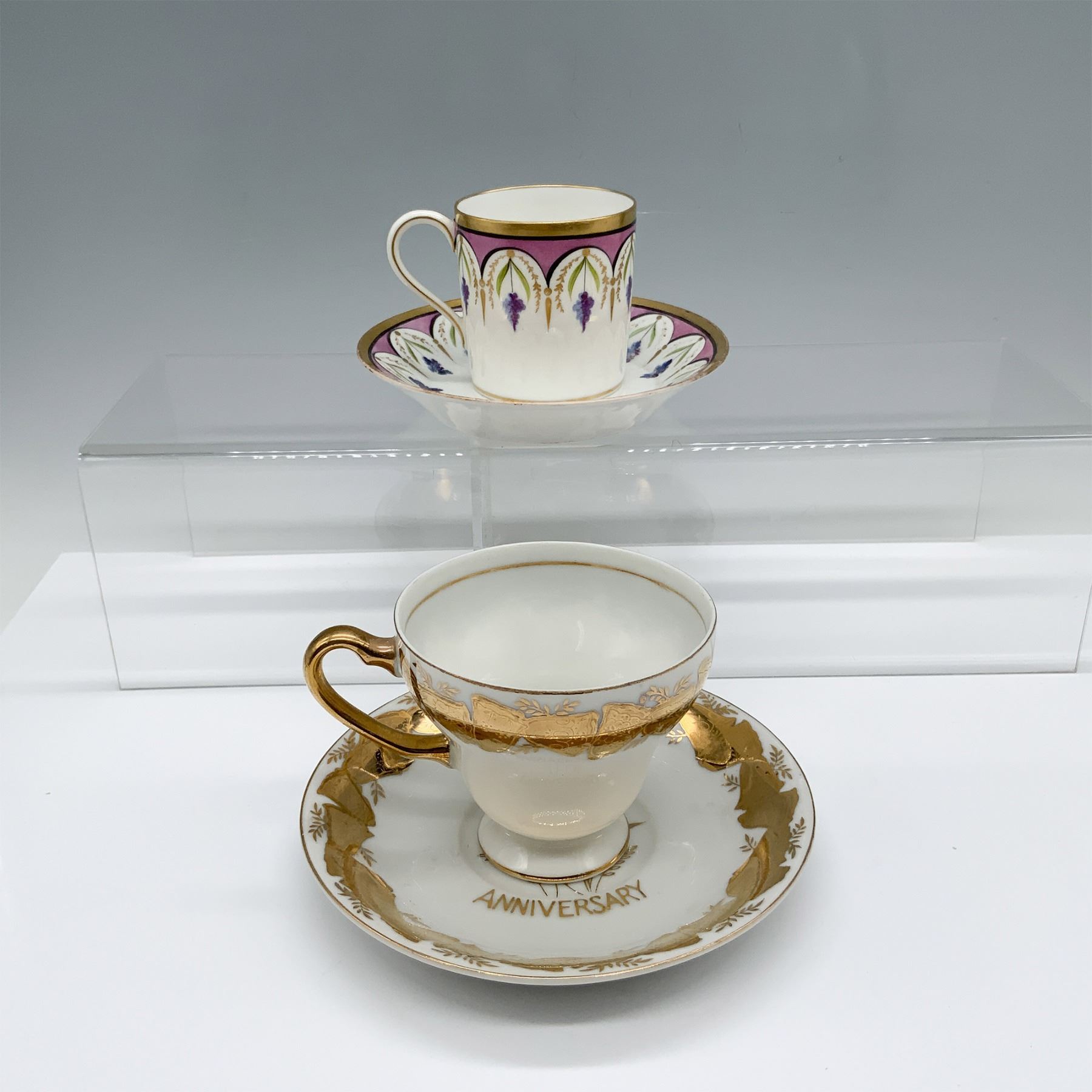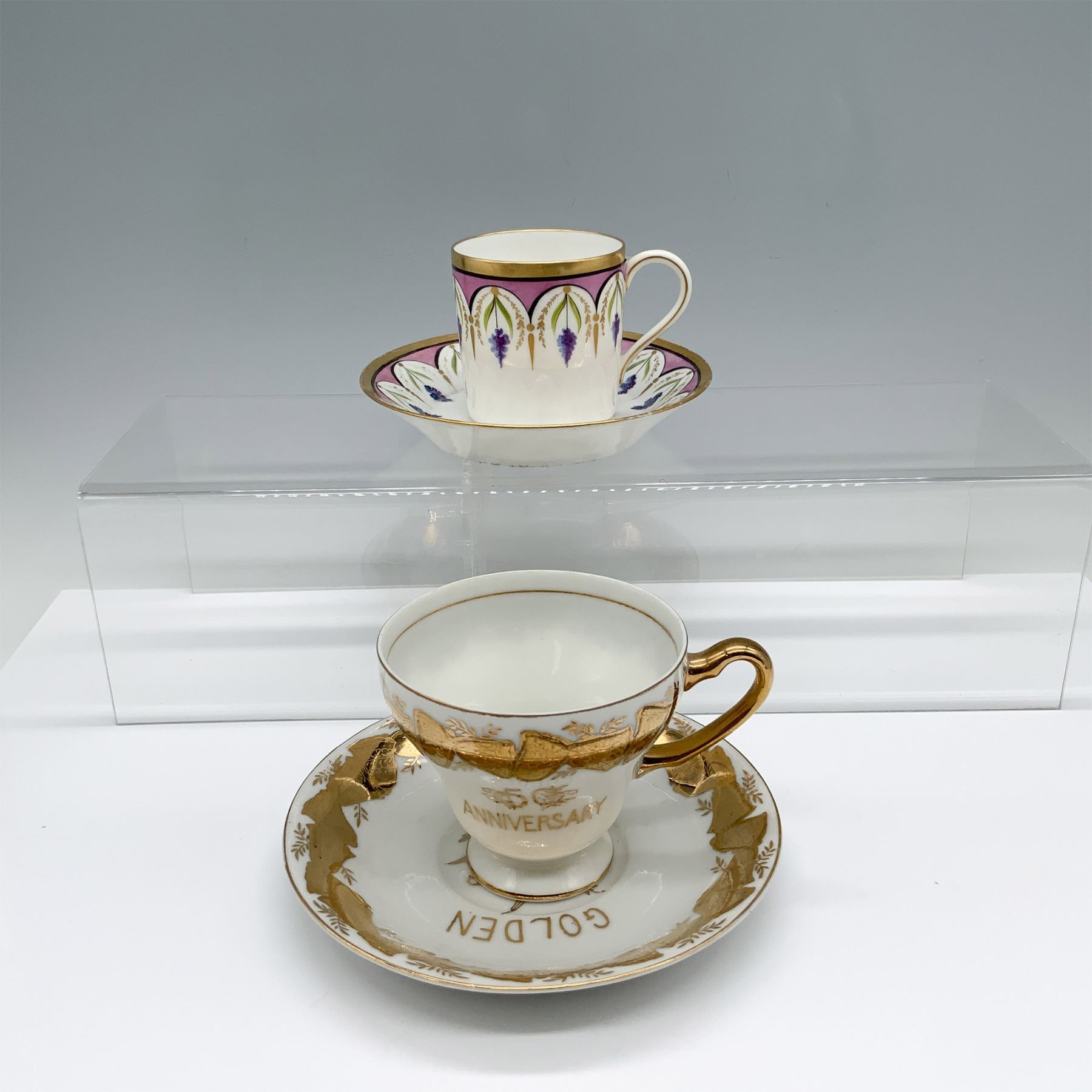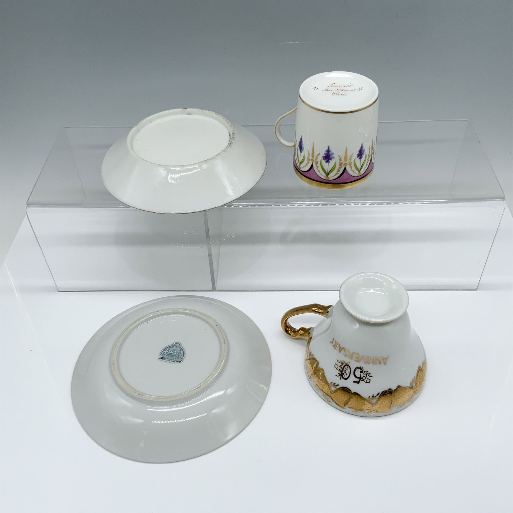 Beautiful duo of gilt cups that includes a tea cup and saucer set decorated with lilacs with a Paris backstamp, and a golden 50th anniversary tea cup and saucer set with a Japan sticker. Largest item measures 4.25"L x 3.25"W x 3"H.