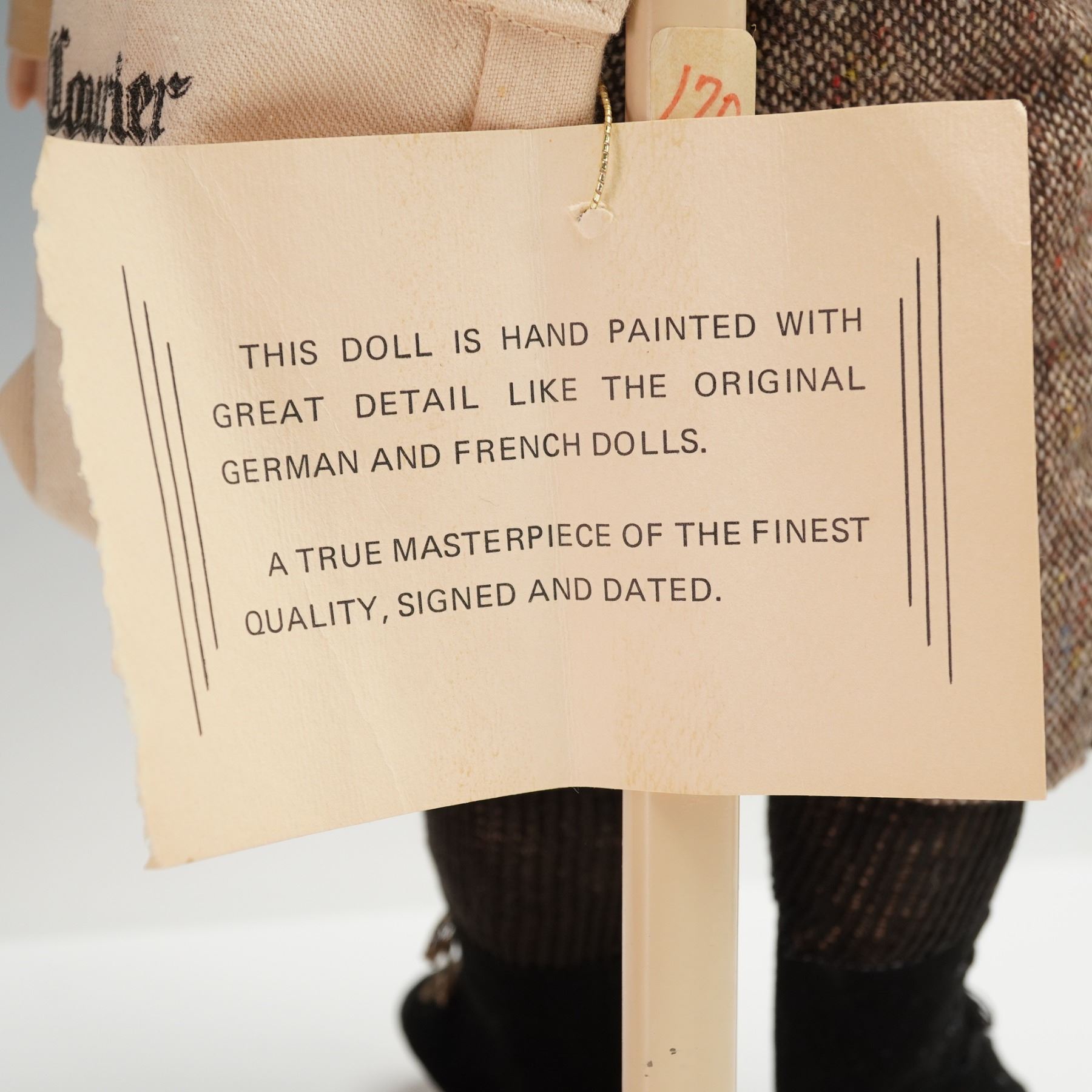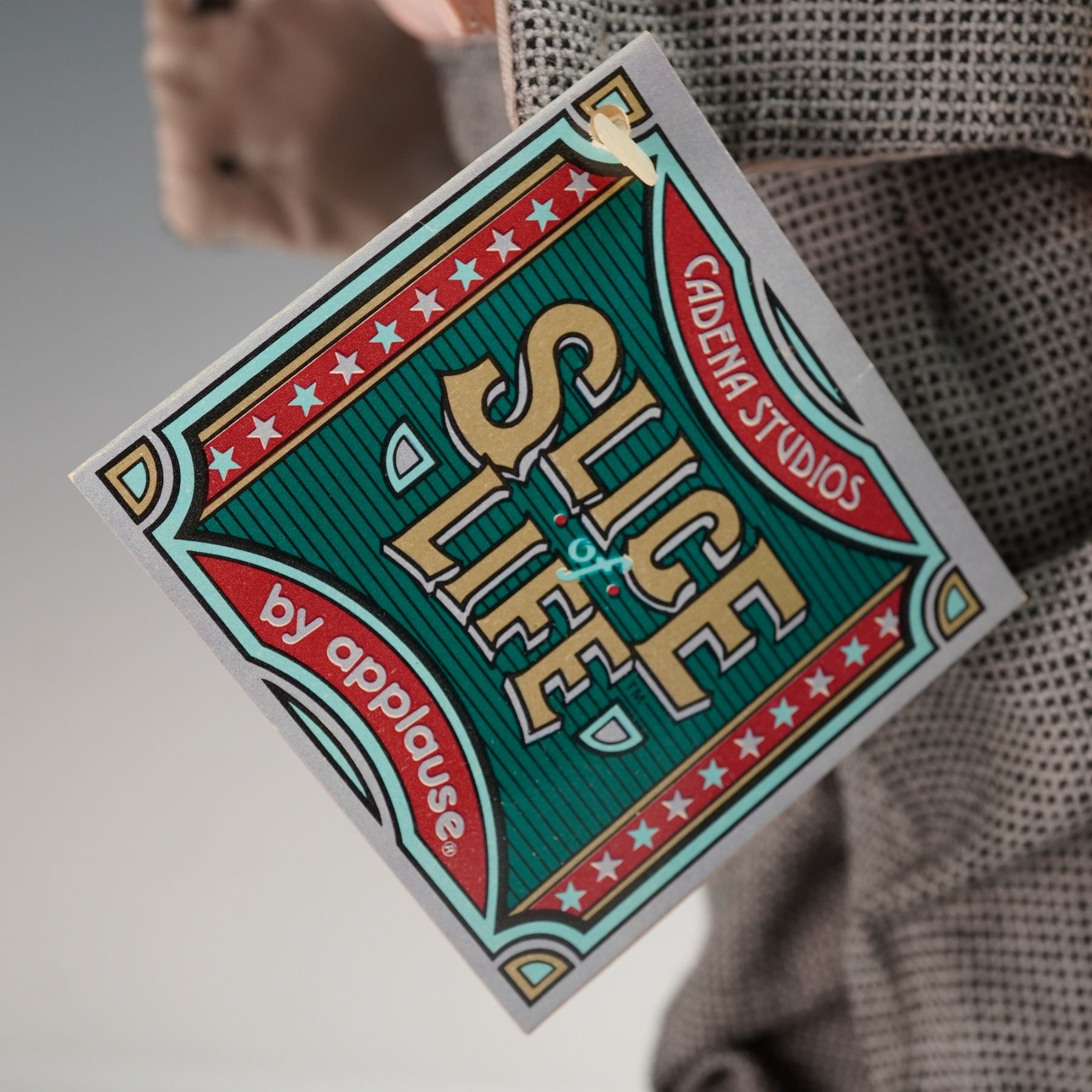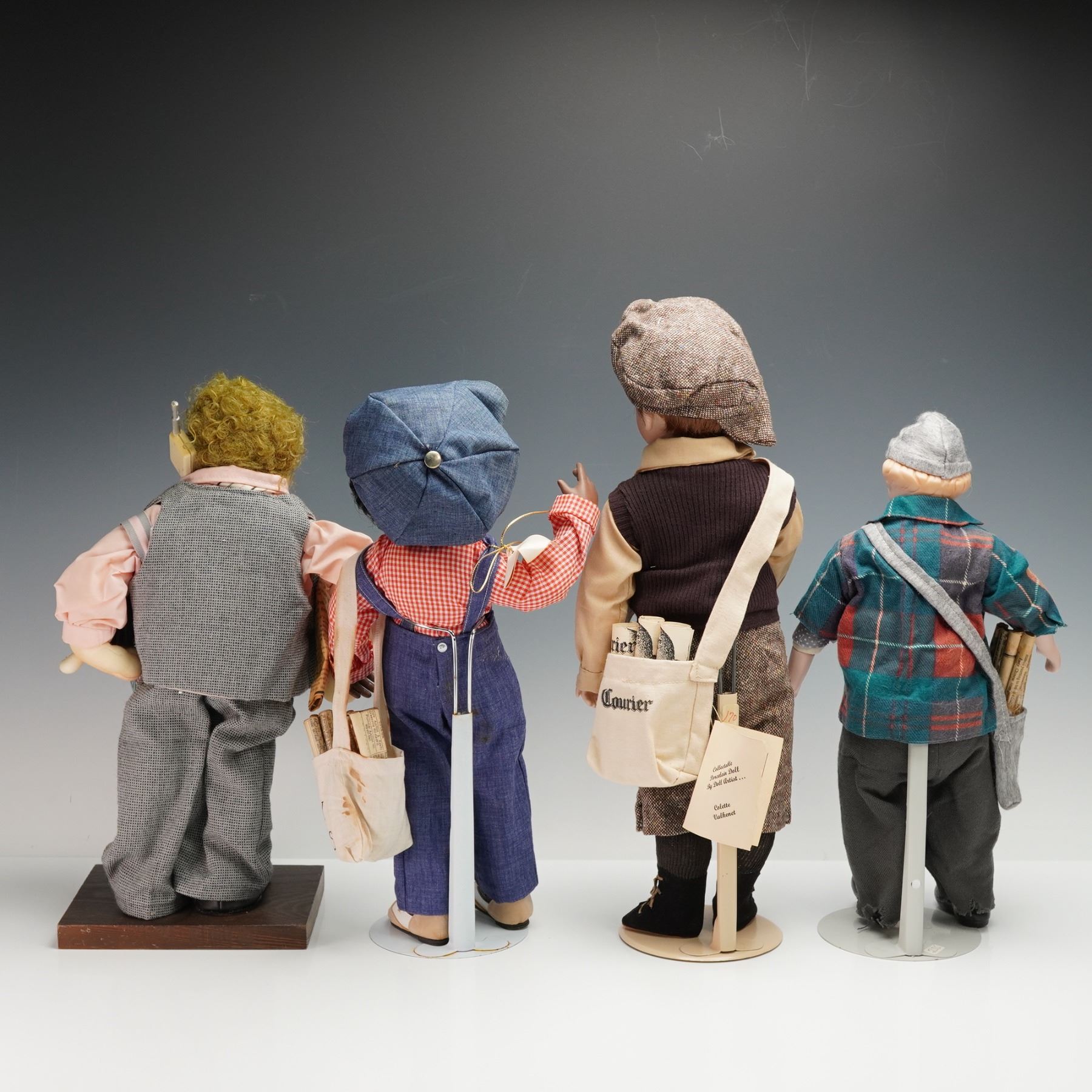 Four hand painted dolls from the Slice of Life collection by Cadena Studios for Applause, each crafted with detailed features and dressed in character-specific period attire. Figures include a newsboy with paper bag and cap, a worker in overalls, a character with vest and tie holding a bottle, and a painter or craftsman with tools in a shoulder bag. Each doll is mounted on a base, with attached maker tags and printed labels describing their craftsmanship as masterpieces inspired by original German and French dolls, signed and dated.
