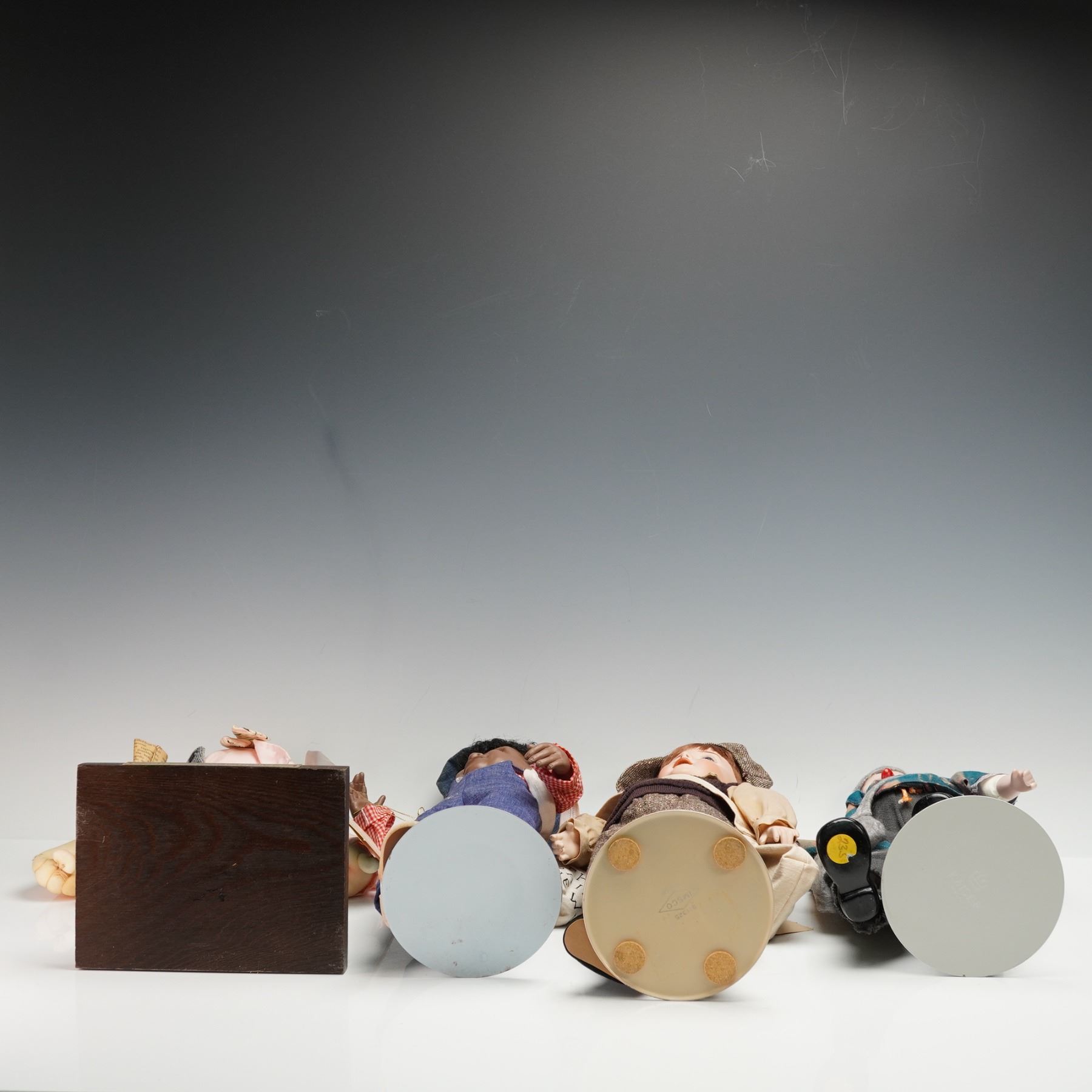 4pc Porcelain and Stuffed Newspaper Seller Dolls