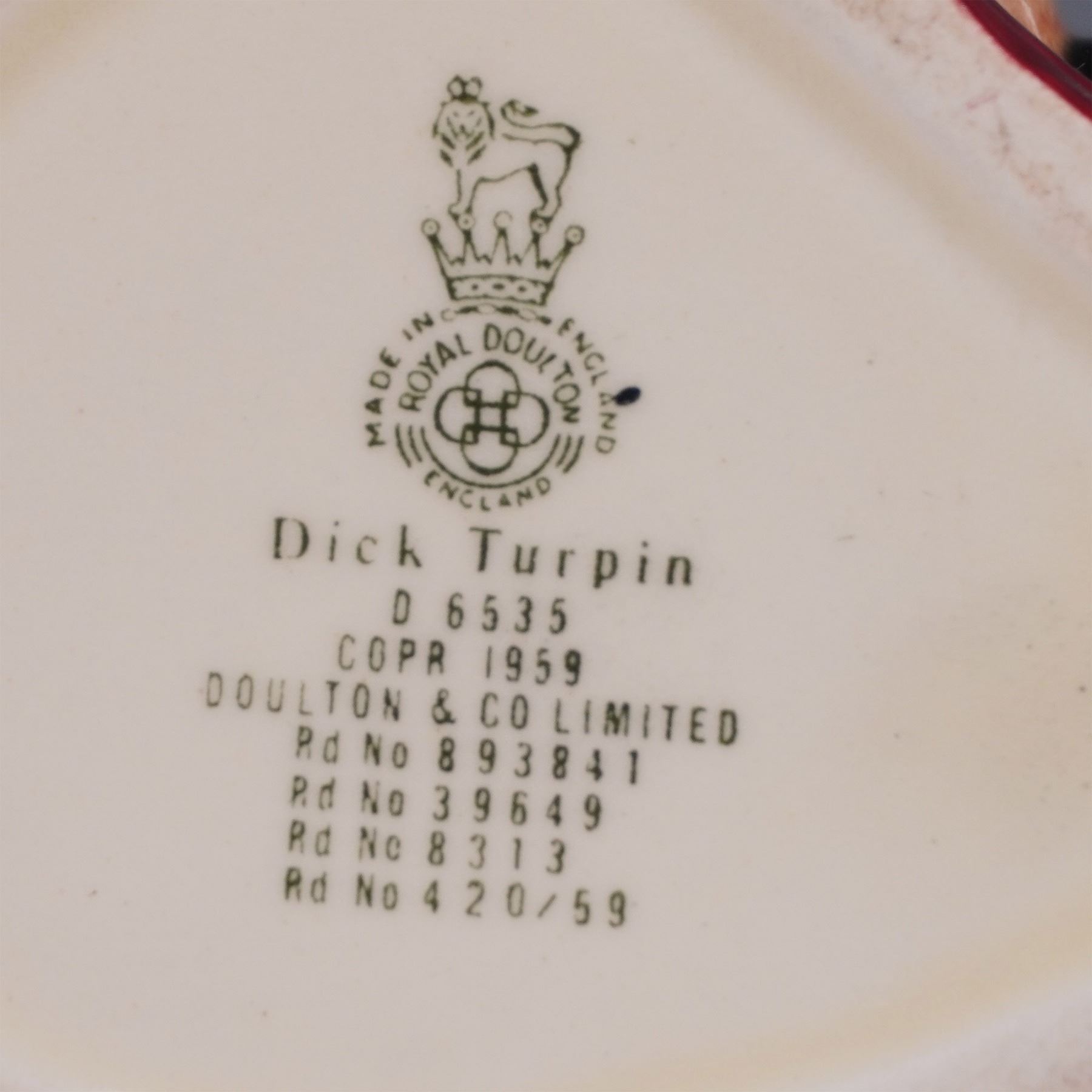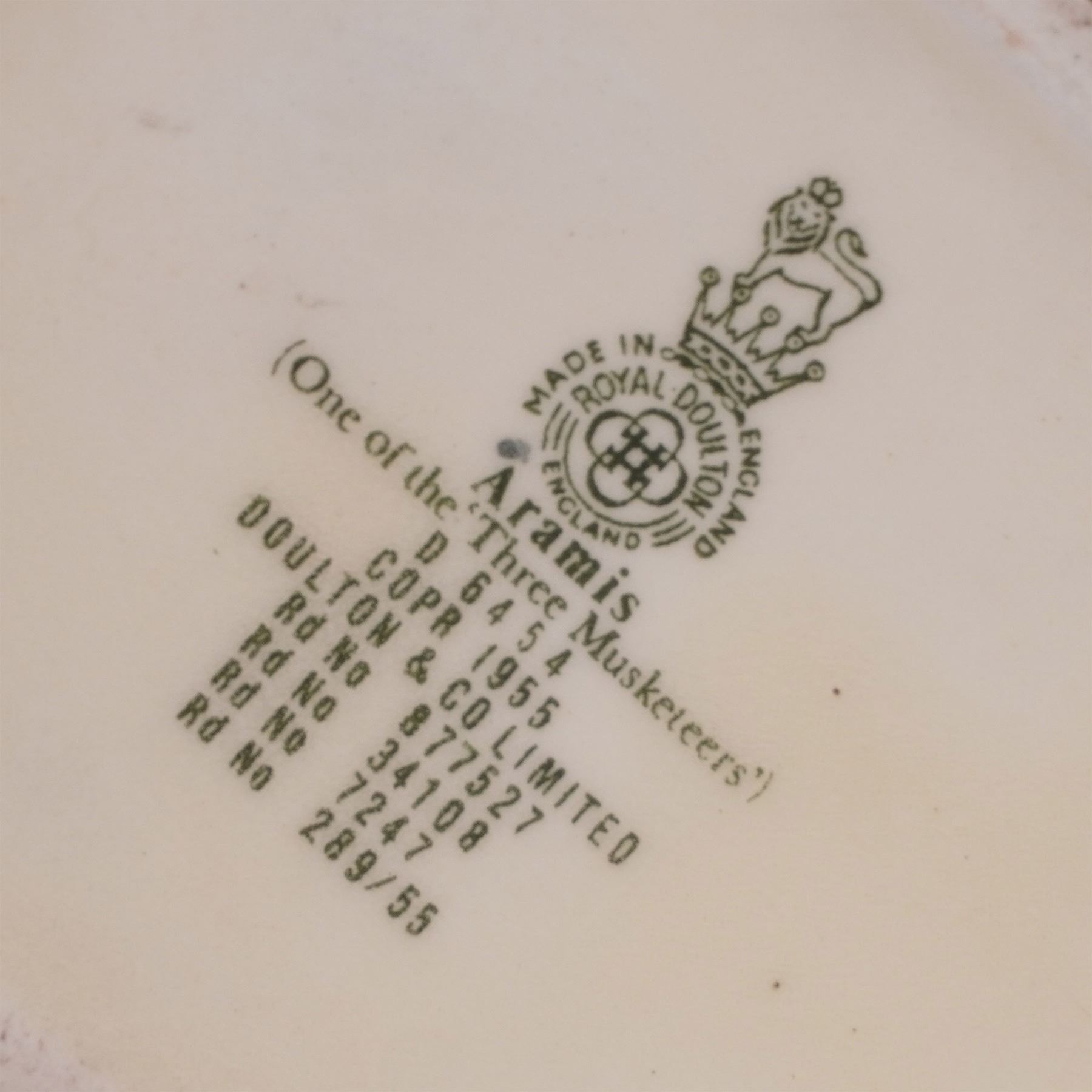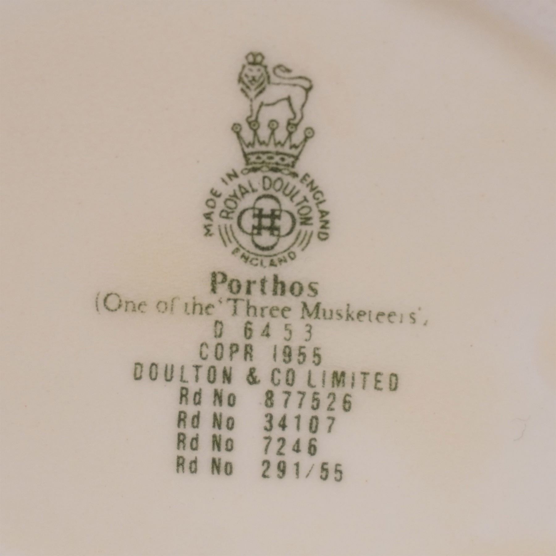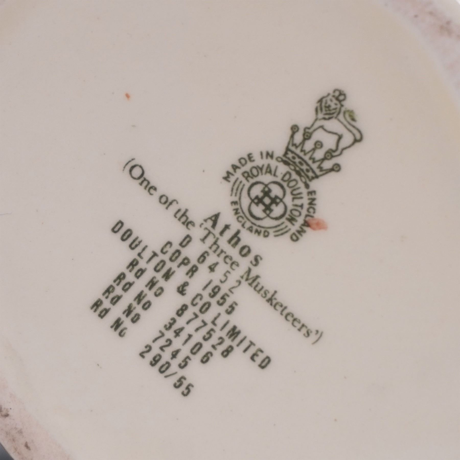Charming set of four Royal Doulton character jugs featuring iconic literary and historical figures. The trio of Athos (D6452), Aramis (D6454), and Porthos (D6453) pays tribute to The Three Musketeers, each inscribed “One of the ‘Three Musketeers’” and dated 1955. Also included is Dick Turpin (D6535), the legendary English highwayman, dated 1959. Made in England by Royal Doulton, these jugs display finely hand-painted features and distinctive sword-shaped handles. Each bears the Royal Doulton mark on the base. All measure approximately 4"H.