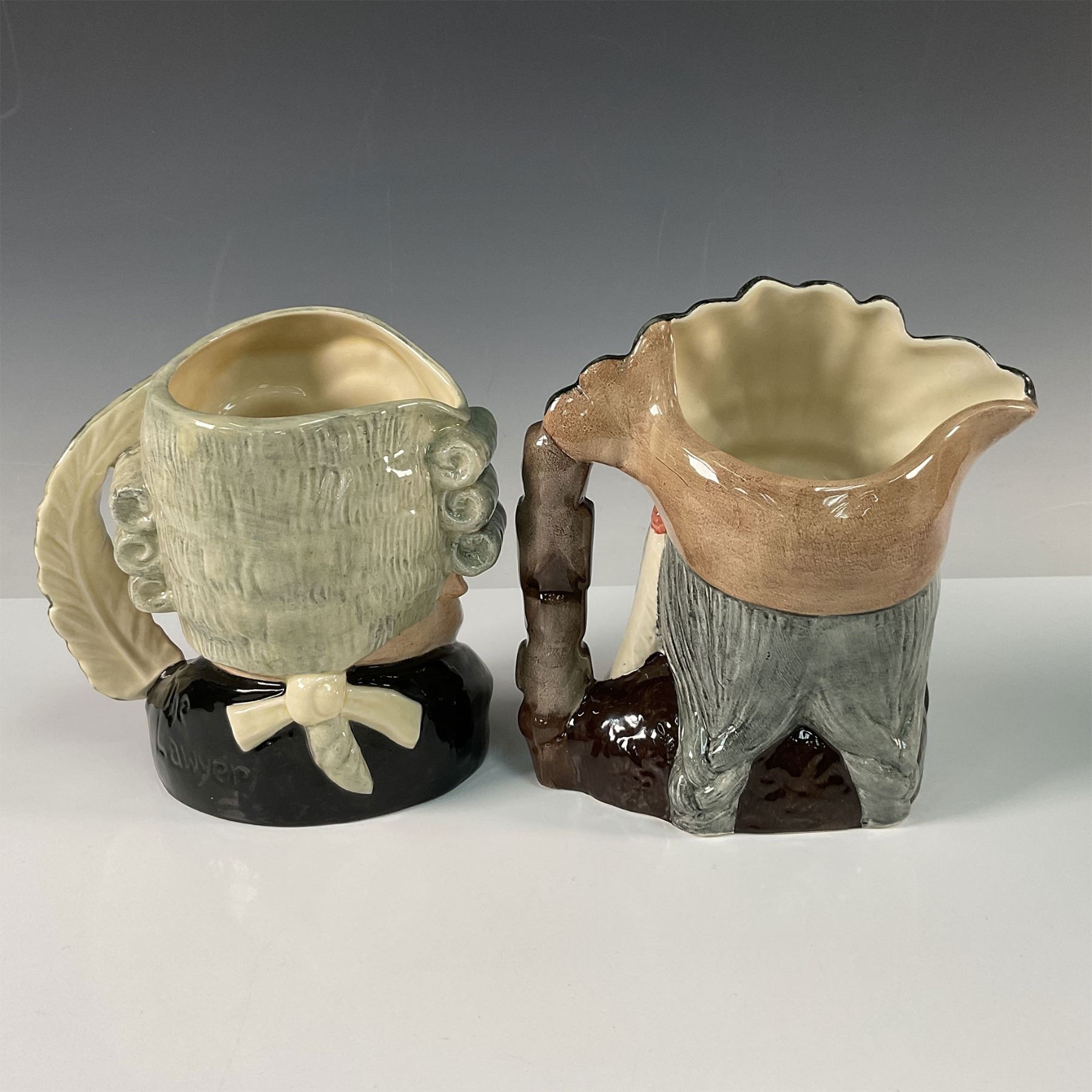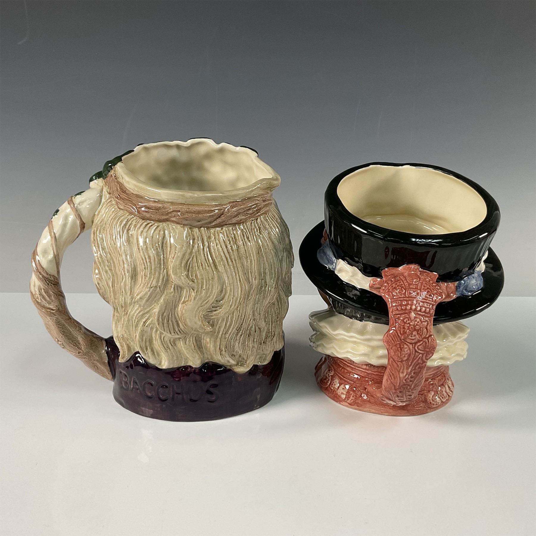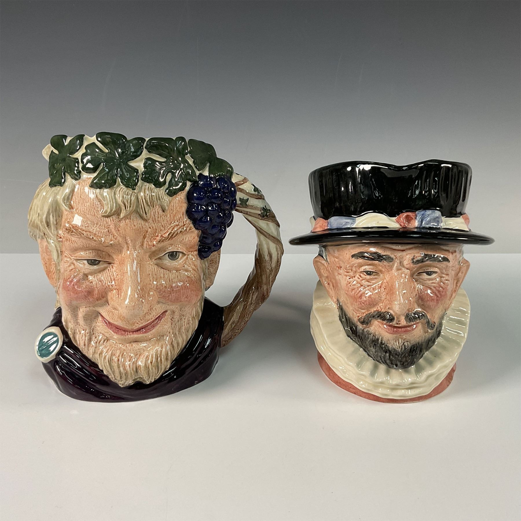 An exceptional collection of five Royal Doulton large character jugs, each showcasing intricate hand painted details and remarkable craftsmanship. These highly collectible pieces feature iconic figures from various cultural and historical backgrounds. 'Bacchus', representing the Roman god of wine, Bacchus is adorned with a grapevine motif, showcasing a whimsical design that celebrates the joy of wine and revelry. 'Beefeater', depicting the iconic Yeoman Warder of the Tower of London, this jug is complete with traditional attire and vivid details, symbolizing a quintessential figure in British history. 'The Lawyer', a classic portrayal of a barrister, featuring a powdered wig and a feather quill handle. 'North American Indian', this jug honors Native American heritage with a detailed feathered headdress and a totem pole handle, reflecting respect for cultural traditions. All stamped with the Royal Doulton backstamp to ensure authenticity. Bacchus (D6499): 7"H; c. 1959-1991; Max Henk. Beefeater (D6206): 6.5"H; c. 1947-1986; Harry Fenton. The Lawyer (D6498): 7"H; c. 1959-1996; Max Henk. North American Indian (D6611): 7.75"H; c. 1967-1991; Max Henk.