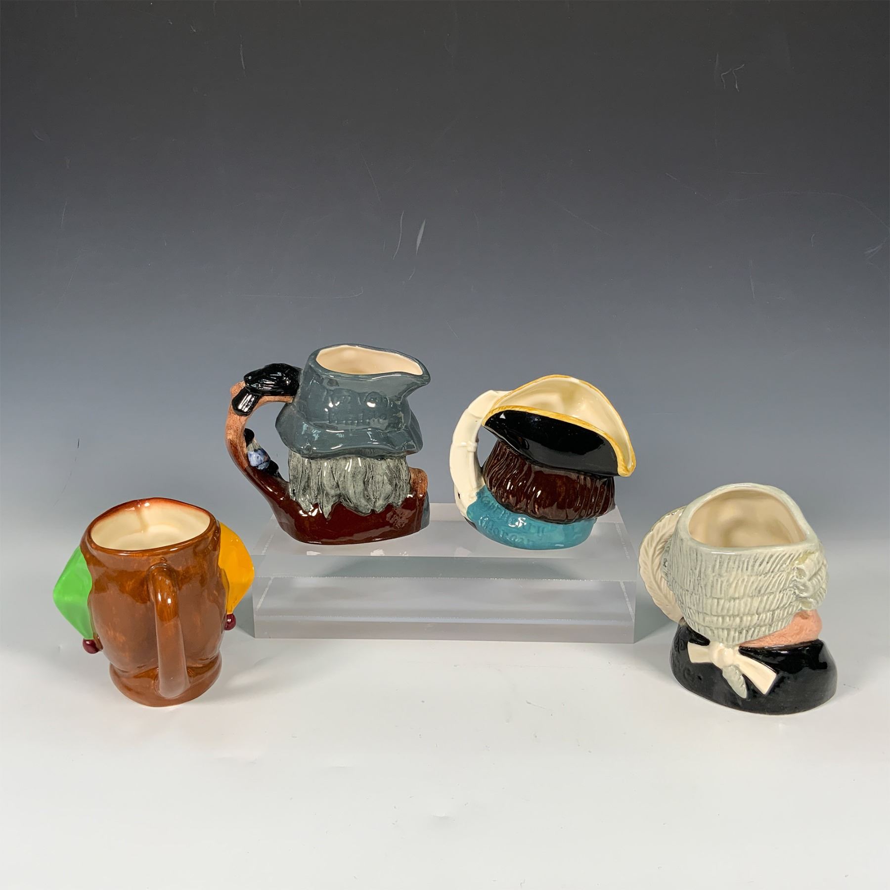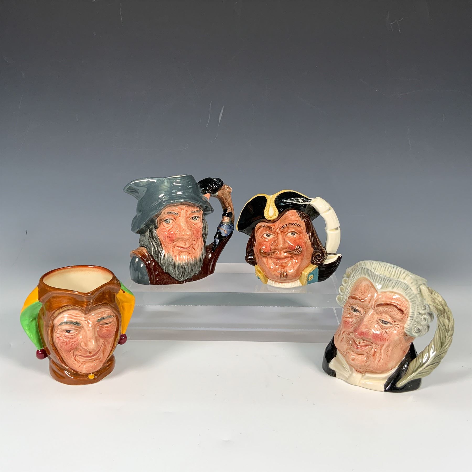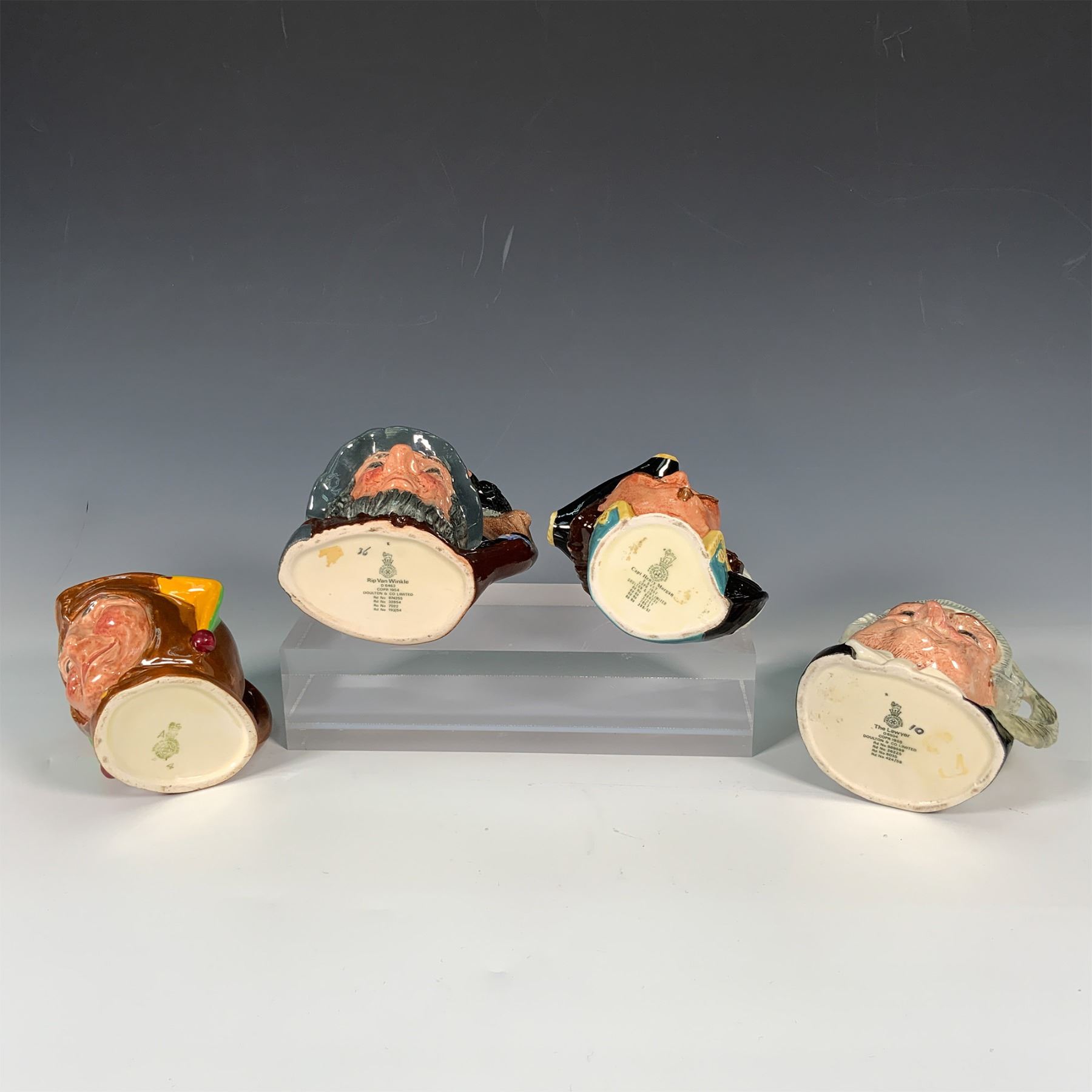 This lot features four Royal Doulton character jugs, including The Lawyer (D6504) from 1958, Rip Van Winkle (D6463) from 1954, Captain Henry Morgan (D6469) from 1957, and a Jester Jug, all stamped with Royal Doulton backstamps. Crafted in England with vibrant hand-painted details, these mid-20th-century pieces exemplify the brand's celebrated artistry and attention to detail, making them ideal for collectors of classic English pottery.