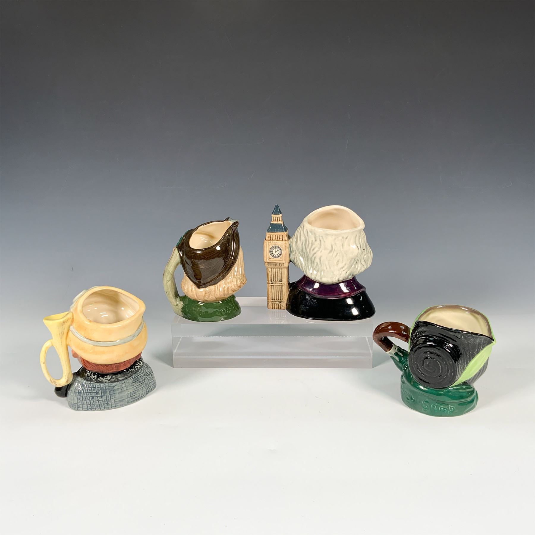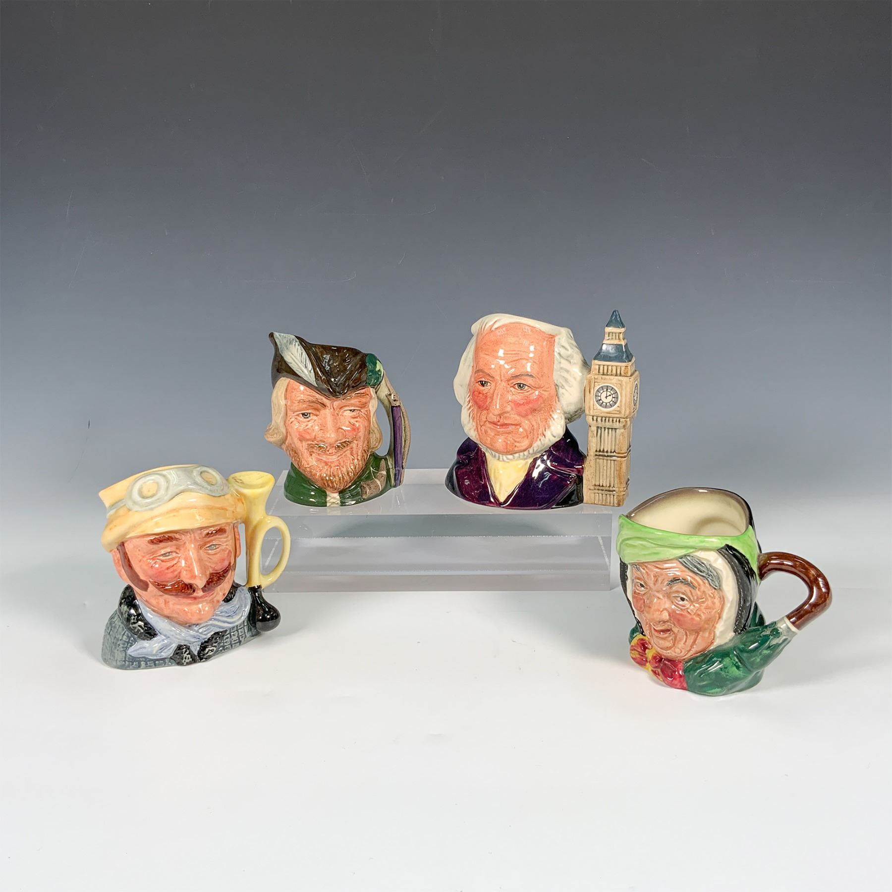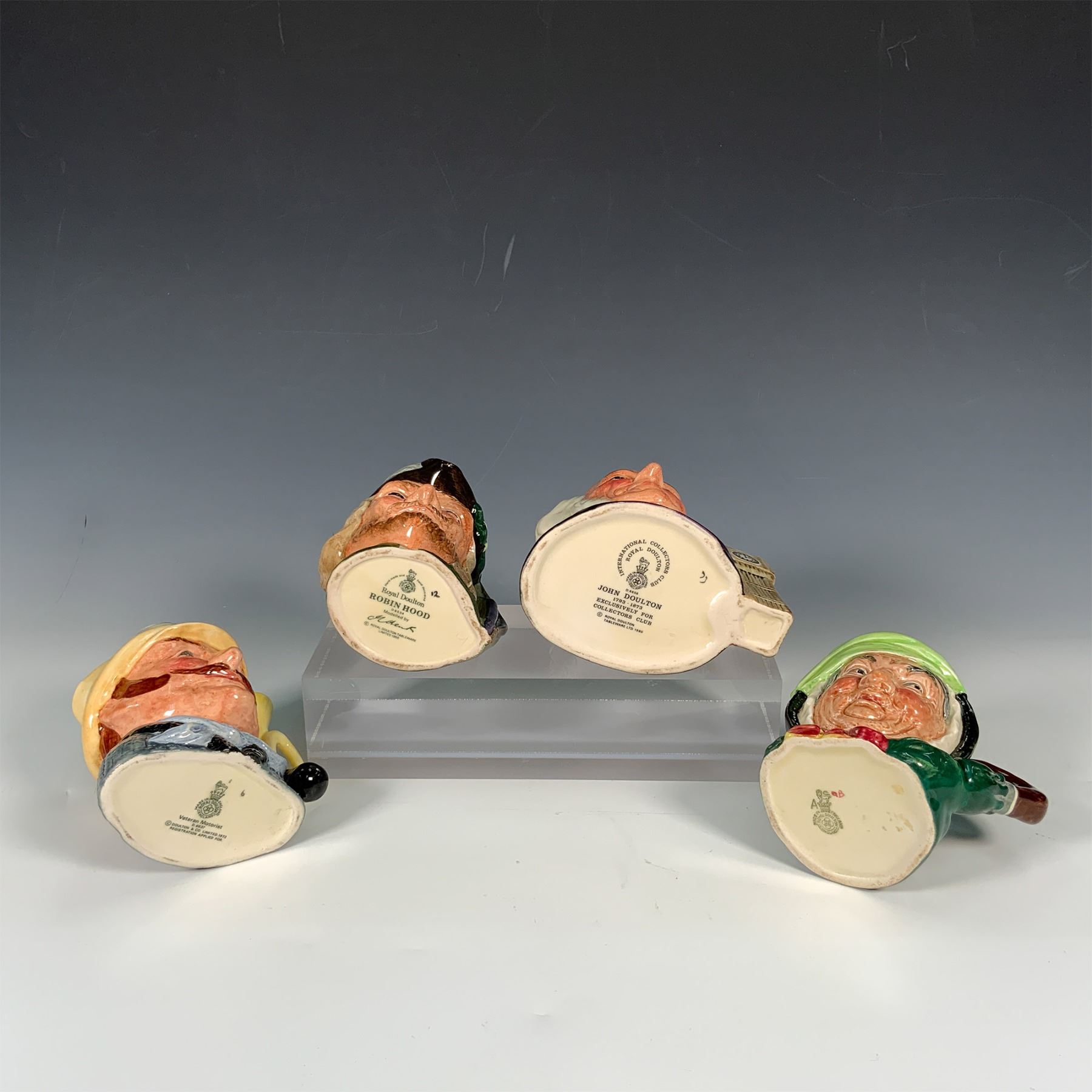 A collection of four Royal Doulton character jugs featuring Veteran Motorist D6637 (1972), Robin Hood D6534 (1959), John Doulton D6656 (1980, International Collectors Club exclusive), and Sairey Gamp. Each piece is hand-decorated with visible backstamps confirming authenticity. These charming jugs highlight Royal Doulton's legacy of ceramic artistry. Dates range from 1959 to 1980.