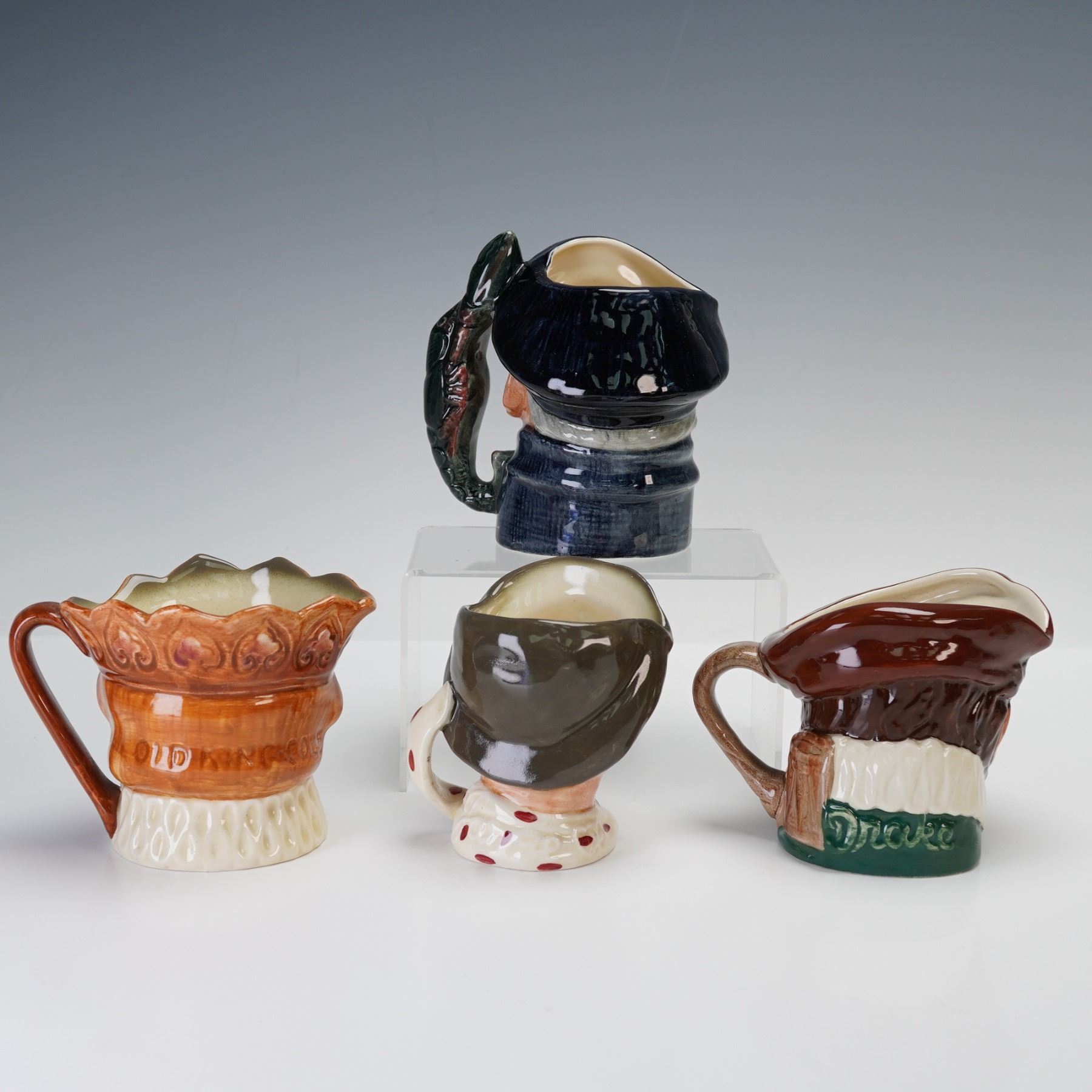 This set of four Royal Doulton small character jugs includes Jarge D6295, Old King Cole D6037, Drake D6174, and Lobster Man D6620. Each jug features lively expressions and rich coloration that bring out the personality of each character, from the cheerful fisherman with his lobster handle to the regal Old King Cole with his ornate crown rim. The glazes range from deep navy and forest green to warm amber and russet tones, all with a glossy finish that enhances the sculptural detail. Lobster Man marked D6620. Royal Doulton backstamp.