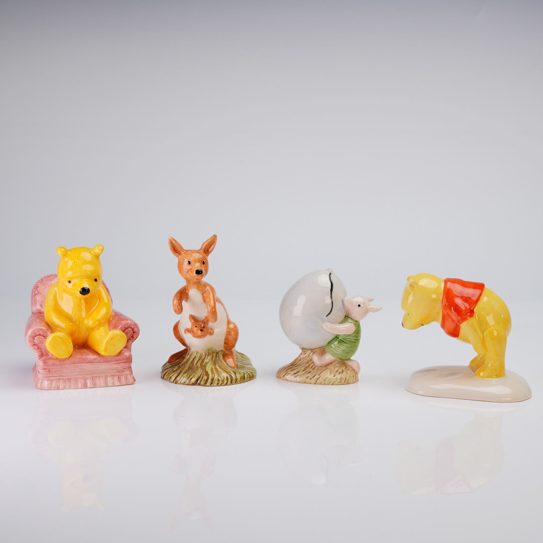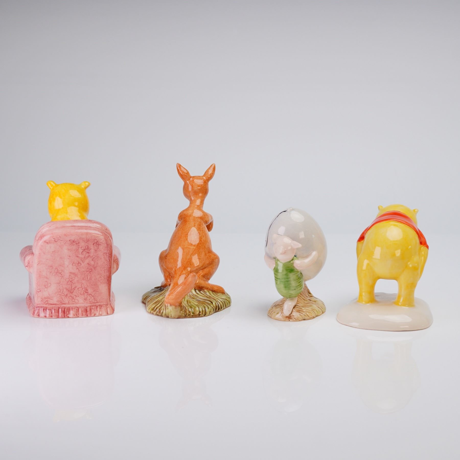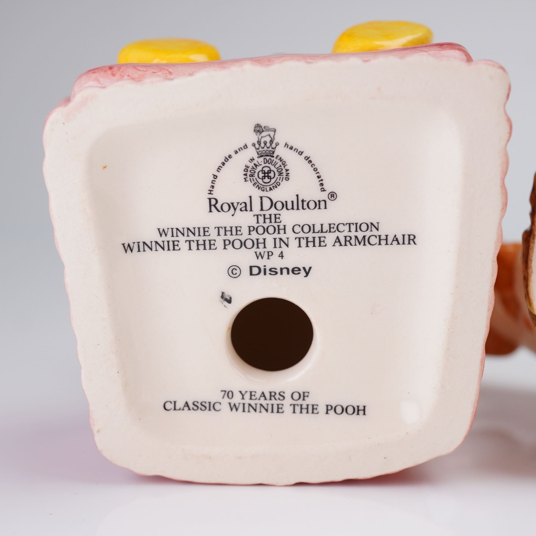 These pieces commemorate the 70 YEARS OF CLASSIC WINNIE THE POOH, suggesting a 1996 production date. The collection includes four distinct scenes: Pooh in an Armchair (WP 4), Kanga and Roo (WP 6), Piglet and the Balloon (WP 5), and Pooh and the Paw Marks (WP 3). Each figurine features vibrant colors and a glossy glaze finish, resting on either naturalistic or flat bases. The underside of each item is marked with the impressed Royal Doulton backstamp, MADE IN ENGLAND, and copyright text Disney.