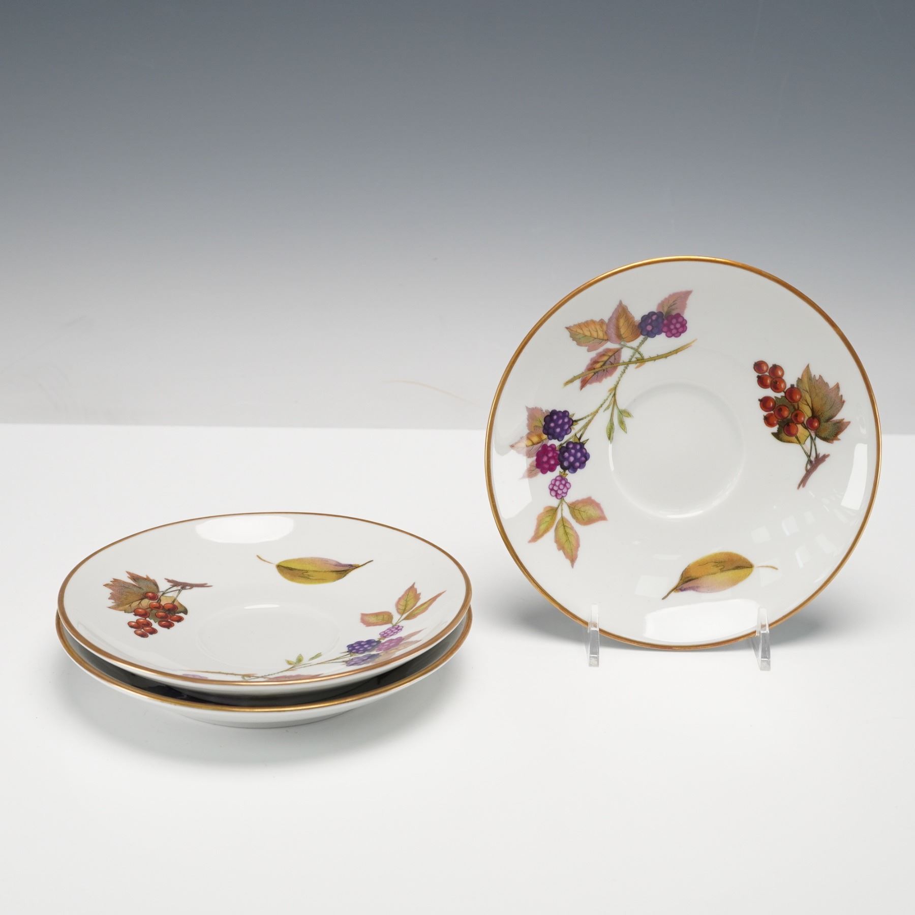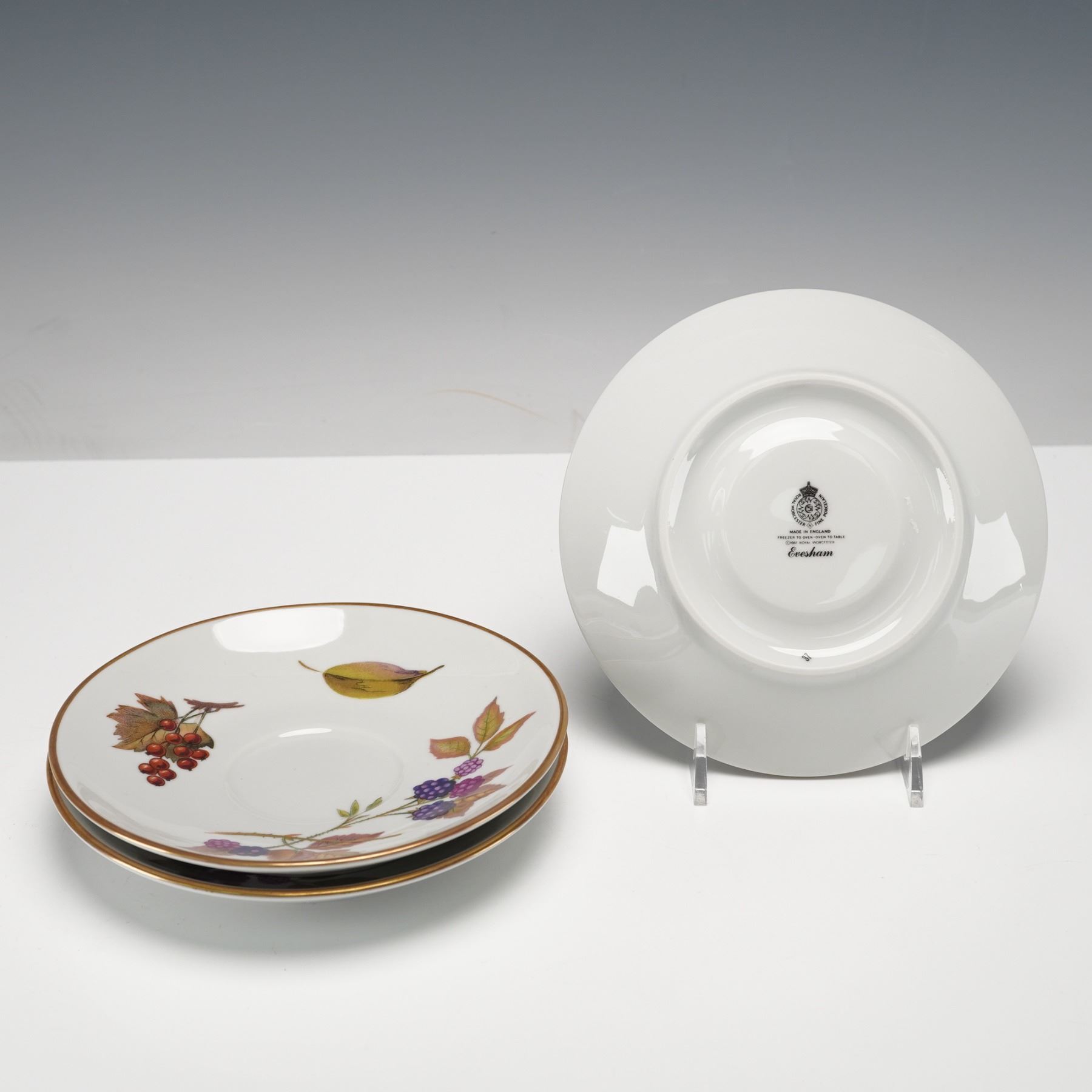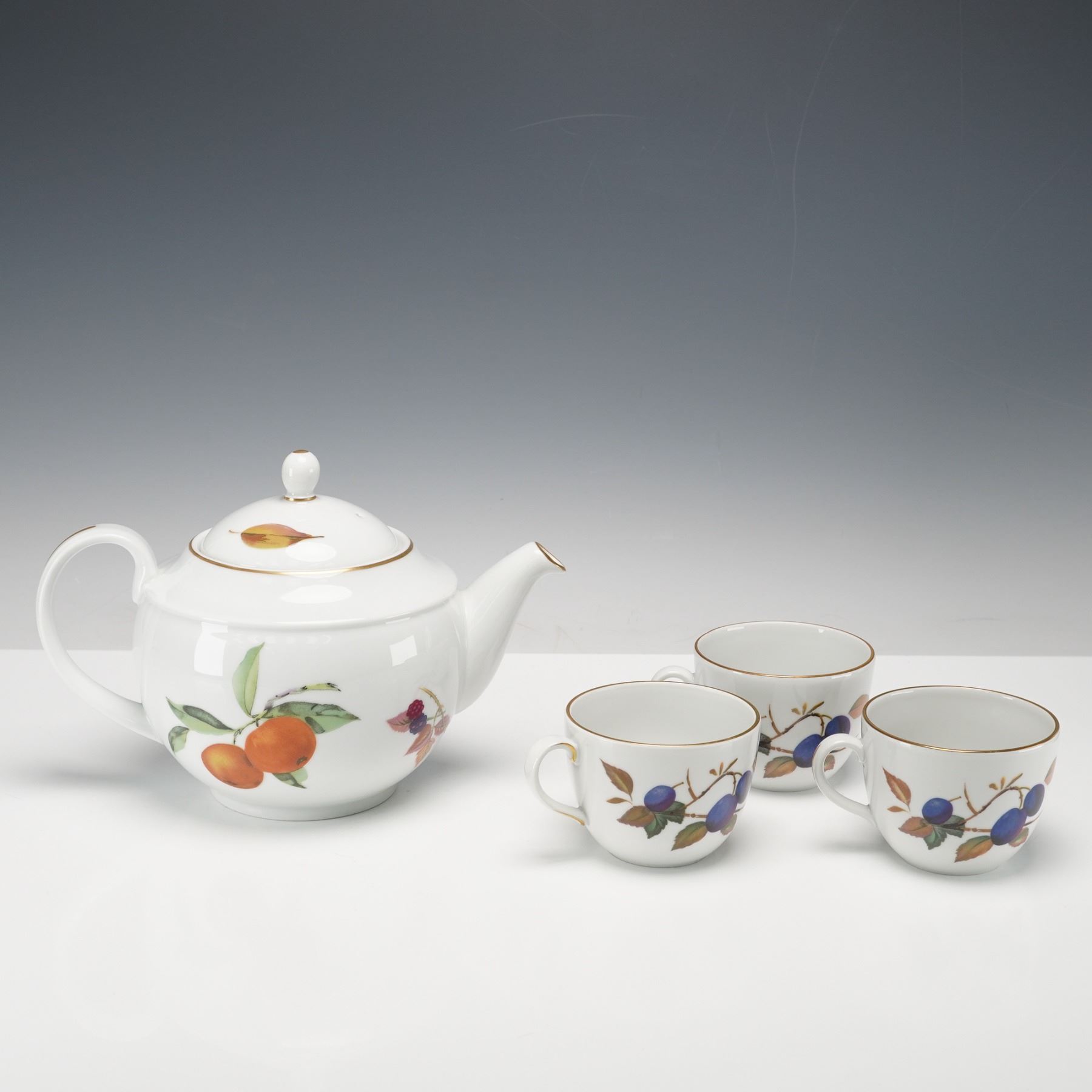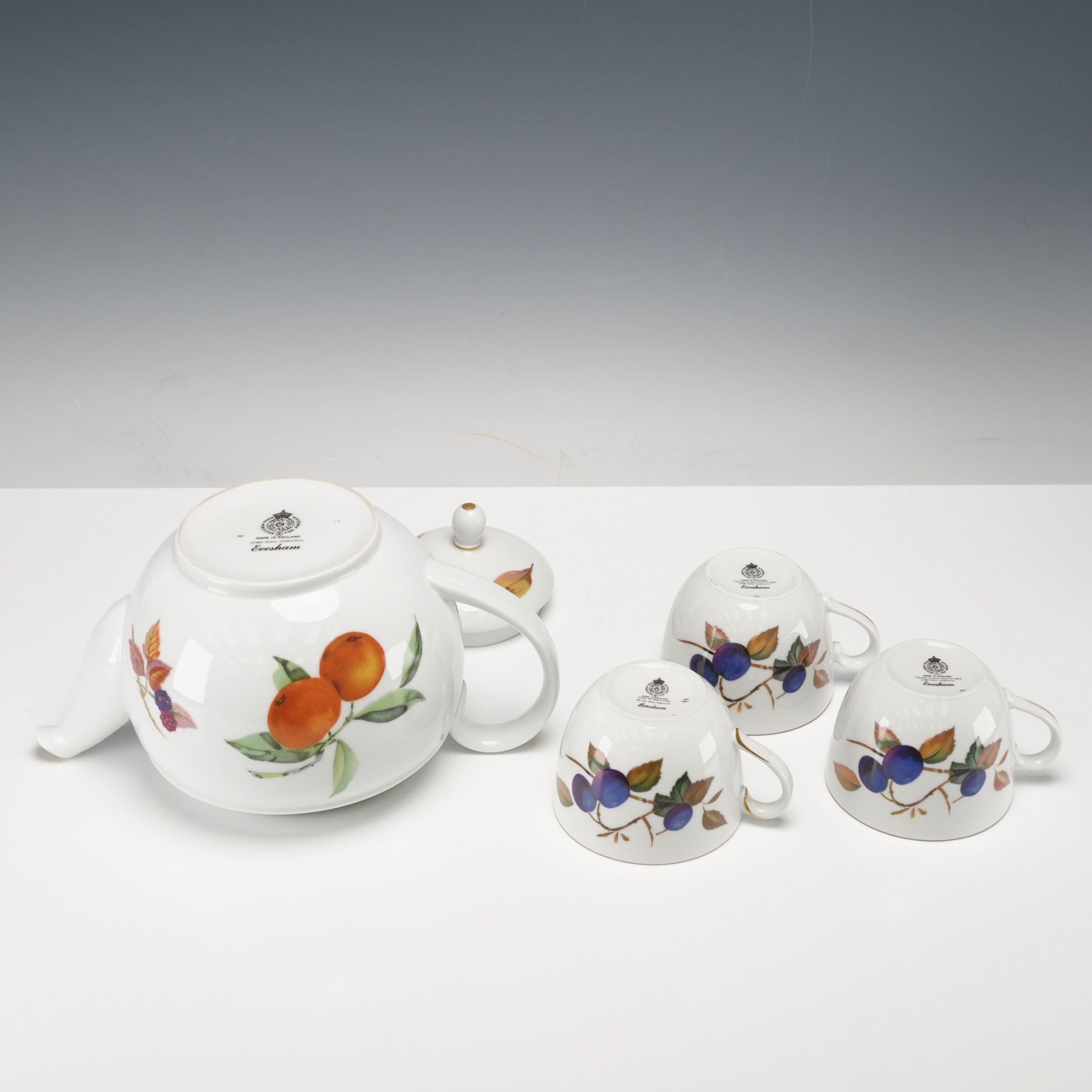 A four-piece set totaling eight items comprising three cup and saucer sets and one teapot with lid. Each piece features assorted fruit still-life motifs on a white ground with gold trim. All items bear the Royal Worcester Fine Porcelain Evesham backstamp.