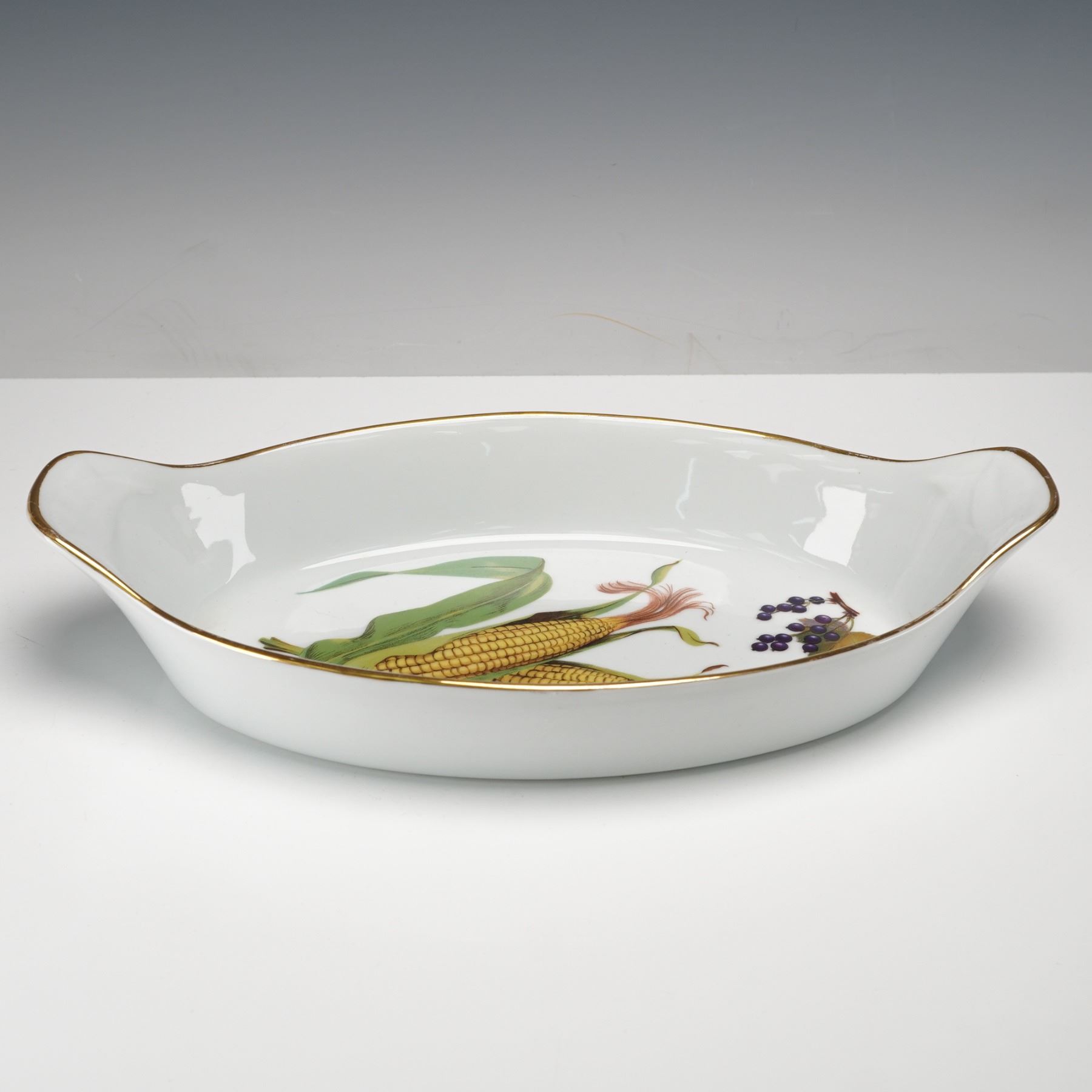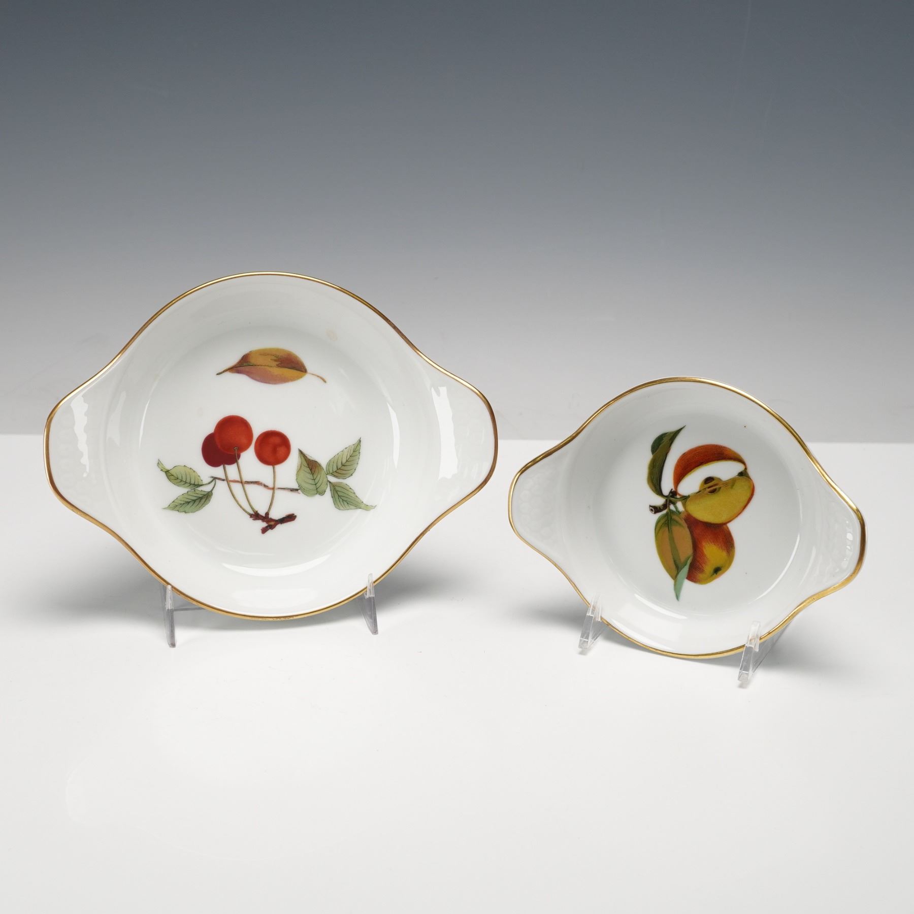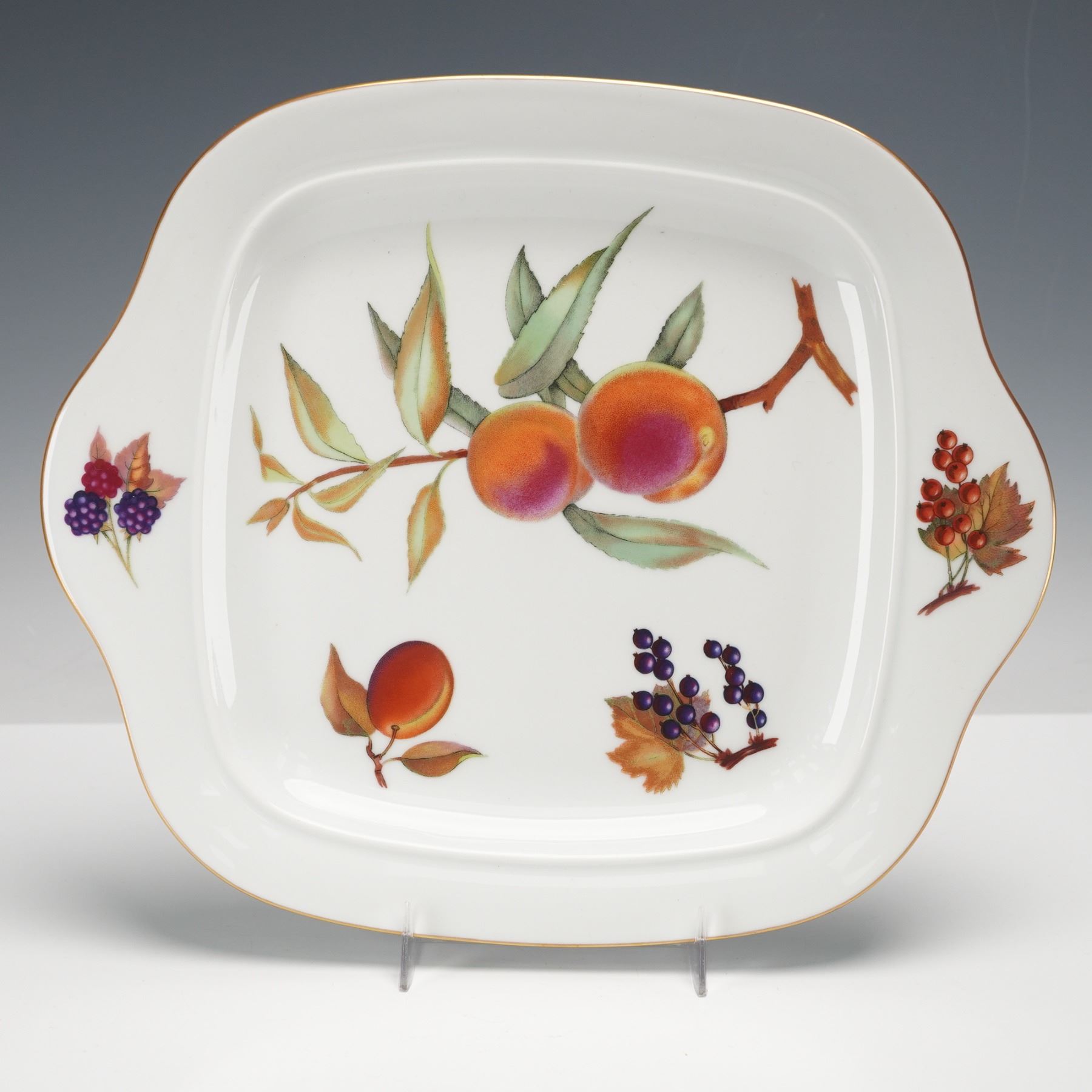 A four-piece collection including one oval fish dish, two round eared egg dishes in different sizes, and one square handled cake plate. Each piece decorated with assorted fruit motifs on a white ground with gold trim. All items bear the Royal Worcester Fine Porcelain Evesham backstamp.