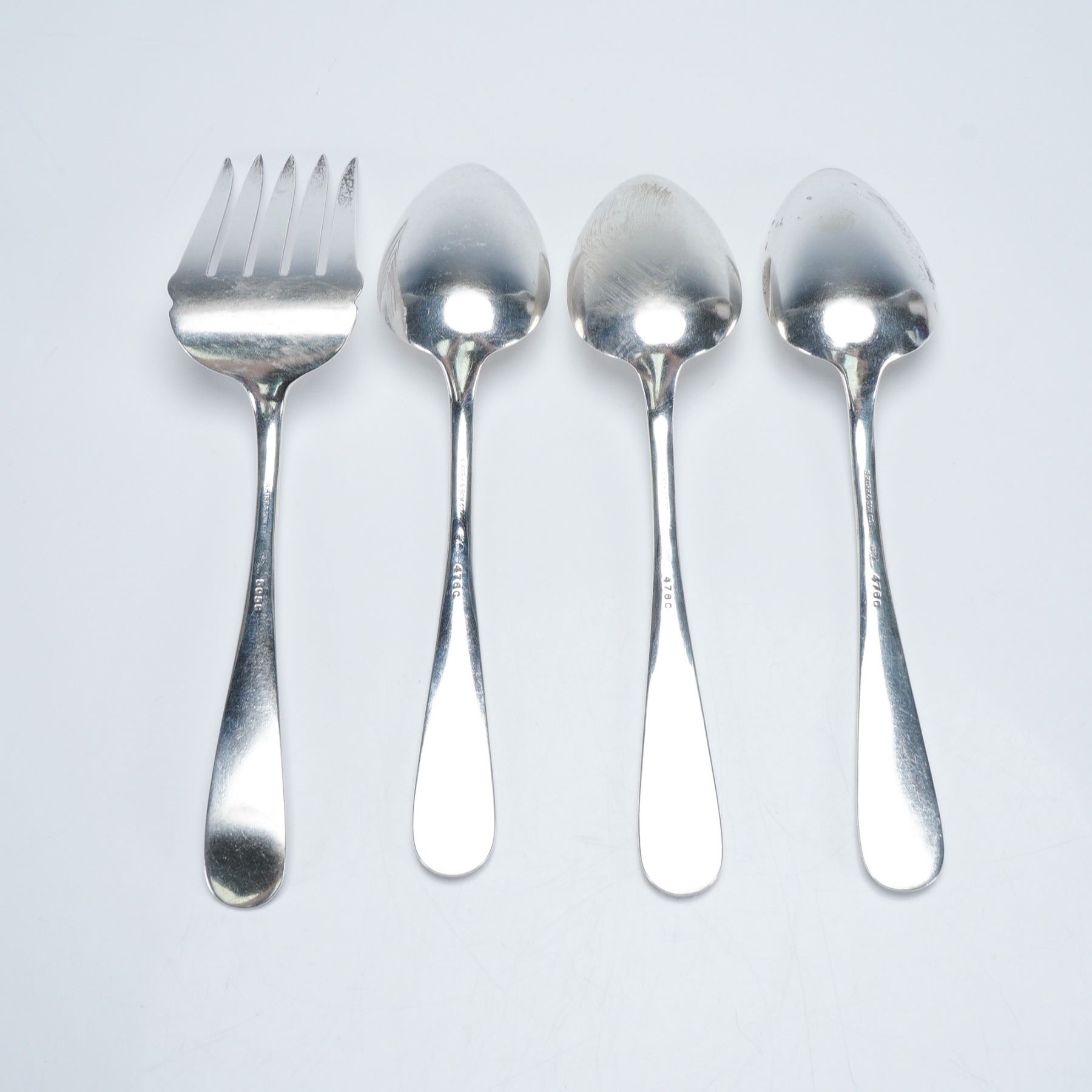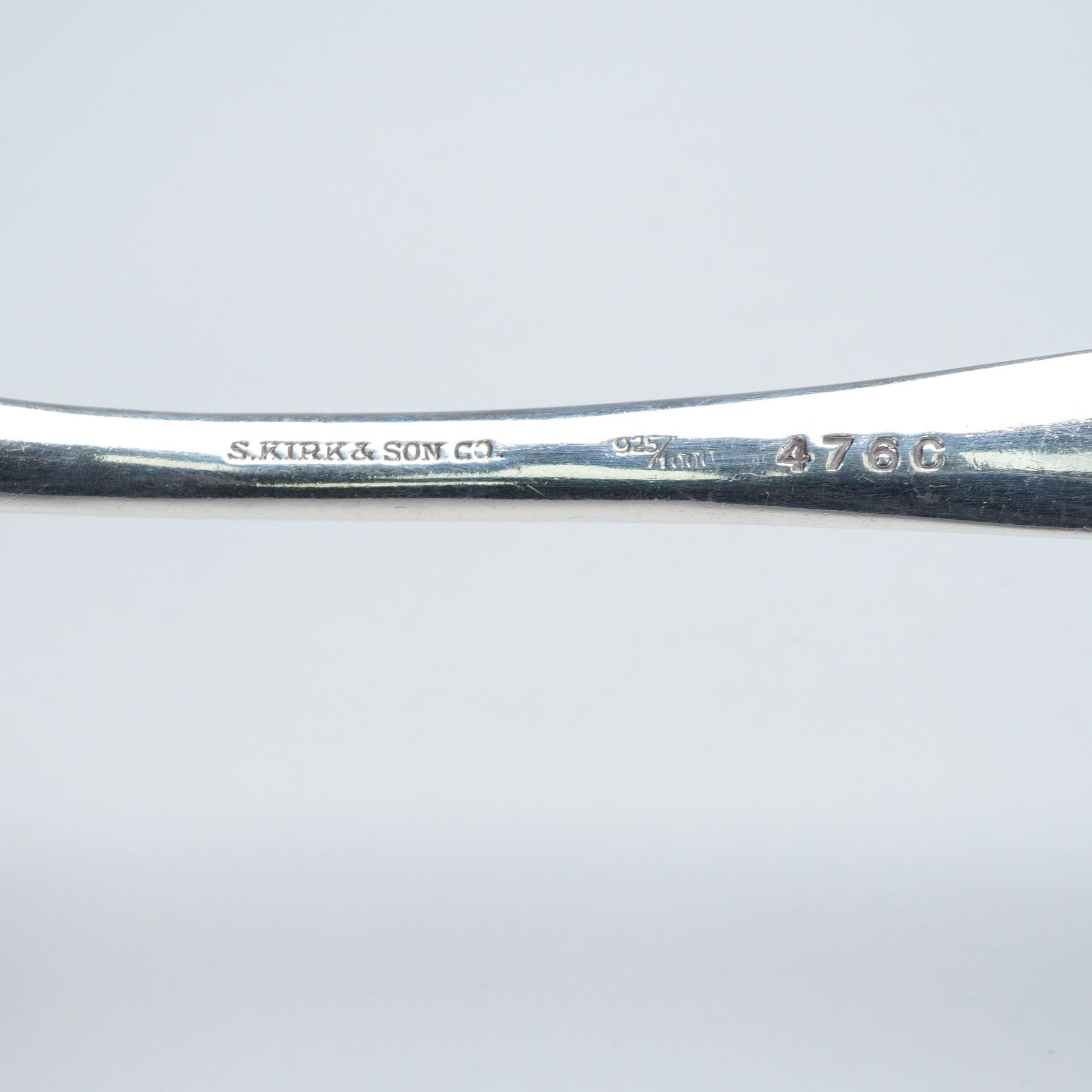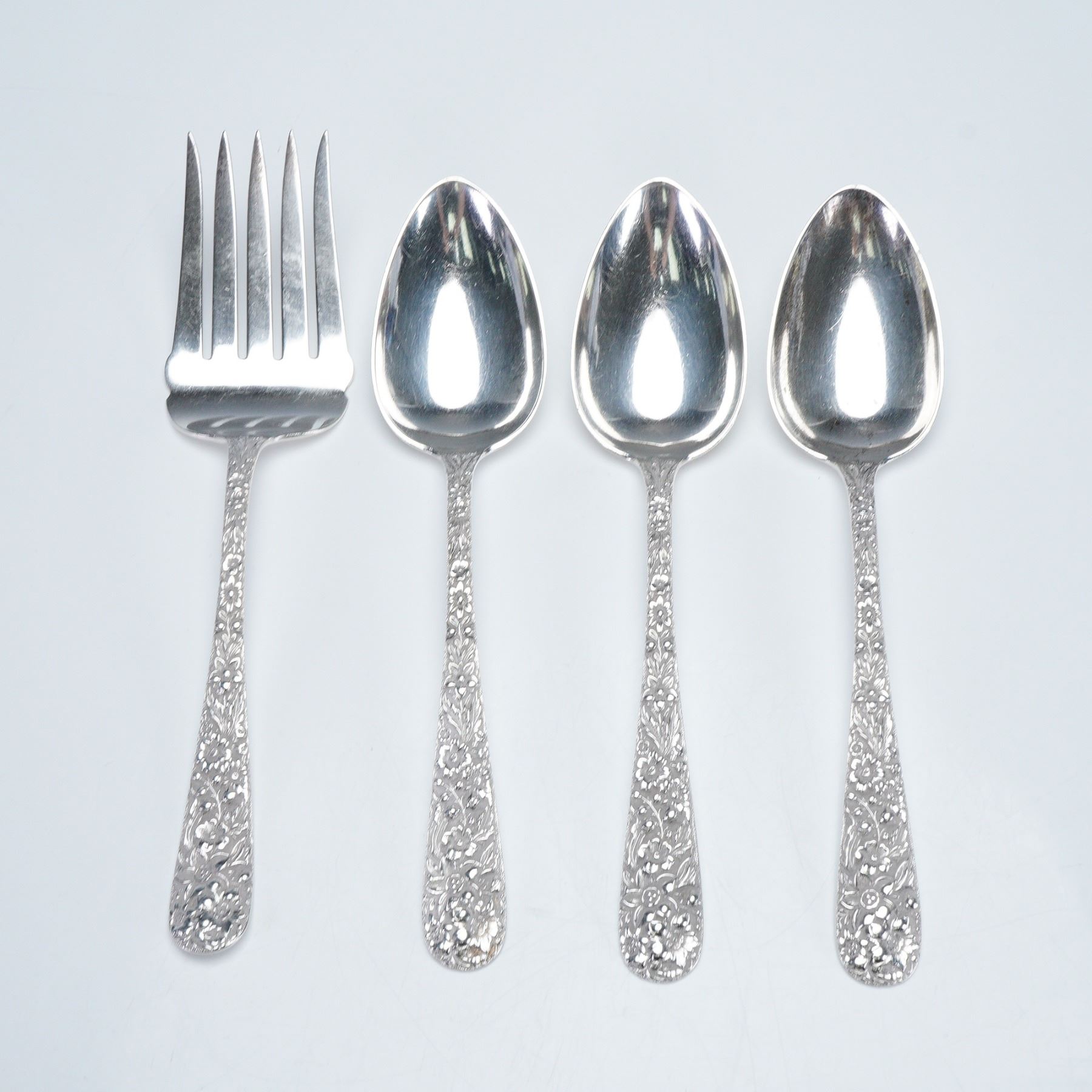 Fine set of four sterling silver serving utensils in the Repousse pattern, featuring richly detailed floral and foliate motifs in high relief along the handles. The set includes three serving spoons and one serving fork, all marked S. Kirk & Son Co., Sterling, 925/1000, 476C. This pattern, first introduced in 1846, remains one of the most celebrated and enduring designs in American silver craftsmanship. Net silver weight 292g.