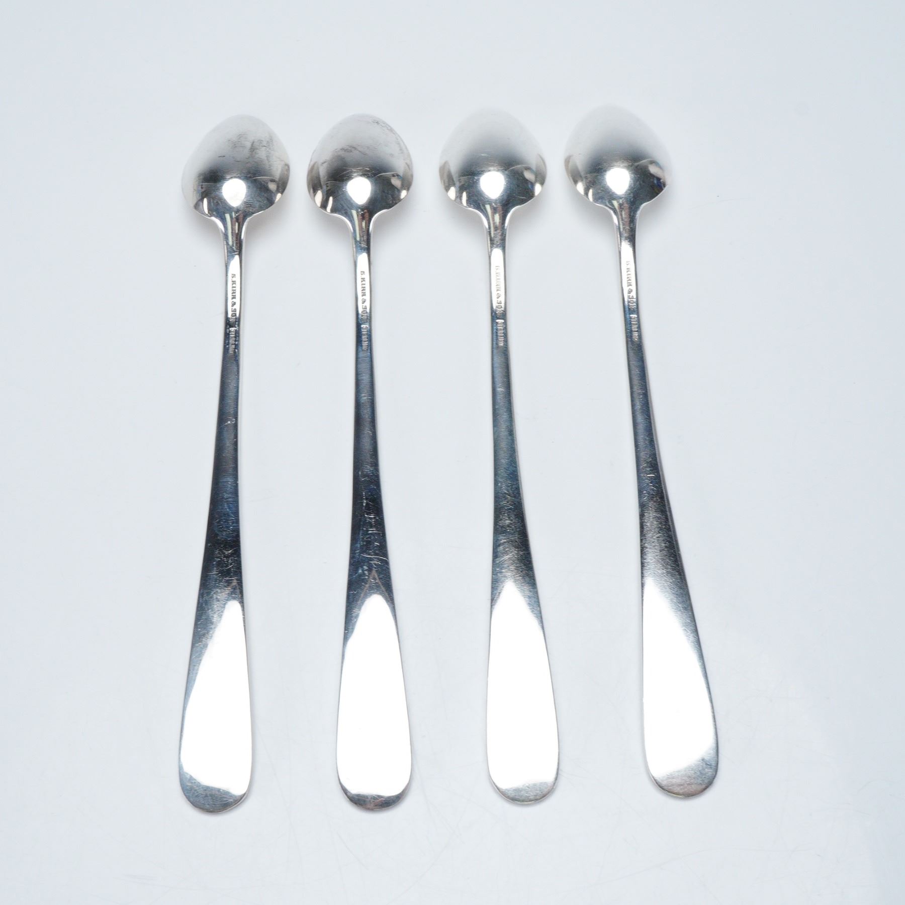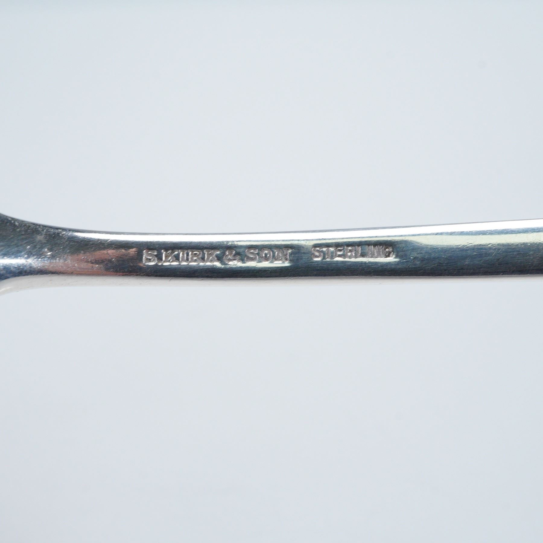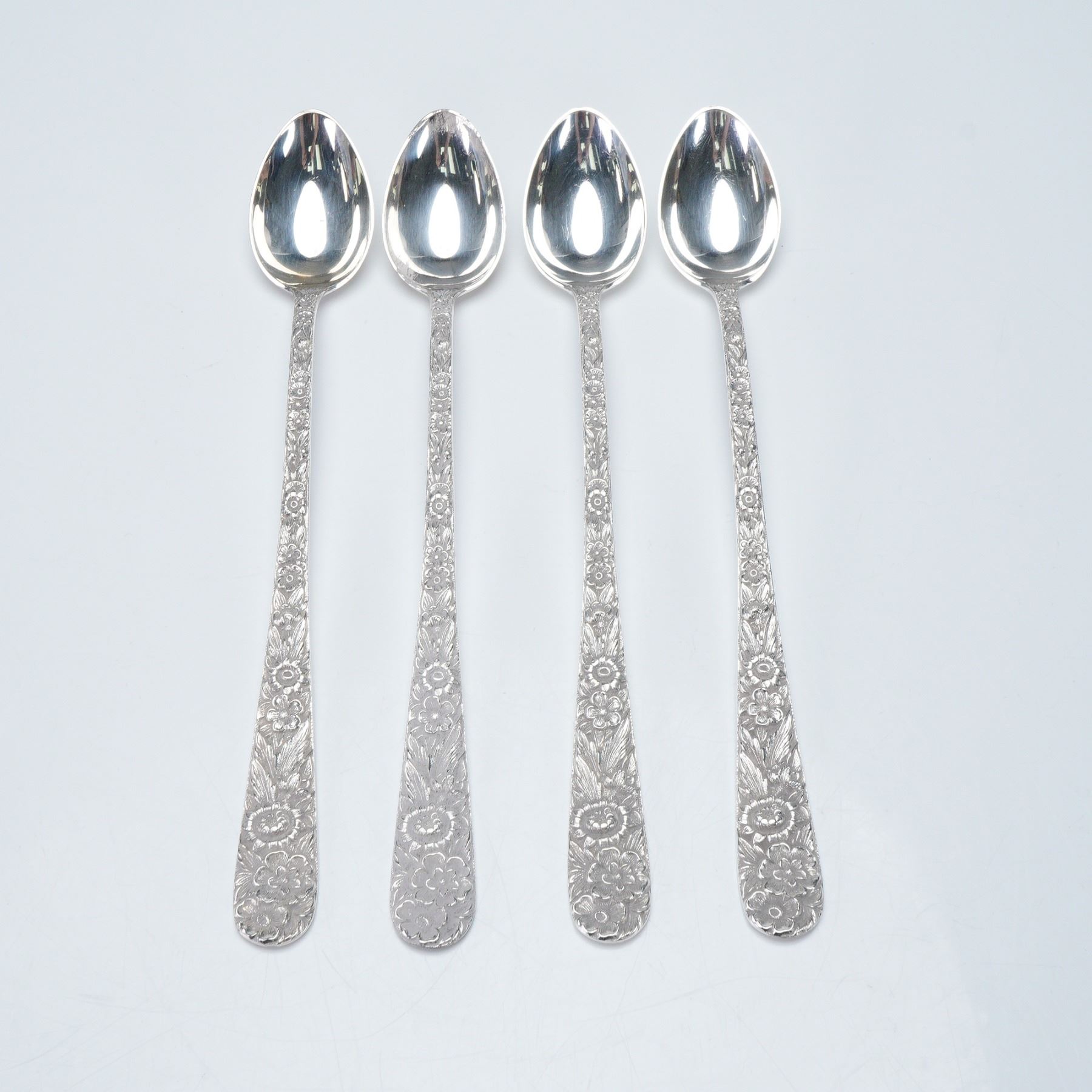 Comprising a set of four finely crafted pieces. Each spoon features a richly detailed floral repousse pattern adorning the handle, showcasing the intricate repousse technique for which the maker is renowned. The spoons bear the hallmark "S. Kirk & Son Sterling" along the reverse of each handle, attesting to their authenticity and silver purity. This elegant set reflects the refined artistry and traditional craftsmanship characteristic of Kirk & Son's celebrated silverwork. The net silver of this lot is 167 g.