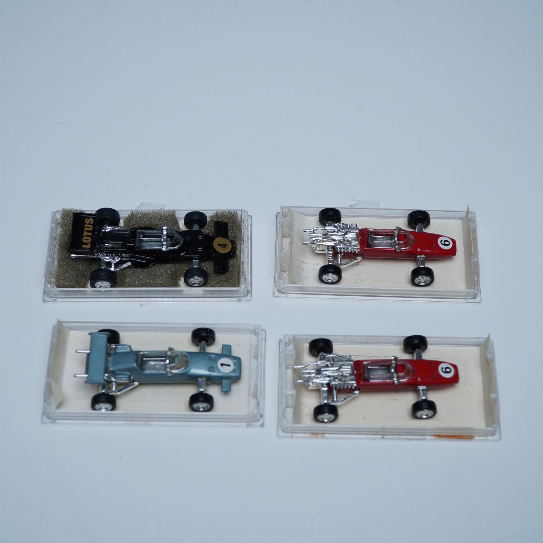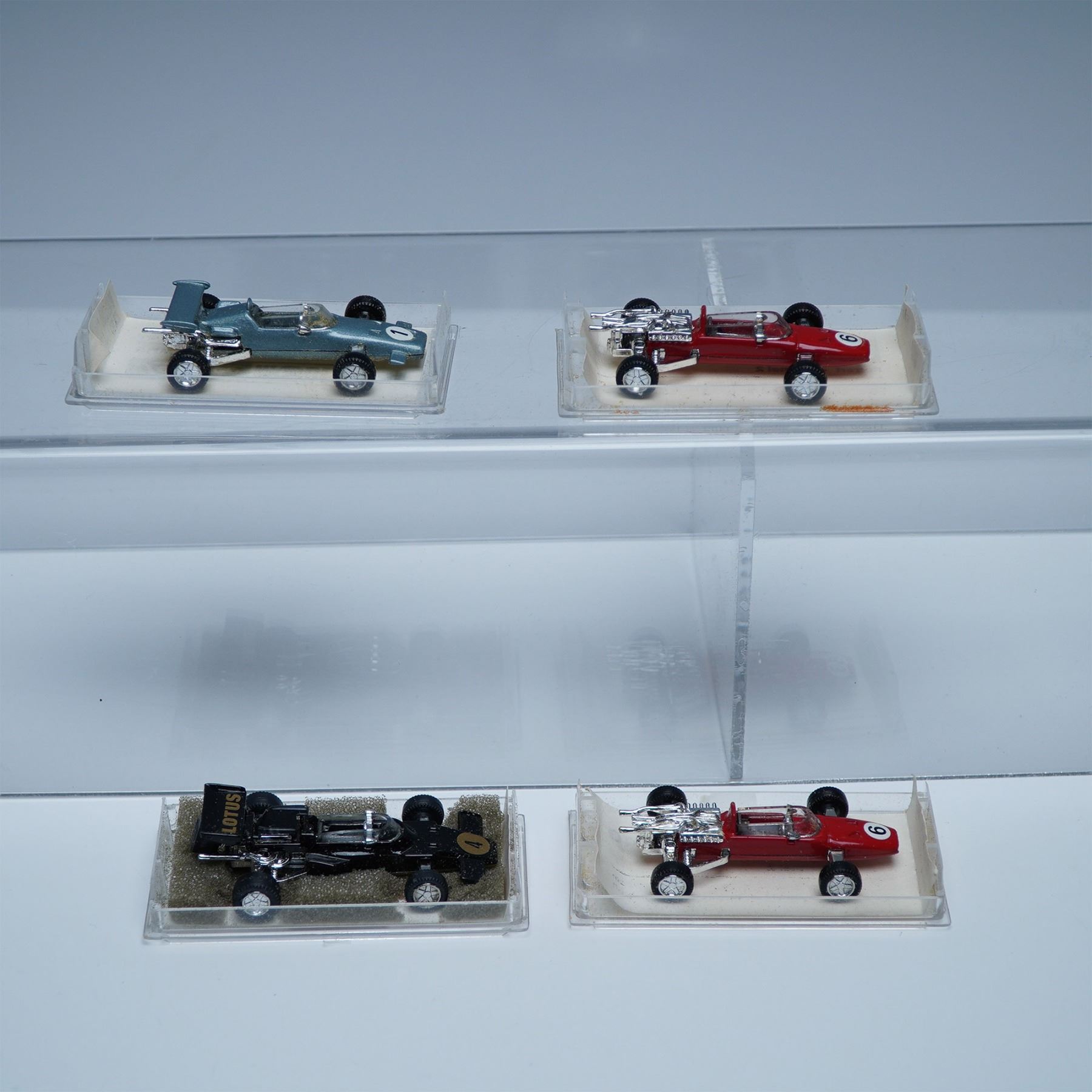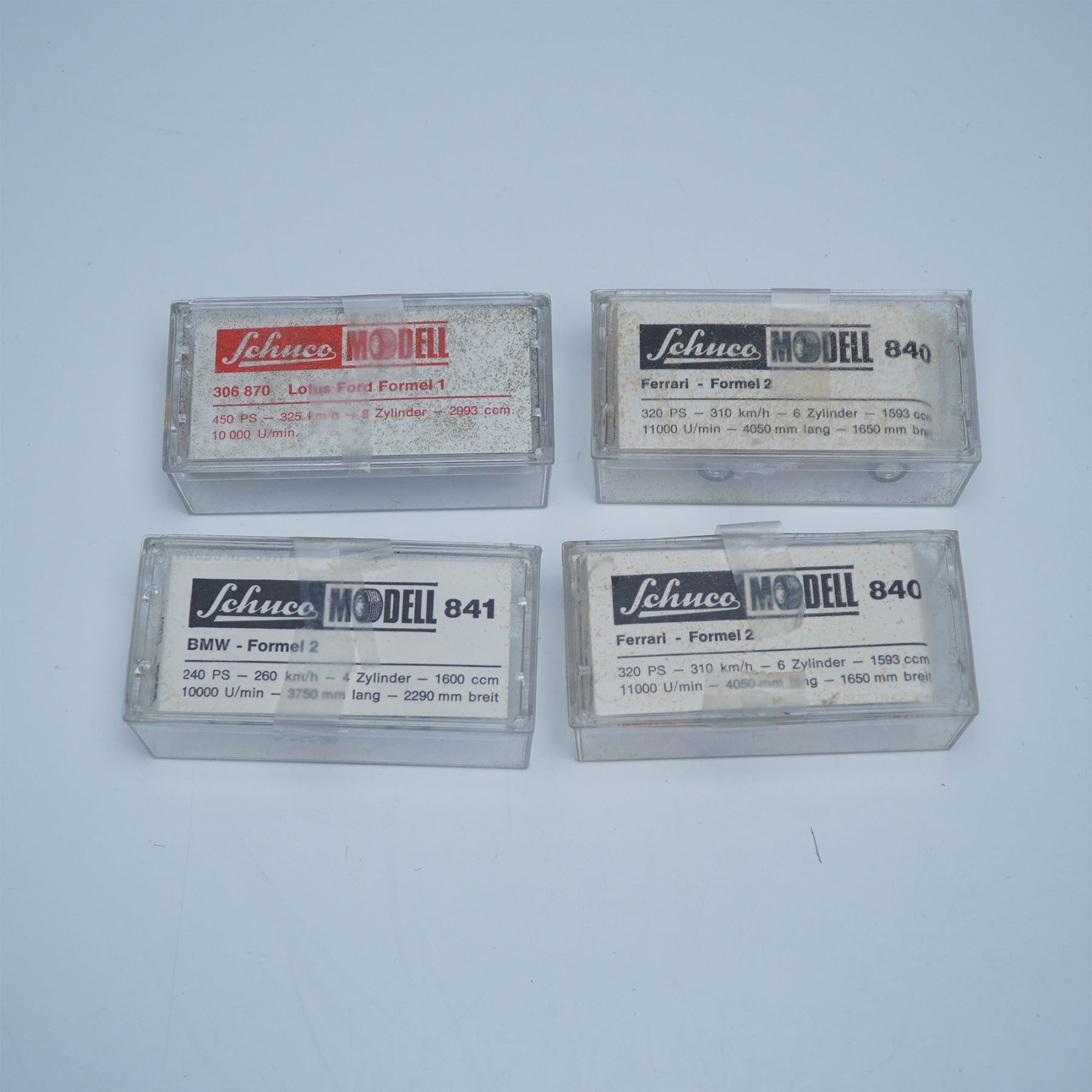 A set of four vintage Schuco diecast Formula racing cars, each housed in its original clear plastic case. This collection includes two Ferrari Formel 2 models (#840), a Lotus Ford Formel 1 (#306 870), and a BMW Formel 2 (#841). Each car measures approximately 2.5"L, while the cases measure 3.25"L x 1.75"W x 1"H. Featuring intricate engine detailing and accurate racing liveries, these classic miniatures showcase Schuco’s precision craftsmanship. Ideal for collectors of vintage racing memorabilia.