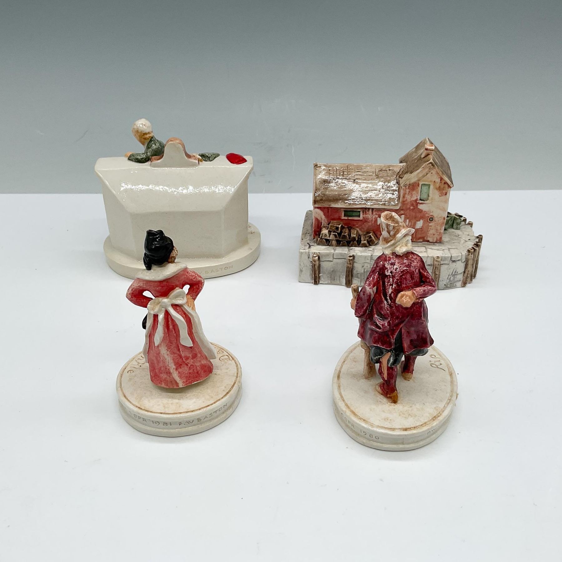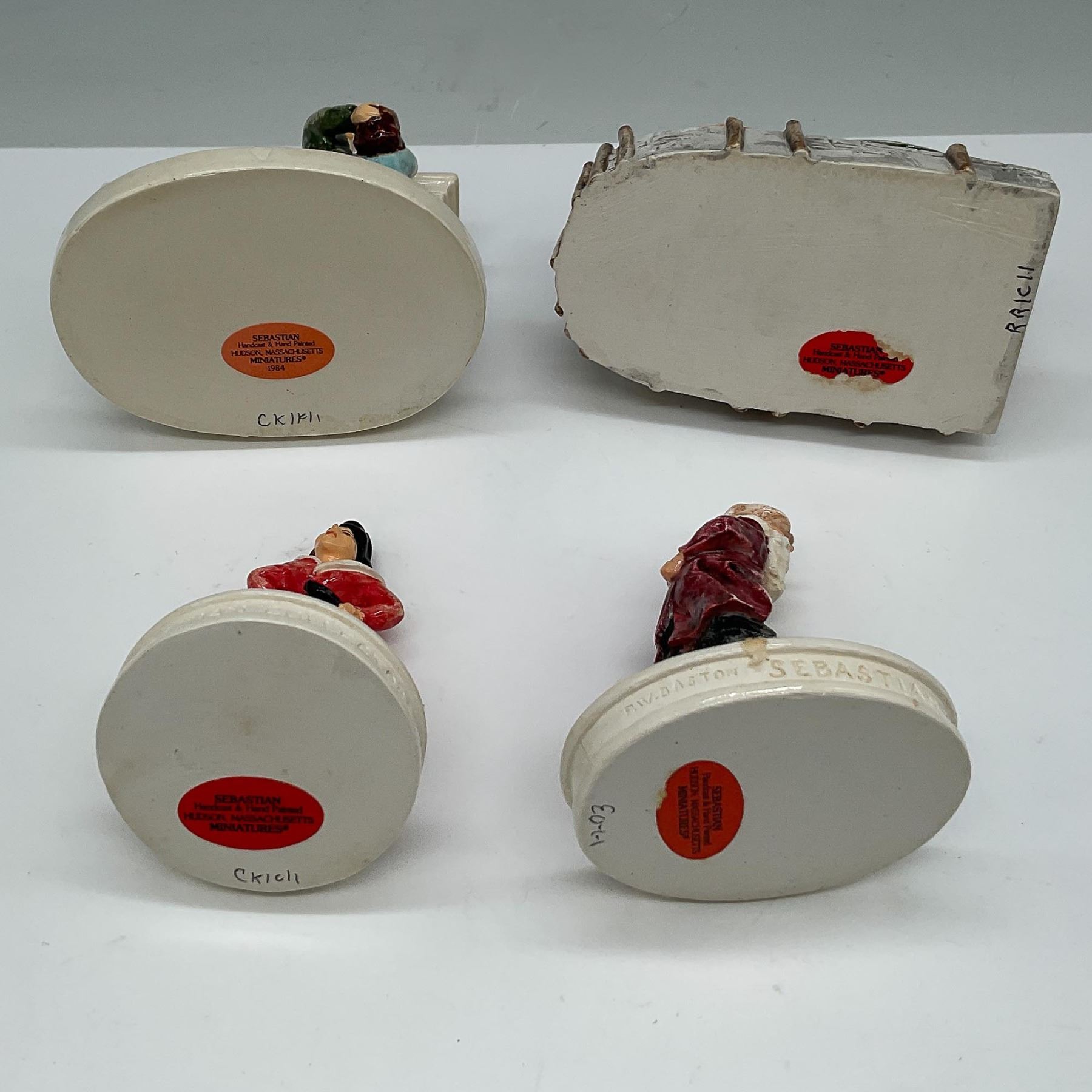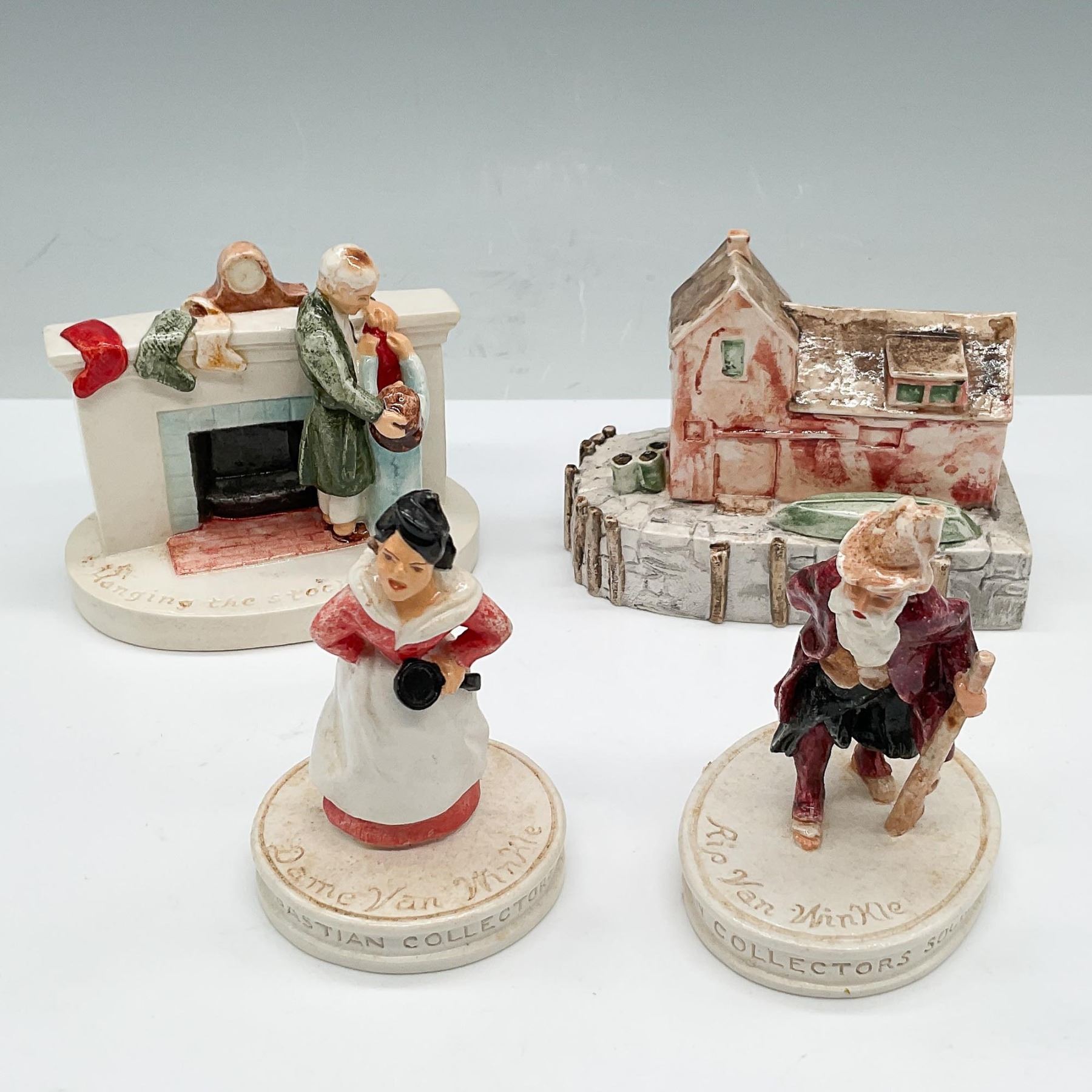 A collection of four hand-painted Sebastian Miniatures figurines, including Rip Van Winkle and Dame Van Winkle from the American Collectors Series. This lot also features a detailed miniature of a rustic home and a festive scene titled Hanging the Stocking II, depicting a heartwarming holiday moment by the fireplace. Each figurine ranging from 3" to 4"H, showcases meticulous craftsmanship and is mounted on a labeled base. The lot includes the original boxes, showing signs of age-related wear.