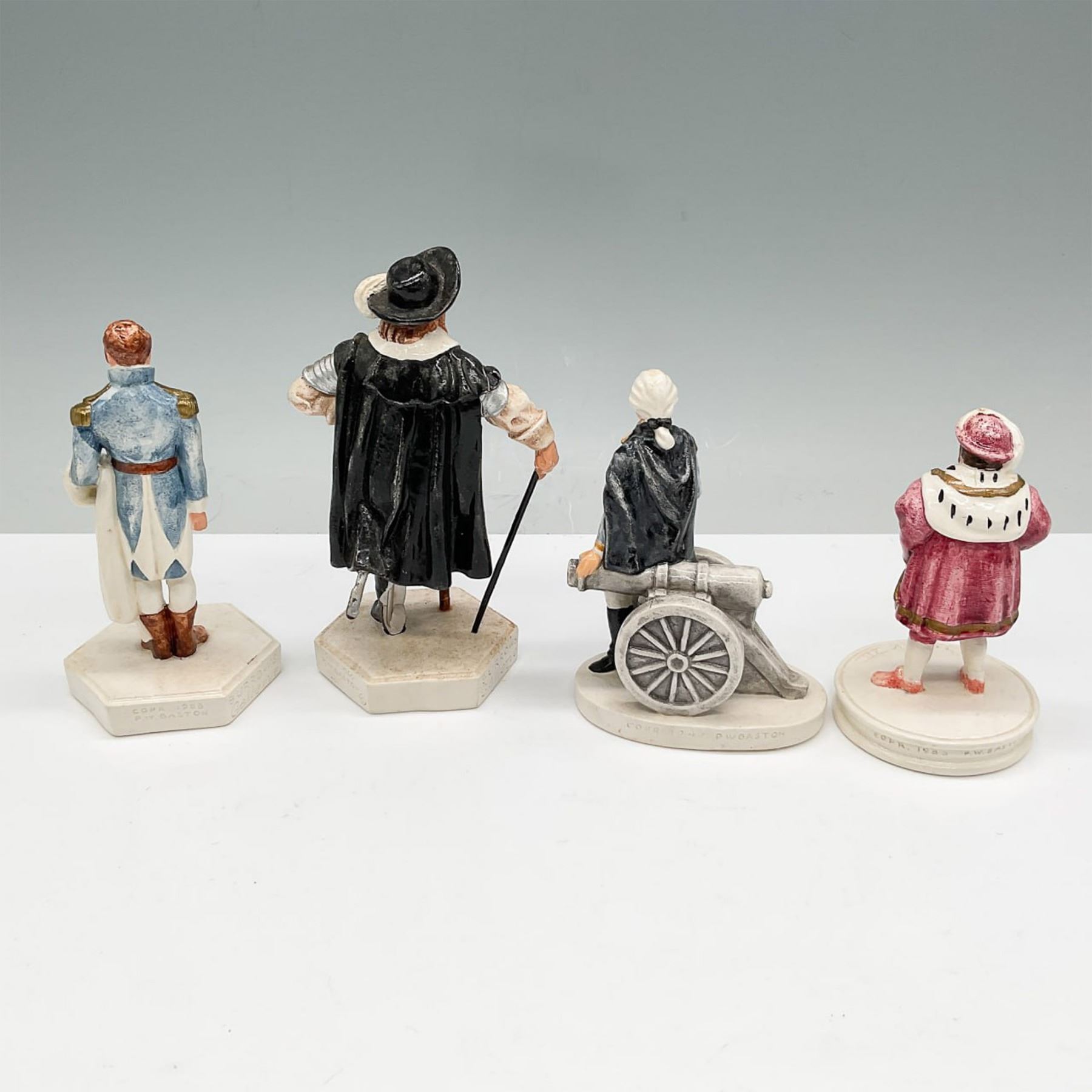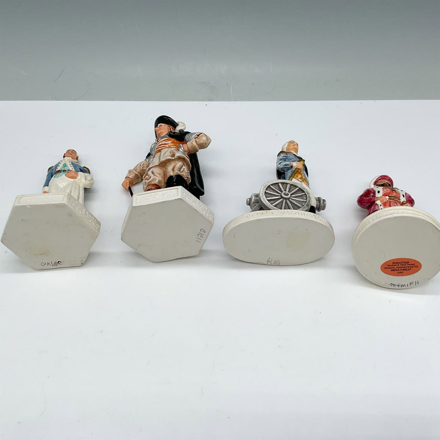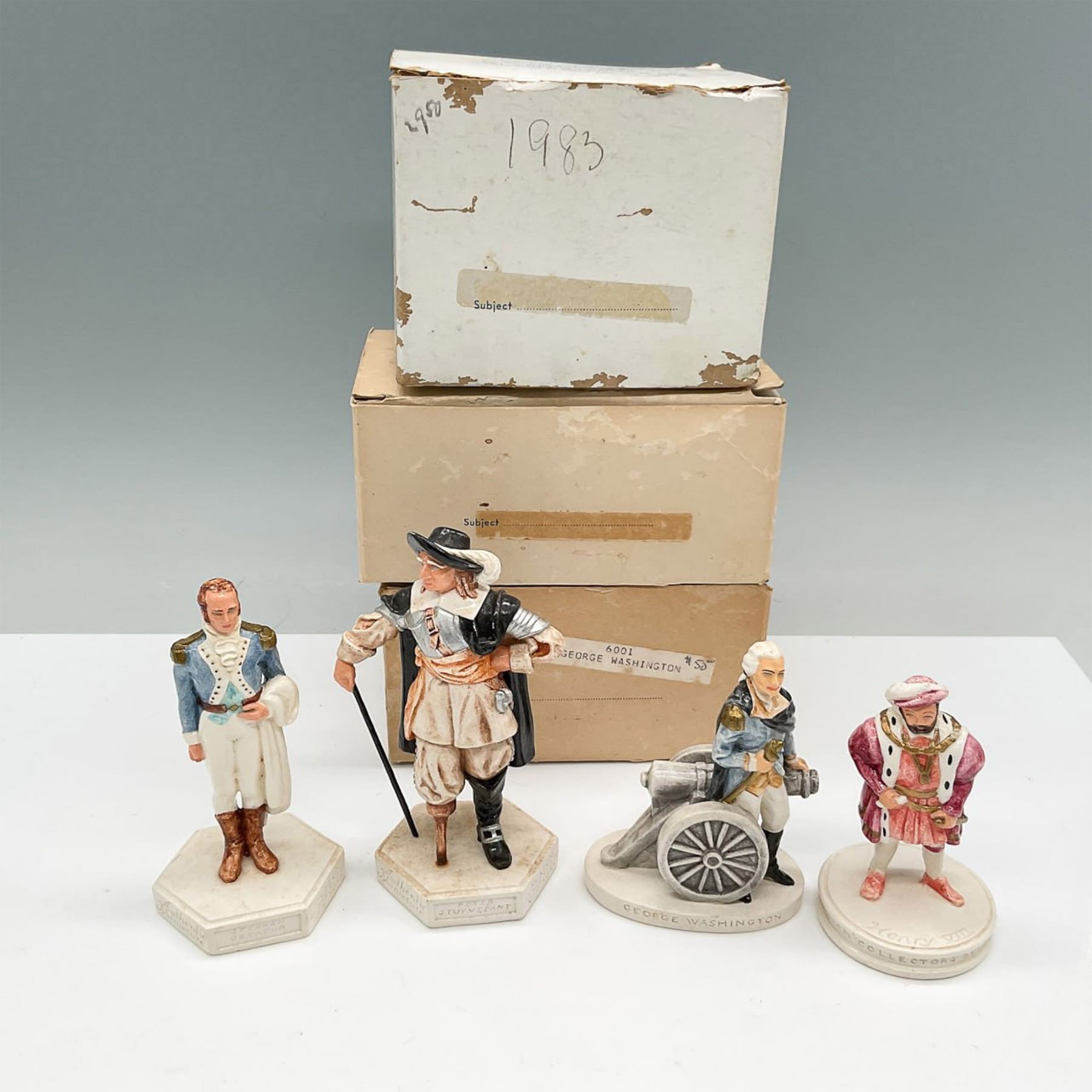 A set of four Sebastian Miniatures figurines depicting historical figures, each standing on a labeled base, range in size from 3.5" to 5"H. These hand-painted plaster figurines include George Washington with a cannon, Henry VIII, Stephen Decatur and Peter Styuyvesant, significant figures. Each piece is crafted with fine detail, showcasing expressive facial features and period-accurate attire. The lot includes original boxes, though they exhibit signs of age-related wear. Sebastian Miniatures, founded by Prescott Baston in the mid-20th century, are highly collectible for their artistry and historical themes. This item has its original box.