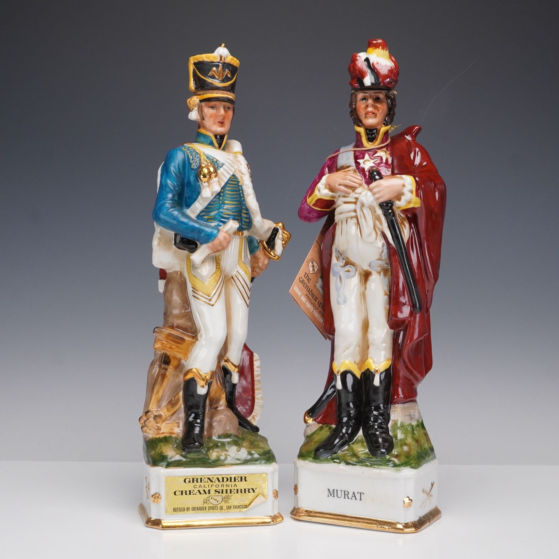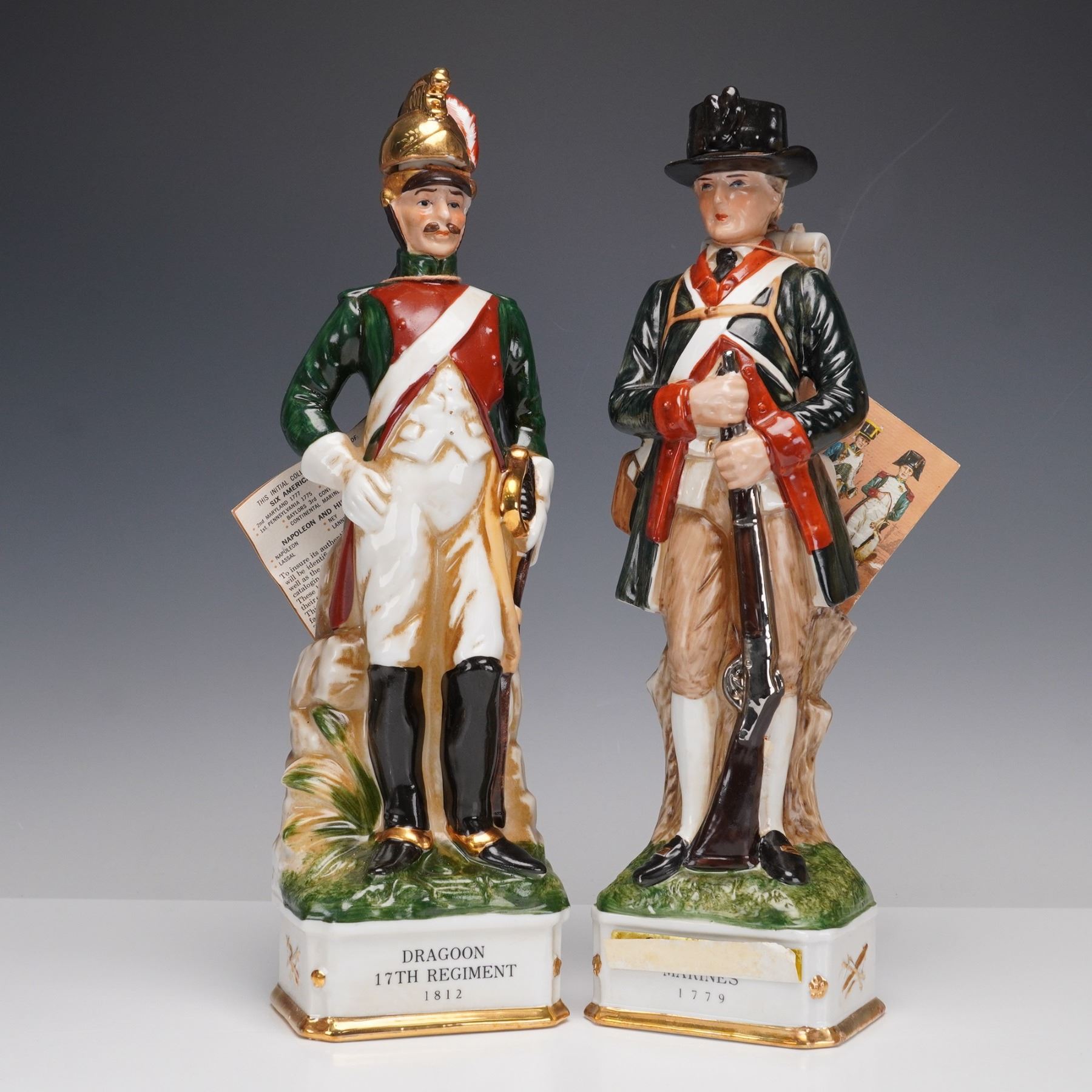 Set of four porcelain figural whisky containers by Arnart Imports, Inc. for Grenadier Spirits Co., each hand-painted in fine detail to represent historical military figures. Includes Dragoon 17th Regiment 1812, Lassal, Murat, and Marines 1779. Each features period accurate uniforms with rich colors, gilt highlights, and molded titled bases. All retain foil labels to the reverse, and most still have their original illustrated hang tags. Two figures retain their original illustrated boxes. Bases are marked with Grenadier Spirits Co. dates ranging from 1969 to 1970. Originally bottled with Grenadier Cream Sherry, these figural decanters are now prized collectibles for both military history and vintage spirits memorabilia enthusiasts.