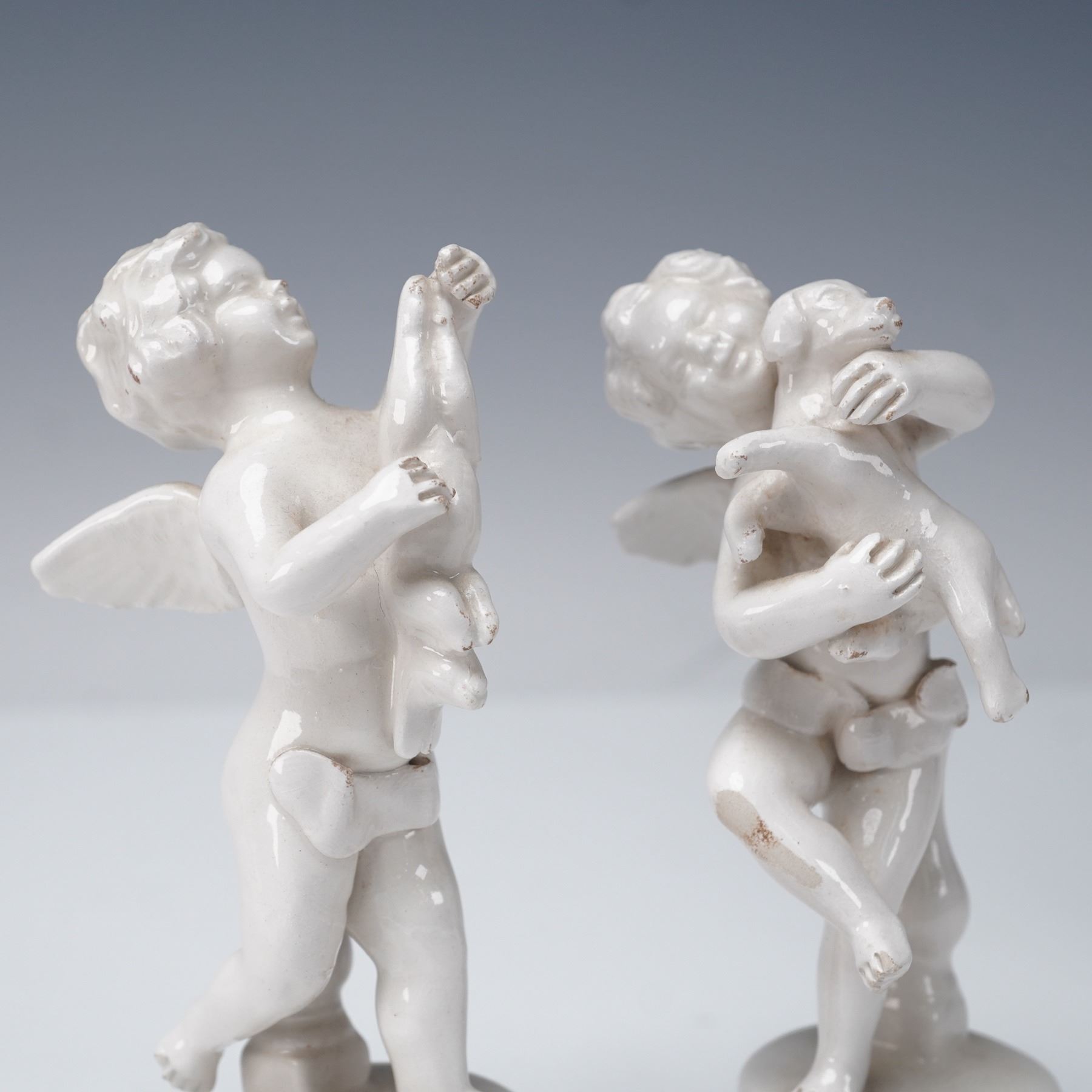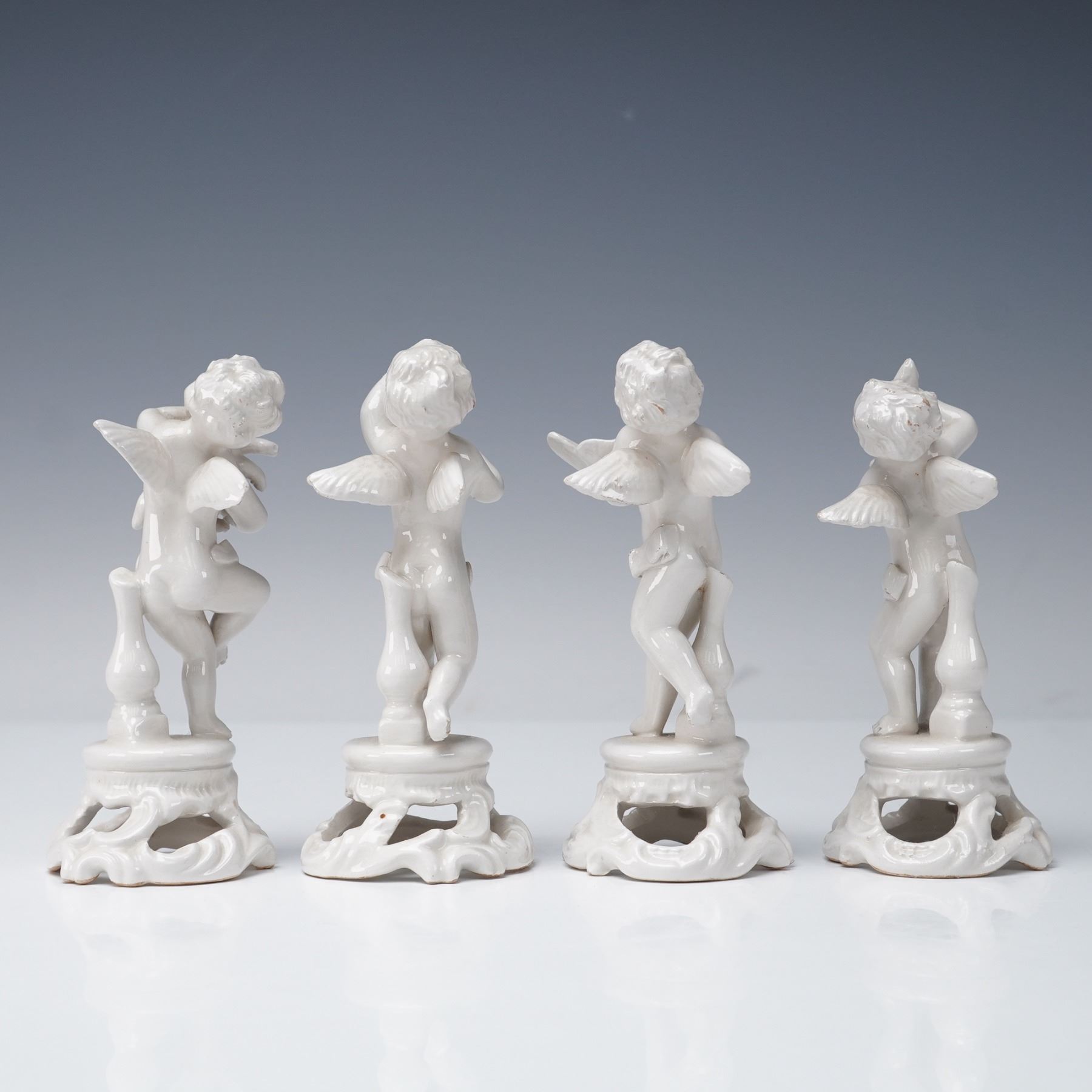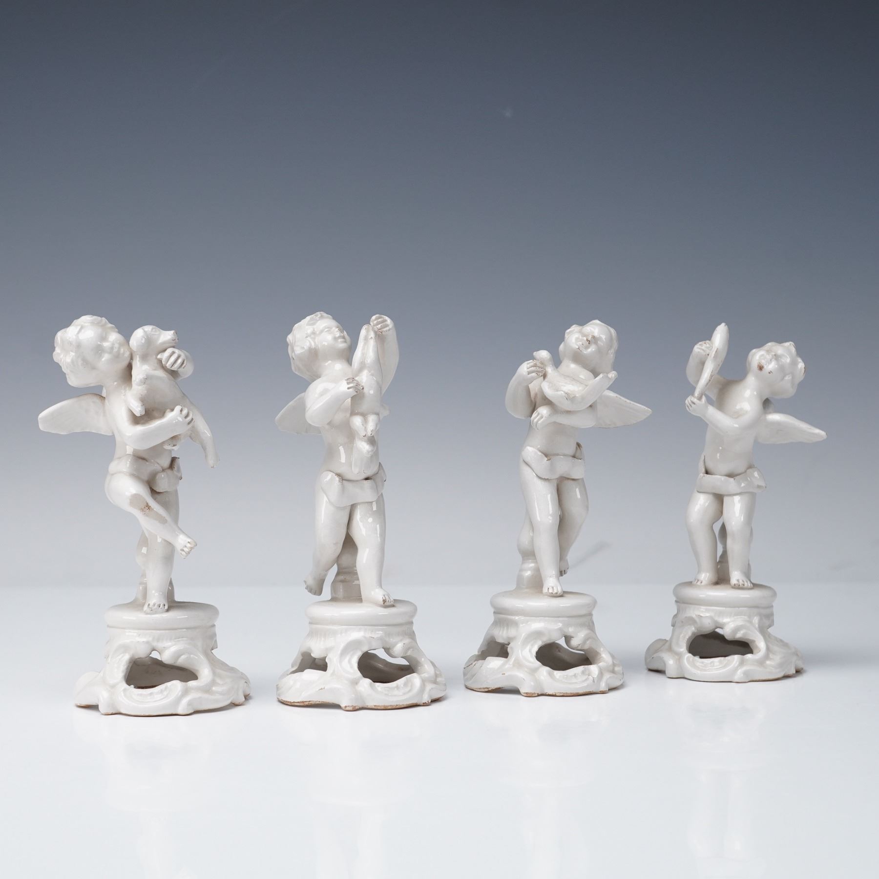 A group of four Italian glazed ceramic putti figurines by Bassano, Italy. Each depicts a cherub in a different pose: one holding a puppy, one holding a bird, one holding a fish, and one embracing a rabbit. Executed in a glossy white glaze, they are modeled with expressive faces and delicate detailing, raised on openwork rococo-style bases. Each figure bears the impressed Bassano mark on the underside, confirming origin from the historic ceramic center in Veneto, Italy.