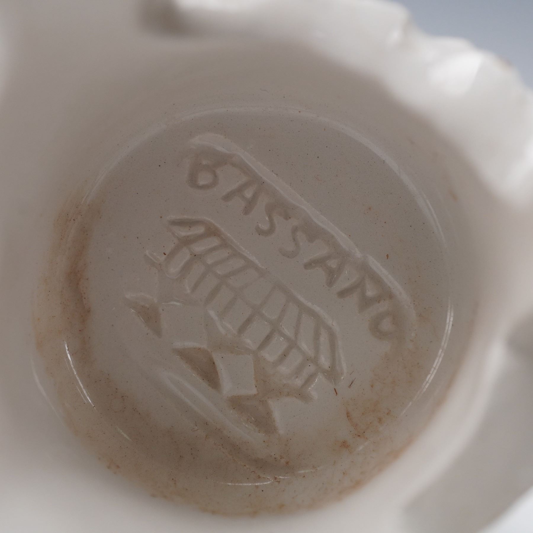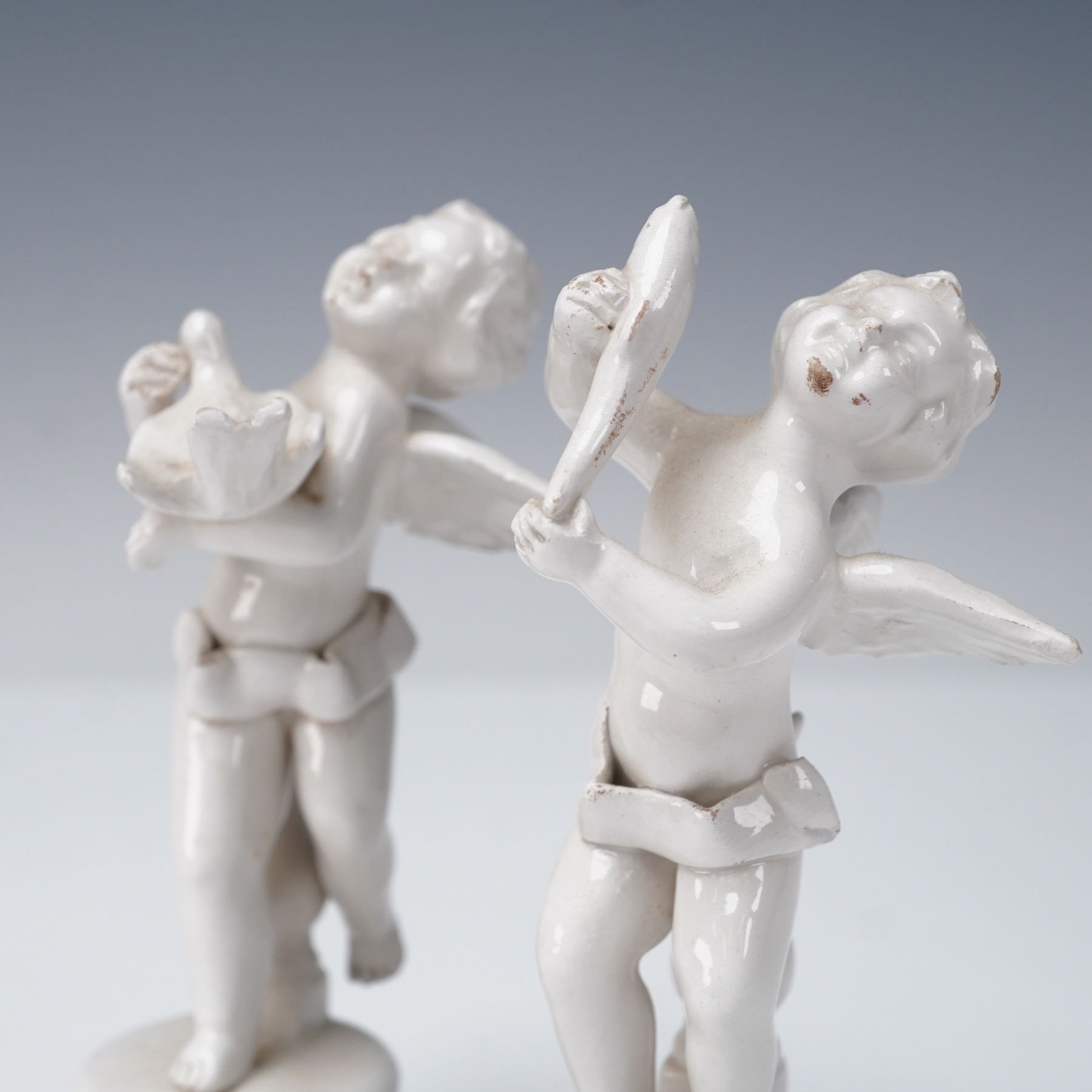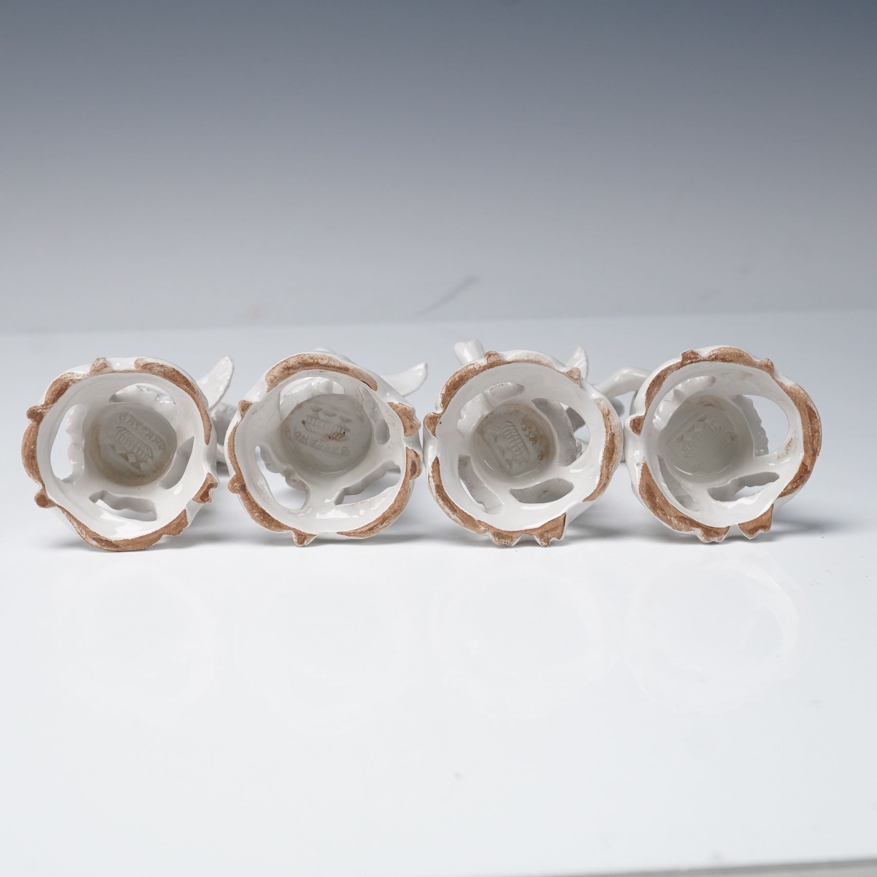 A group of four Italian glazed ceramic putti figurines by Bassano, Italy. Each depicts a cherub in a different pose: one holding a puppy, one holding a bird, one holding a fish, and one embracing a rabbit. Executed in a glossy white glaze, they are modeled with expressive faces and delicate detailing, raised on openwork rococo-style bases. Each figure bears the impressed Bassano mark on the underside, confirming origin from the historic ceramic center in Veneto, Italy.