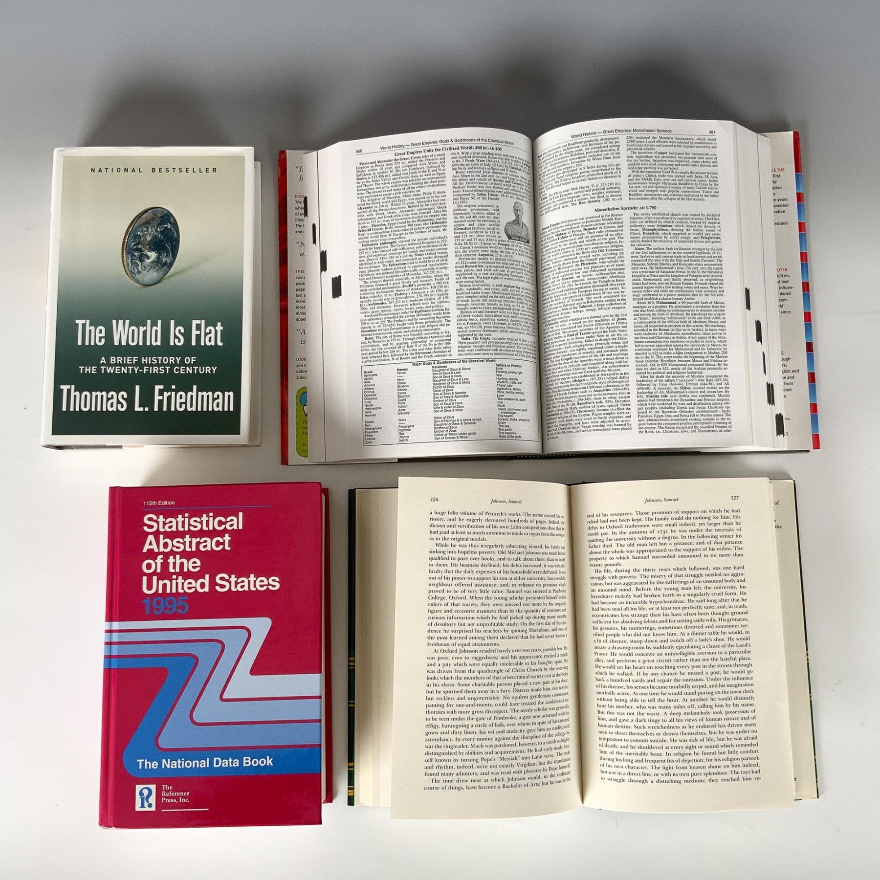 This collection of four essential reference books offers a rich compilation of knowledge spanning statistics, history, global affairs, and encyclopedic insights. Included is The World Almanac and Book of Facts 2004, a comprehensive resource filled with key world events, statistics, and historical data. The Statistical Abstract of the United States 1995 serves as a vital government issued compendium of economic, demographic, and social statistics. All There Is to Know presents a curated selection from the Eleventh Edition of the Encyclopaedia Britannica, offering a wealth of historical and intellectual knowledge. Rounding out the collection, The World Is Flat by Thomas L. Friedman provides a modern perspective on globalization and the interconnected nature of the twenty first century world. A valuable assortment for researchers, historians, and those passionate about acquiring a broad spectrum of factual knowledge. Largest item measures: 7.5"L x 2.5"W x 10.25"H.