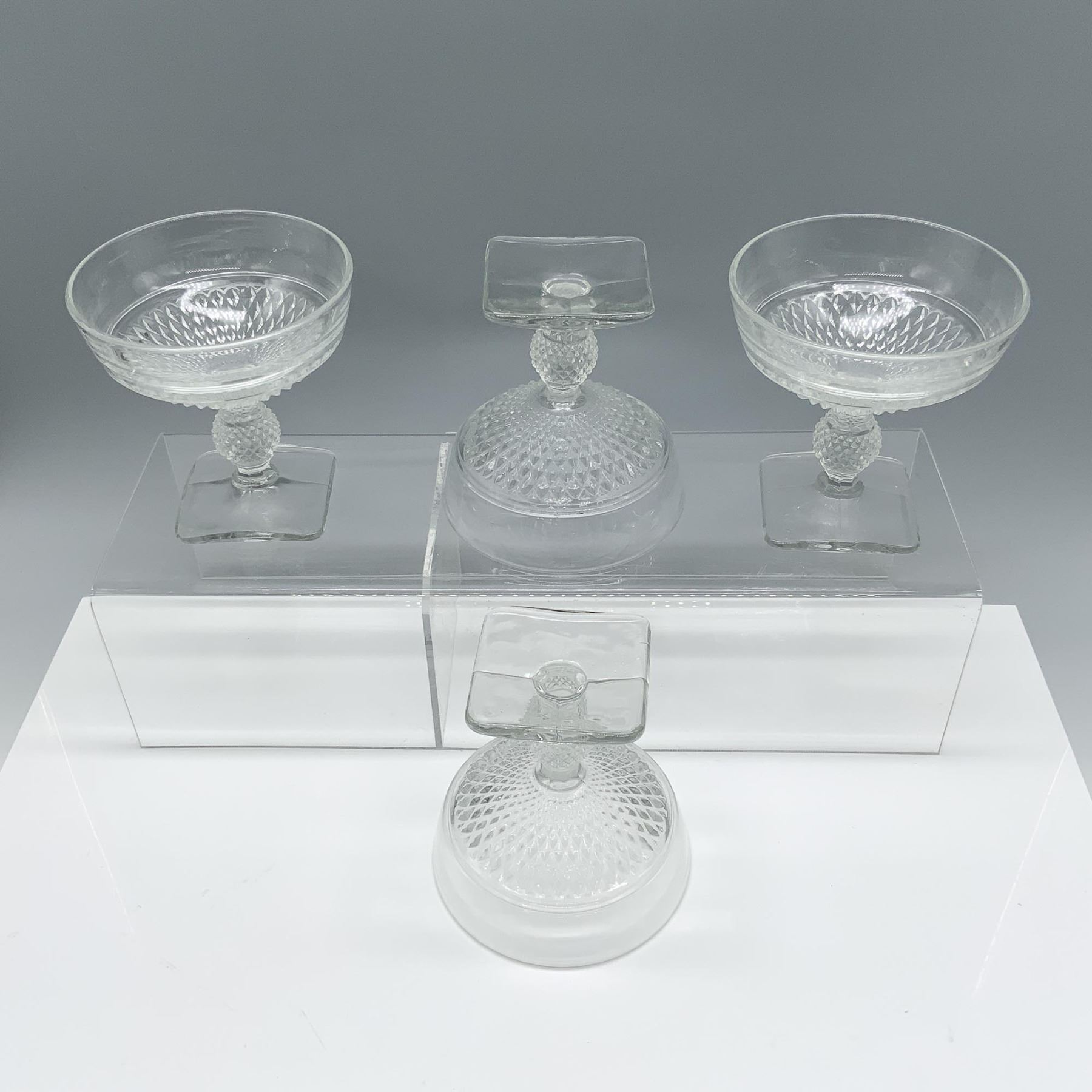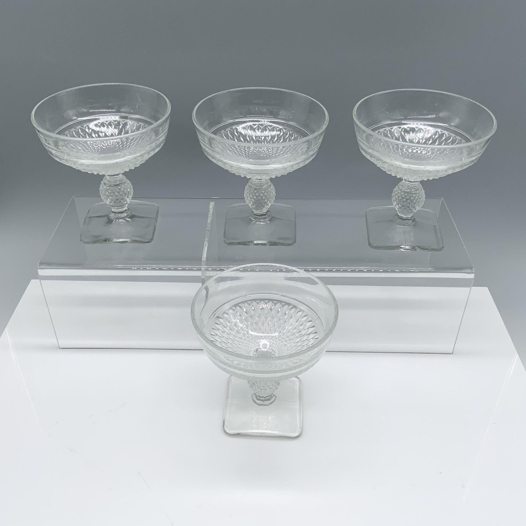Appealing collection of crystal cups with a diamond pattern and a square base.