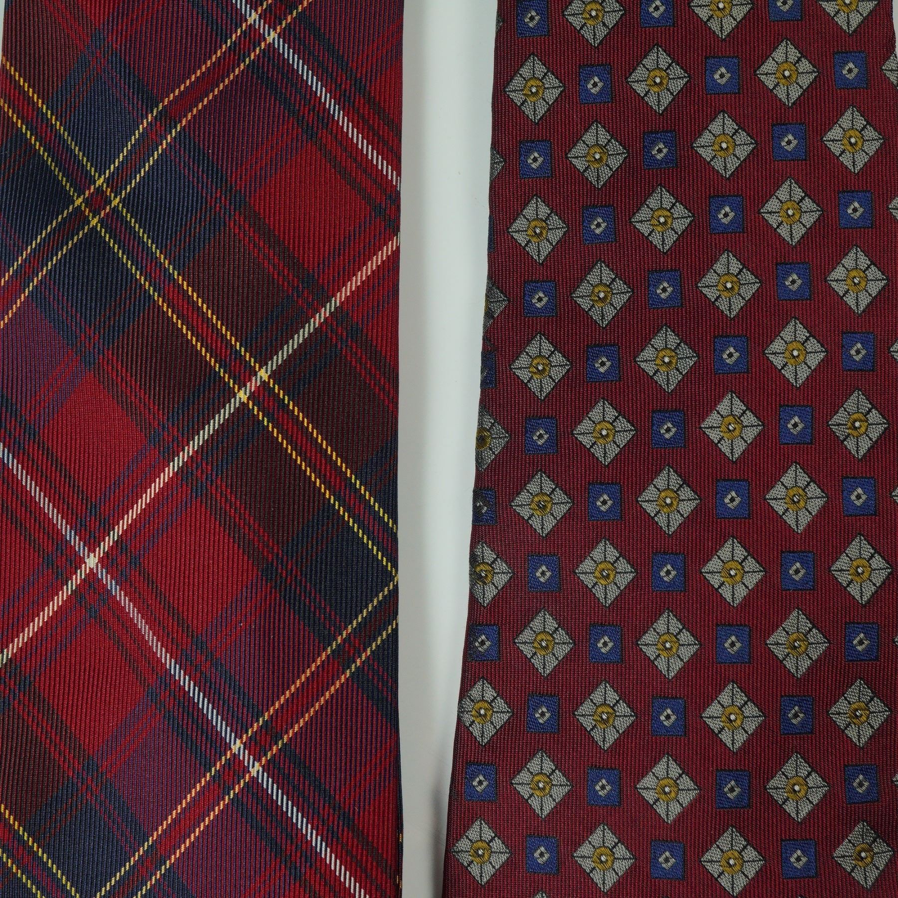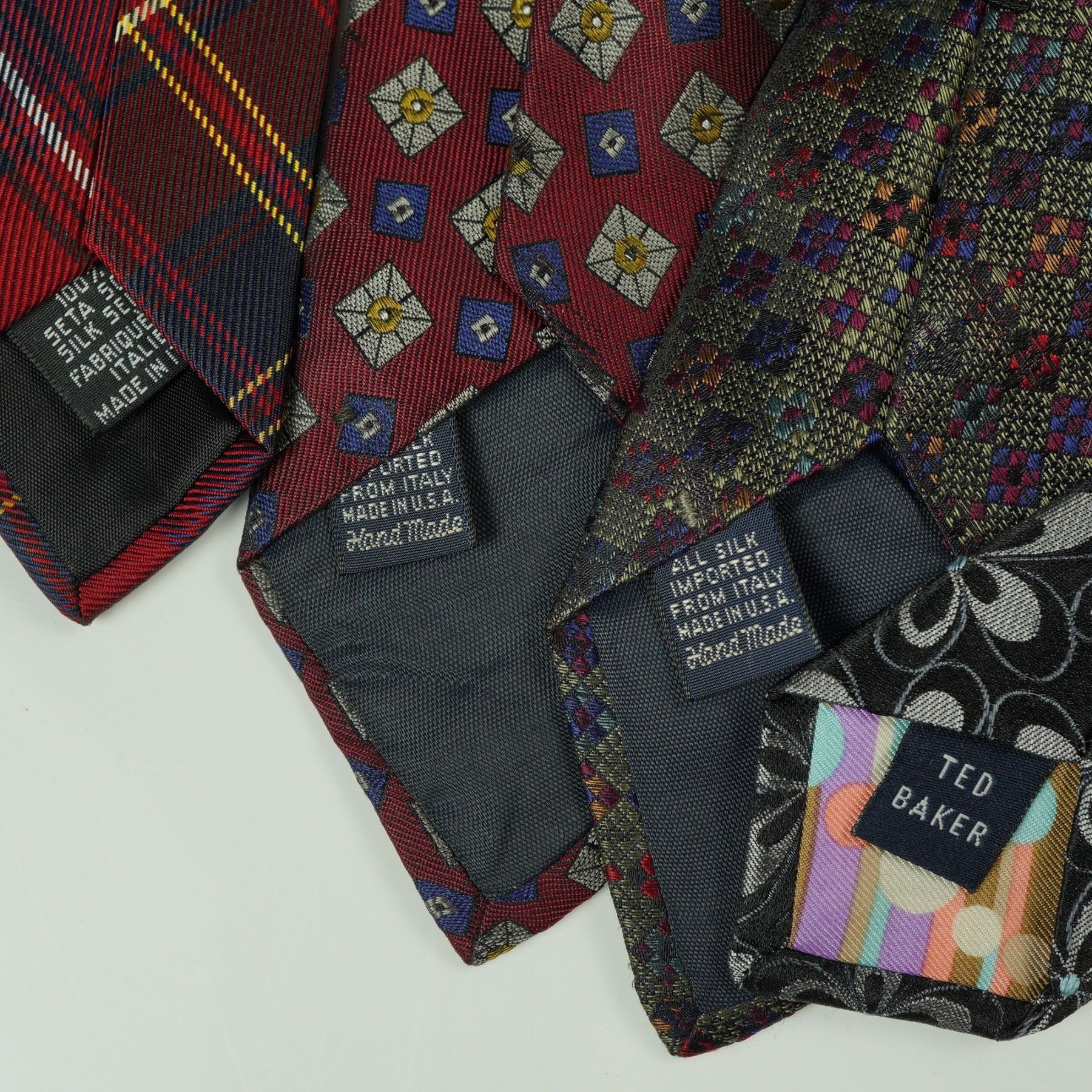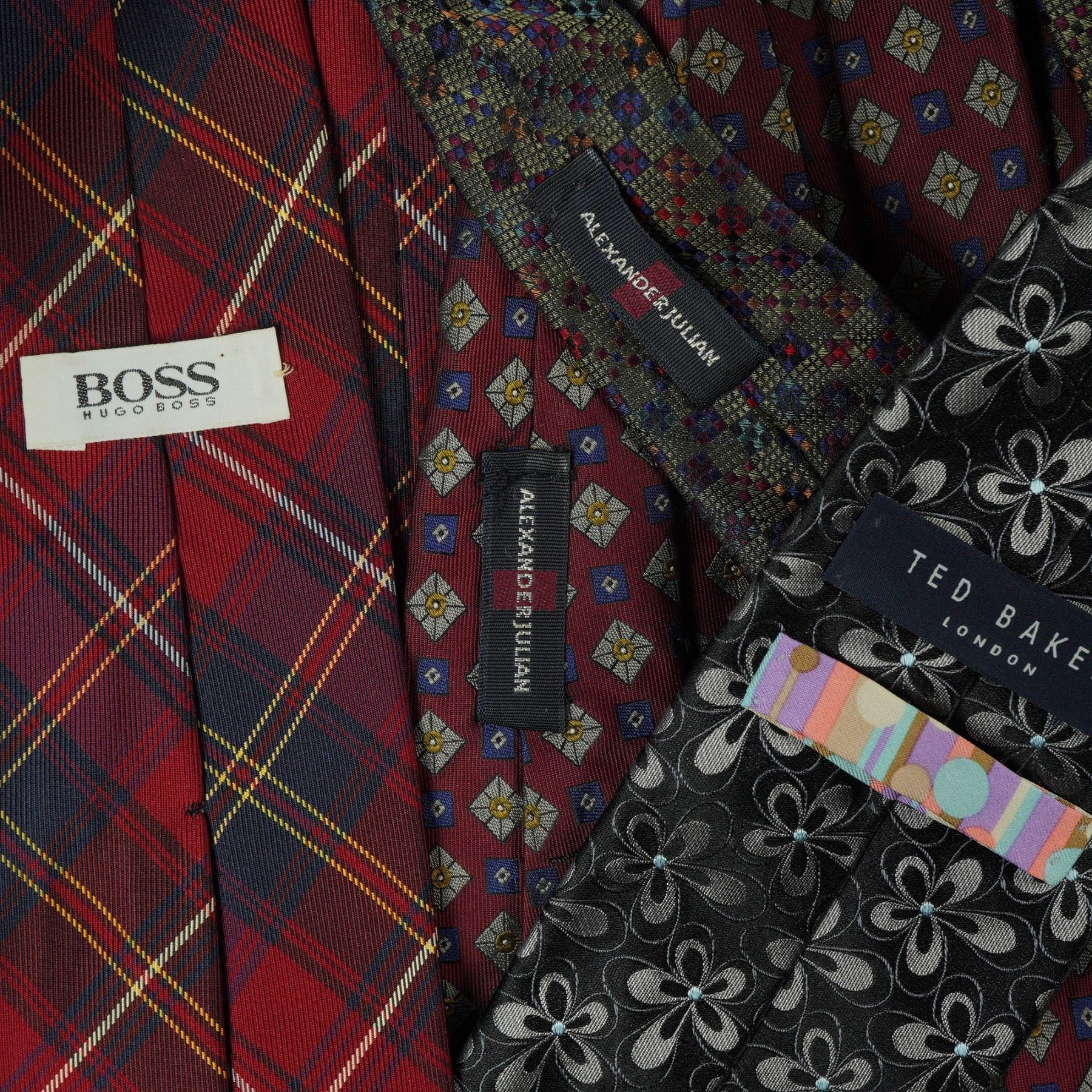 A refined assortment of four neckties crafted from 100% silk. This set includes a range of elegant patterns, from bold florals and traditional plaids to geometric and mosaic motifs. Featured brands include Ted Baker, Hugo Boss, and Alexander Julian. A sophisticated selection ideal for both business and formal wear.