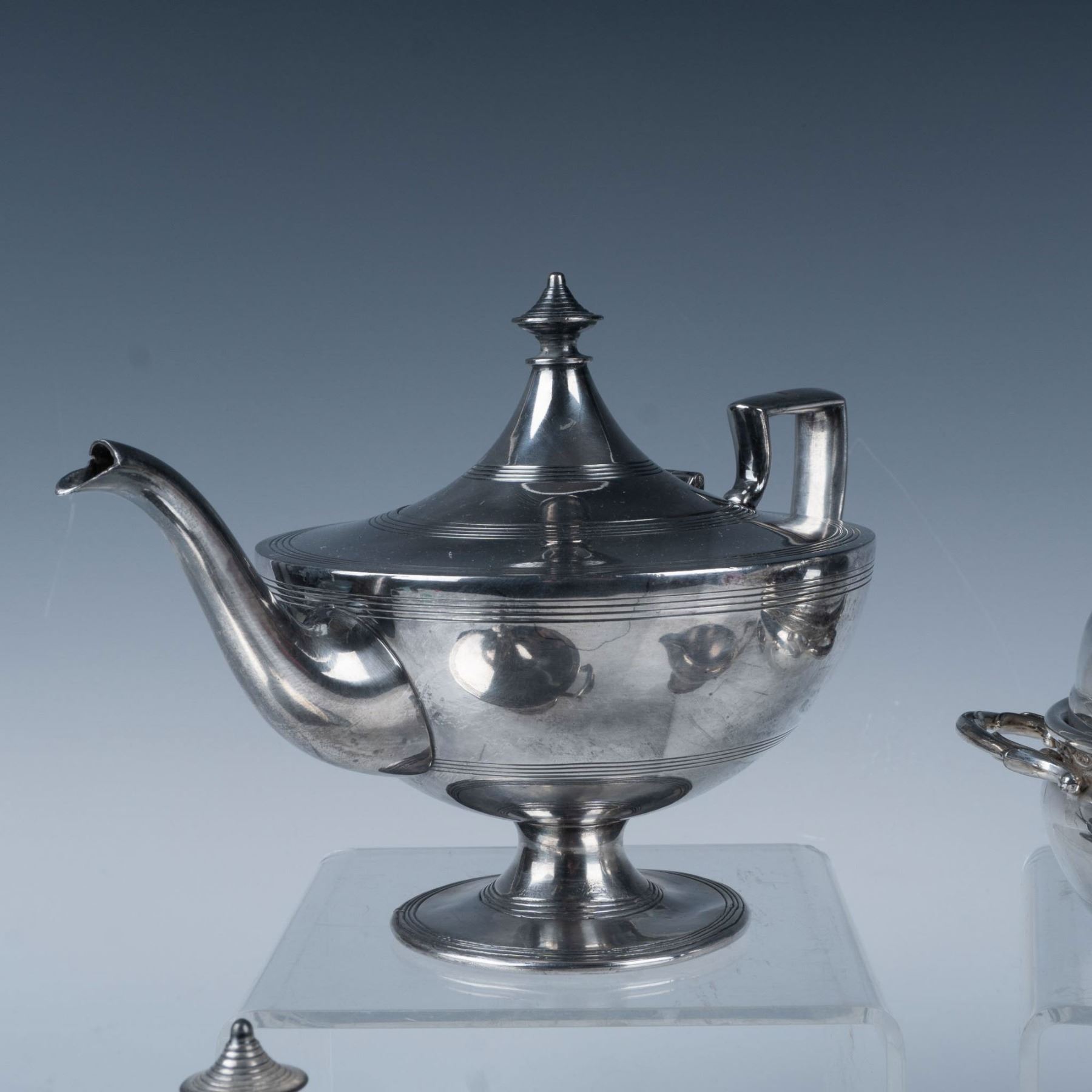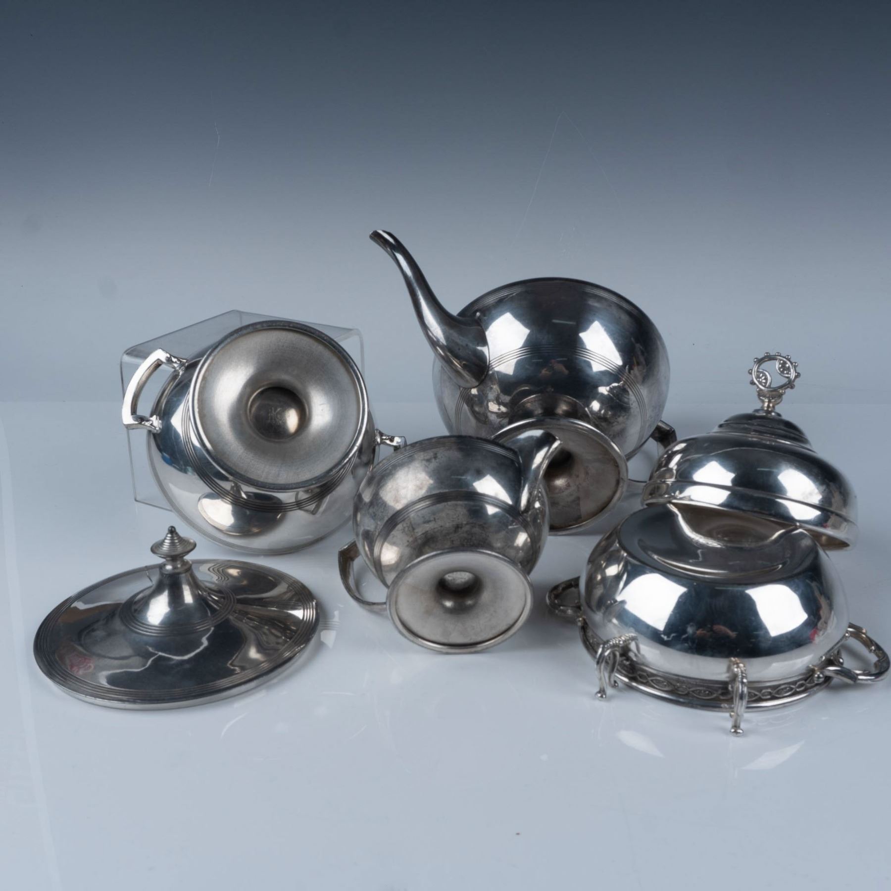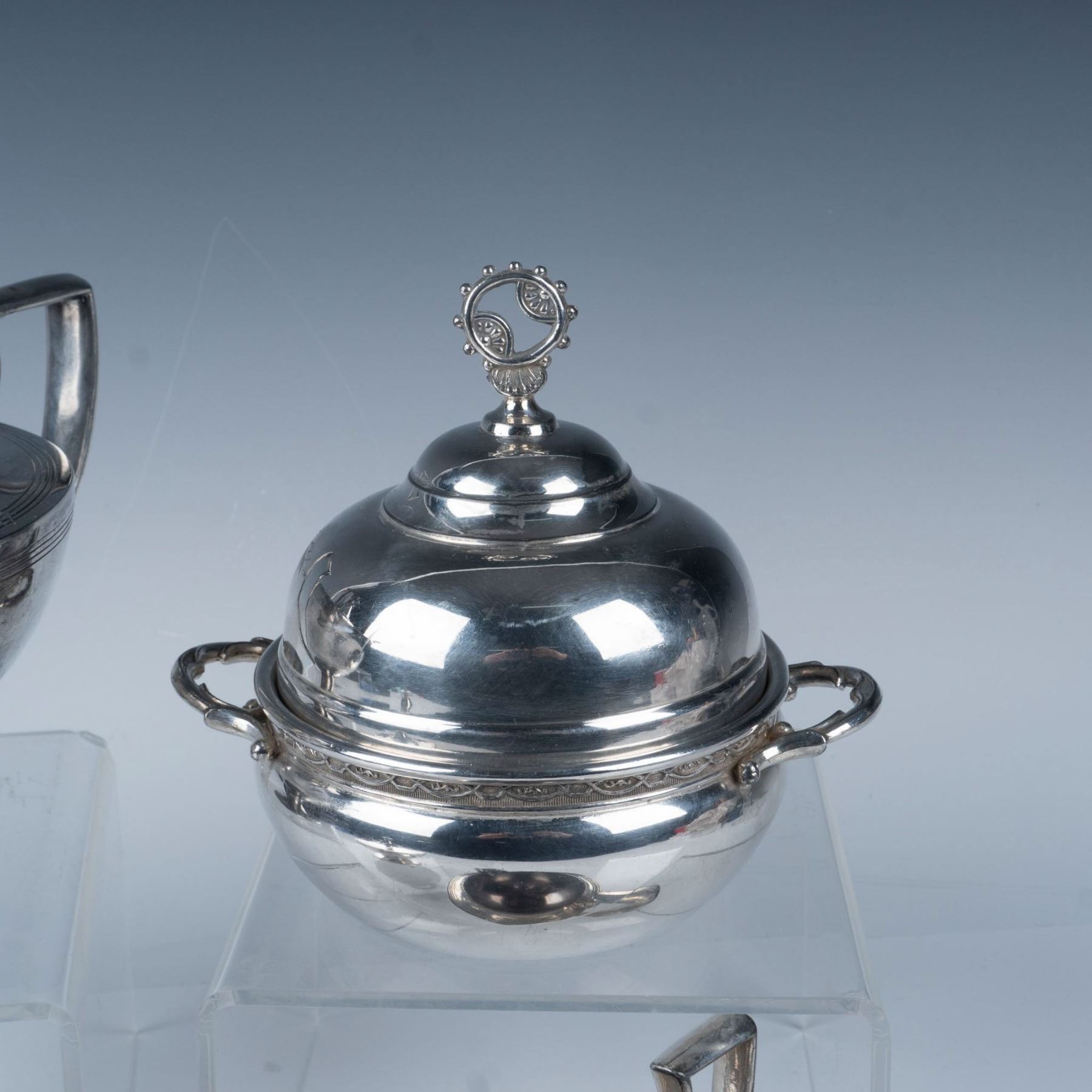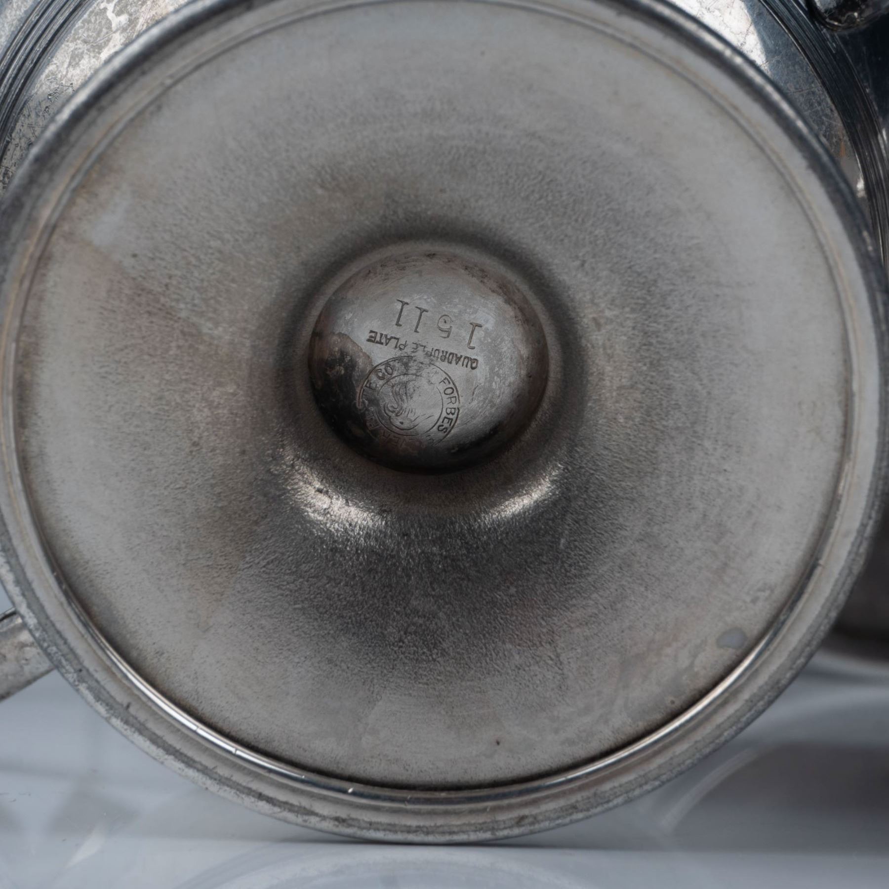 Beautiful grouping featuring a tea or coffee pot, covered sugar, creamer, and covered butter dish. Three pieces are marked Forbes, while the butter dish is marked National Silver Co. The butter dish includes a double pan for ice beneath the butter platform, adding both style and functionality. The largest piece measures 10.25"L x 6"W x 6.5"H.