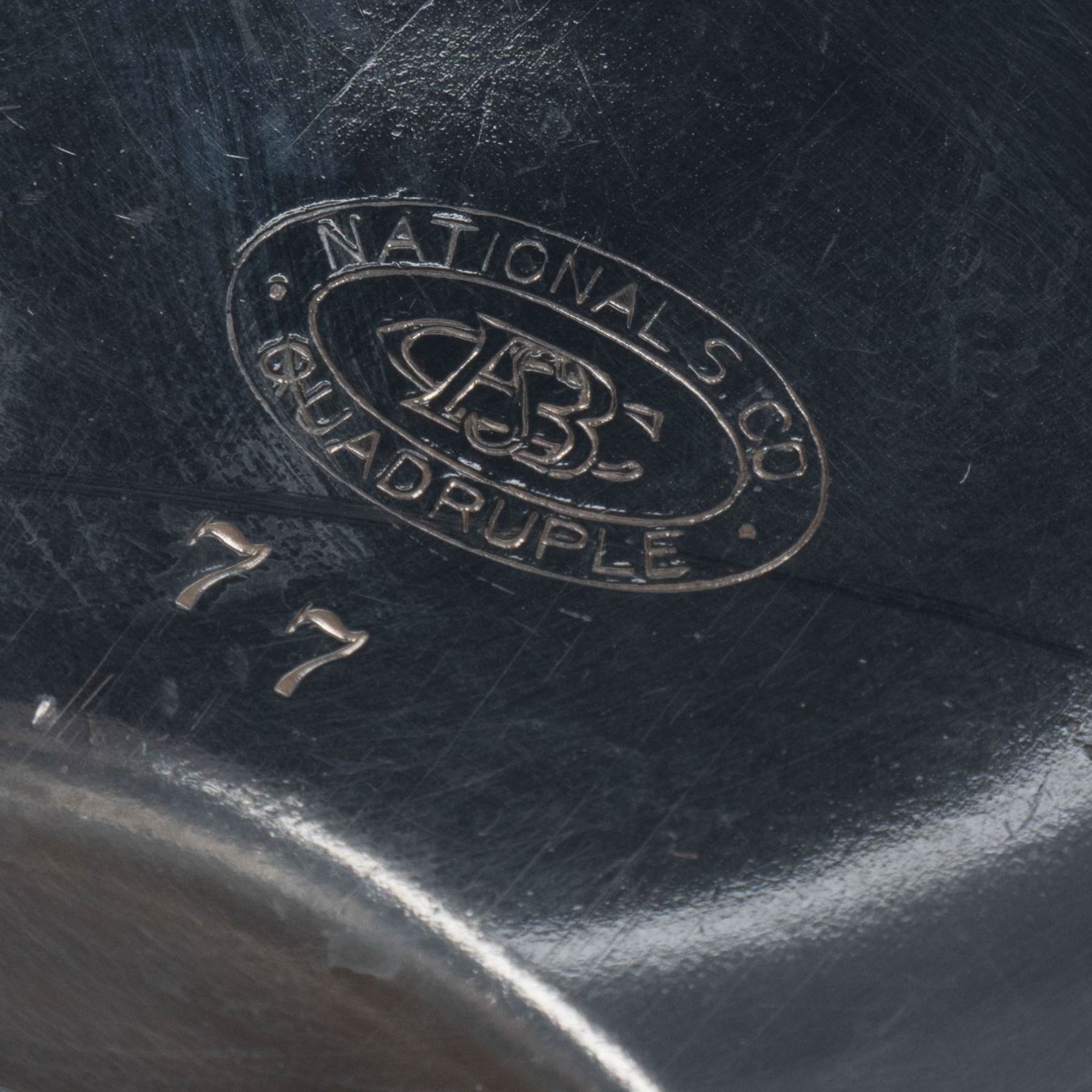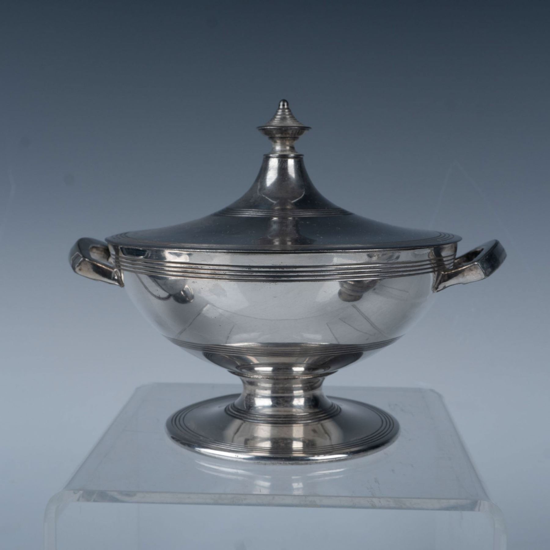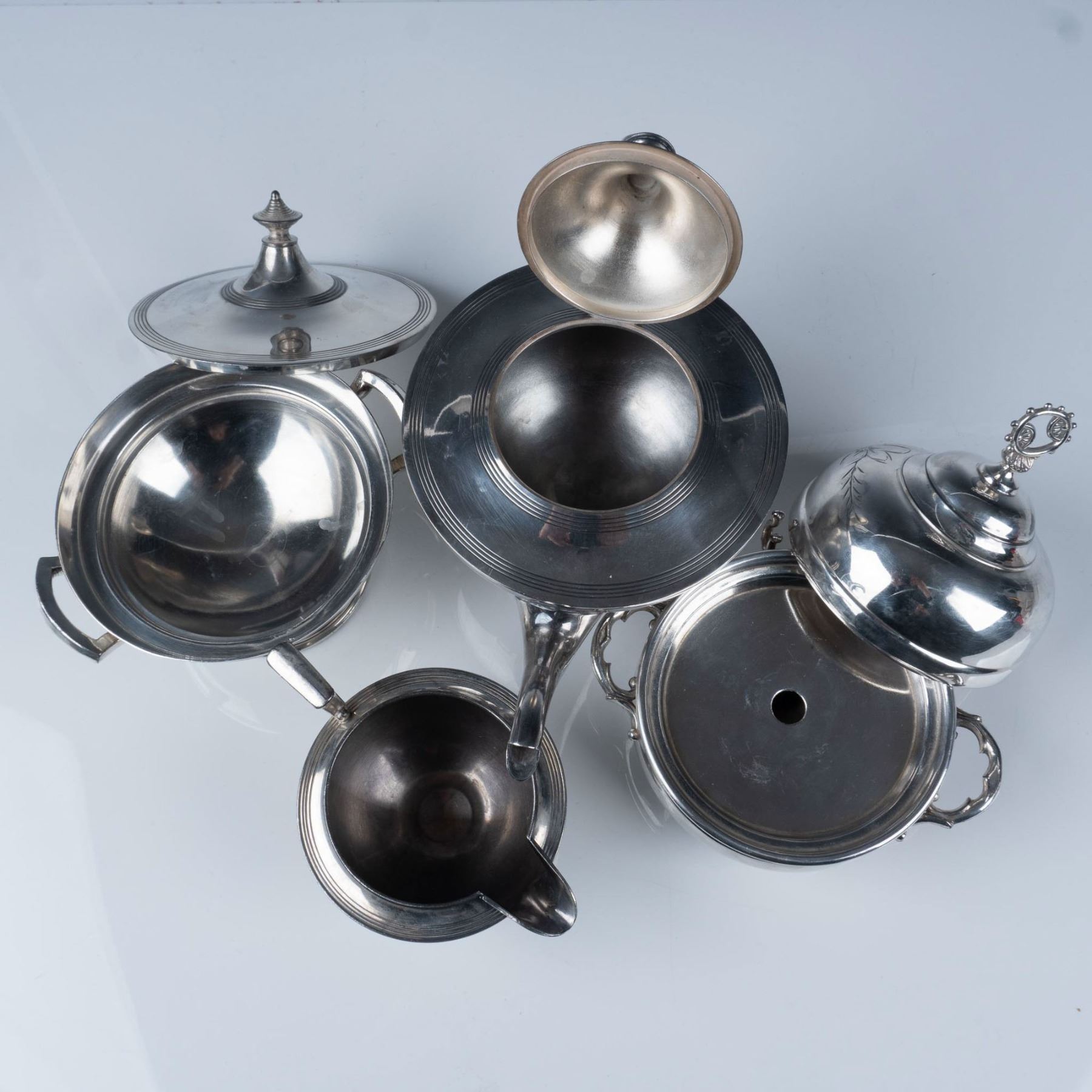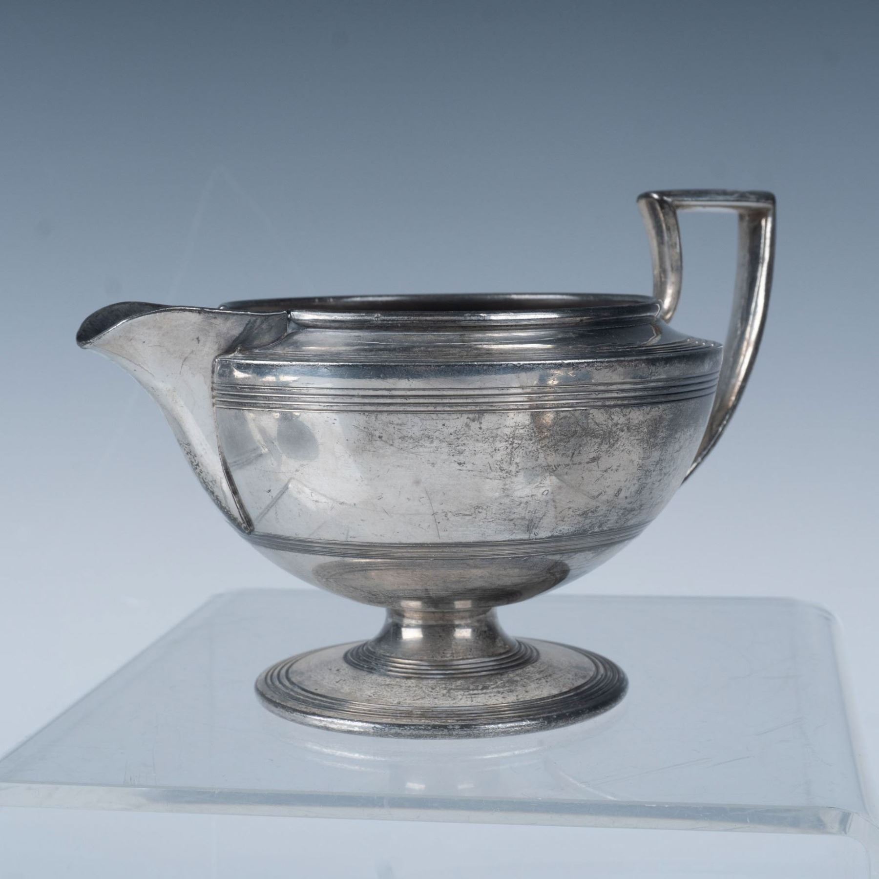 Beautiful grouping featuring a tea or coffee pot, covered sugar, creamer, and covered butter dish. Three pieces are marked Forbes, while the butter dish is marked National Silver Co. The butter dish includes a double pan for ice beneath the butter platform, adding both style and functionality. The largest piece measures 10.25"L x 6"W x 6.5"H.