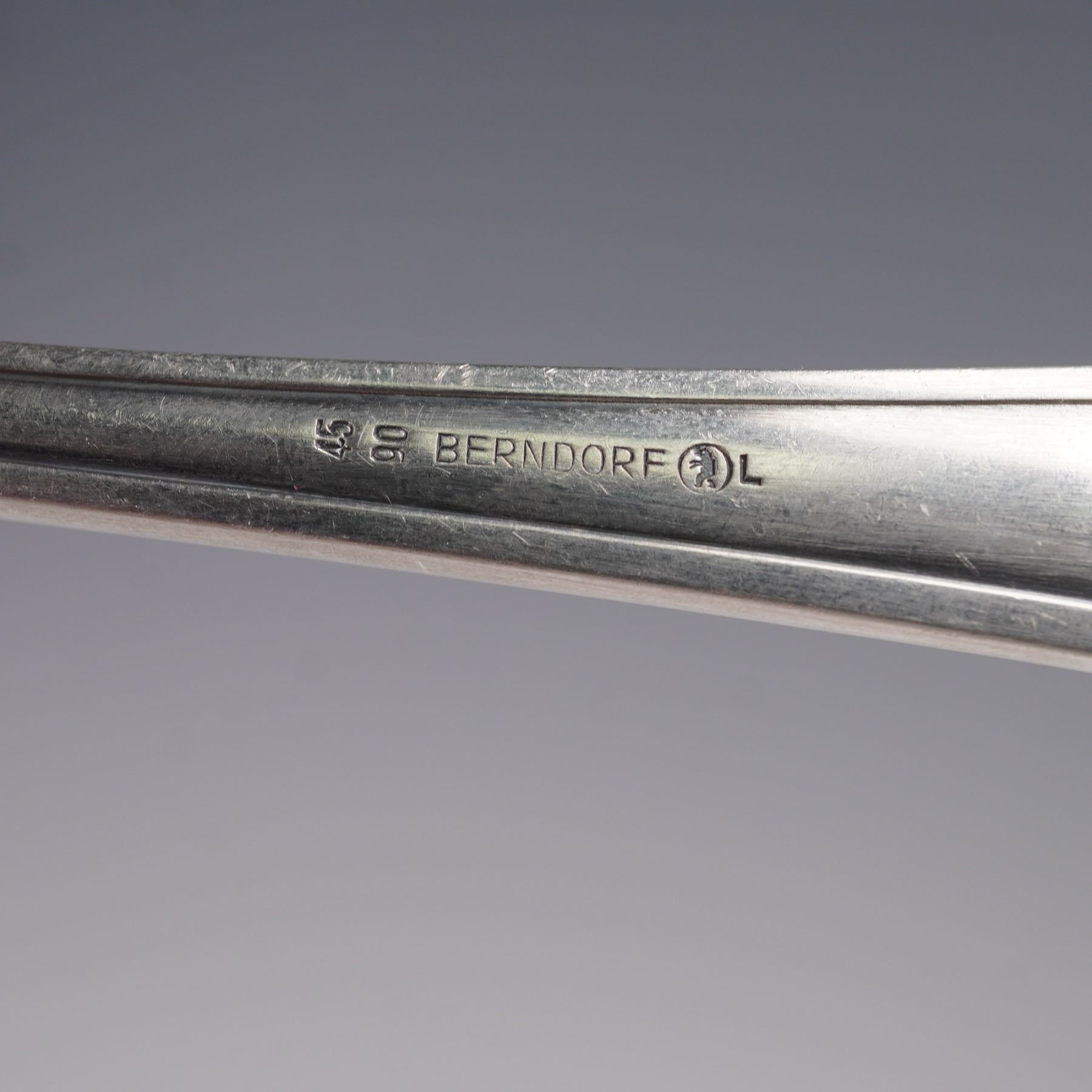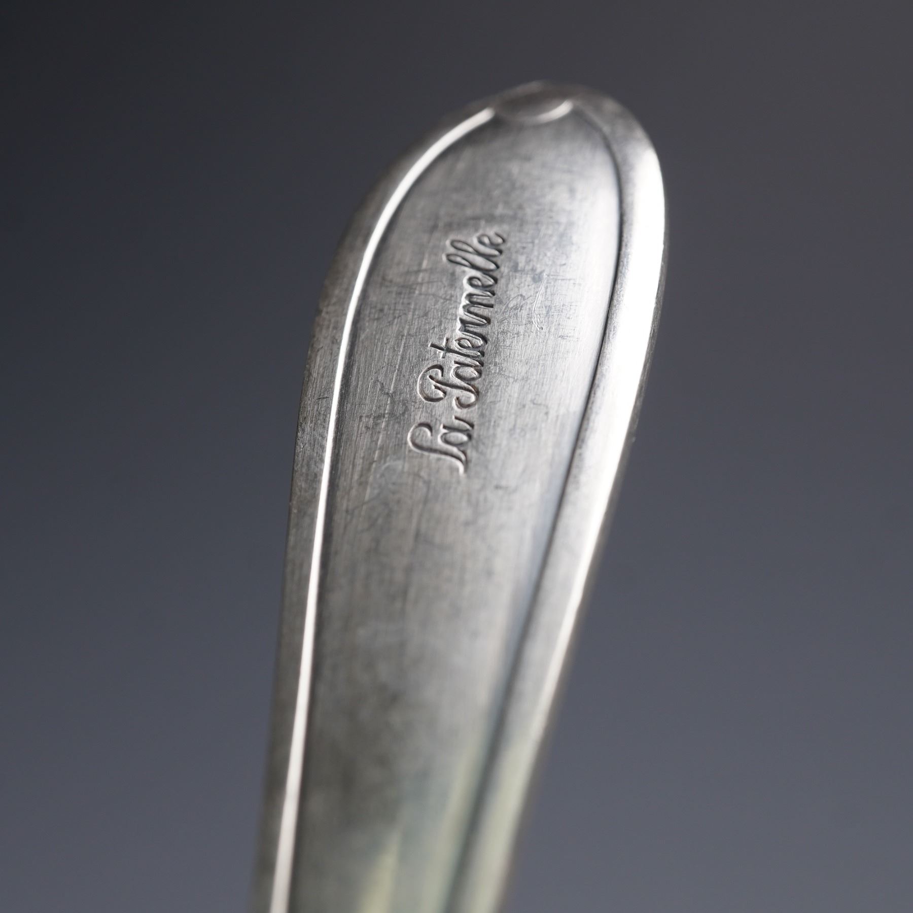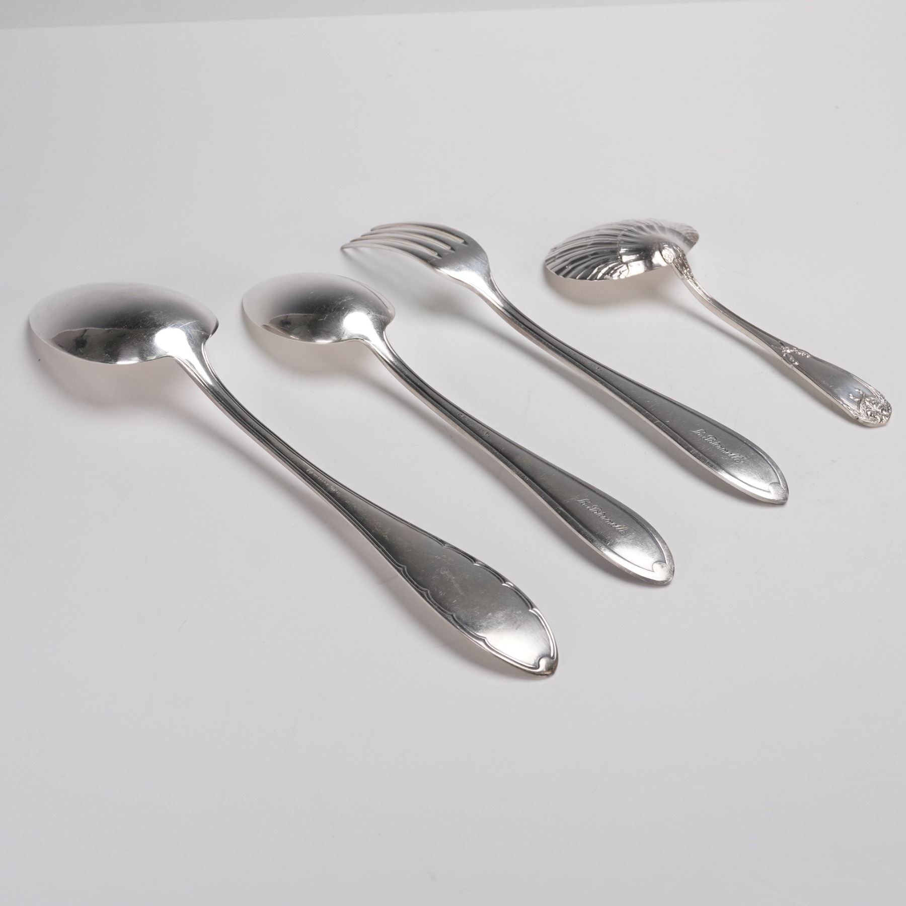 A set of four silverplated serving utensils including a serving spoon marked Wellner 90, a table spoon and fork marked 45 90 Berndorf L with a monogram that reads La Paternelle, and a shell-form serving spoon marked Blanch with an anchor passant.