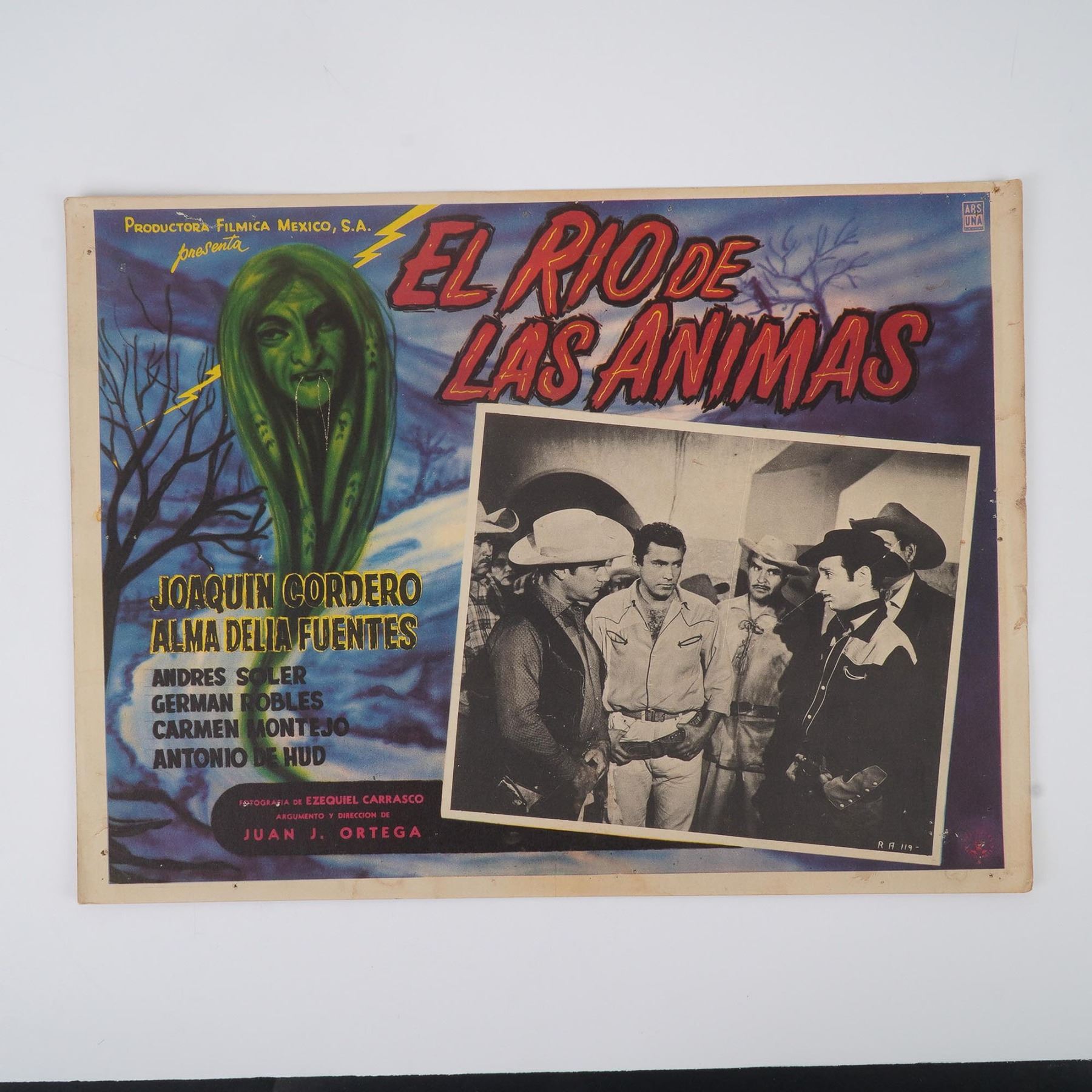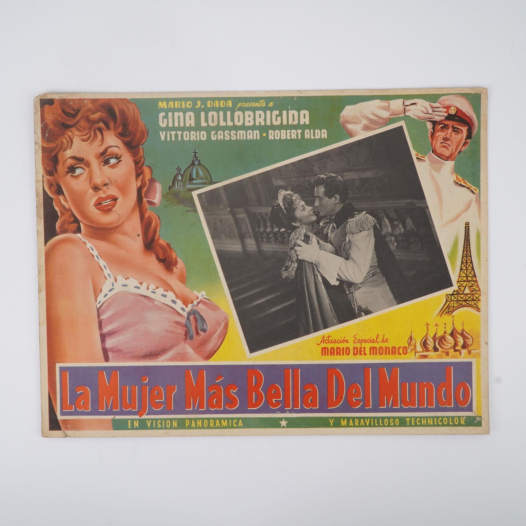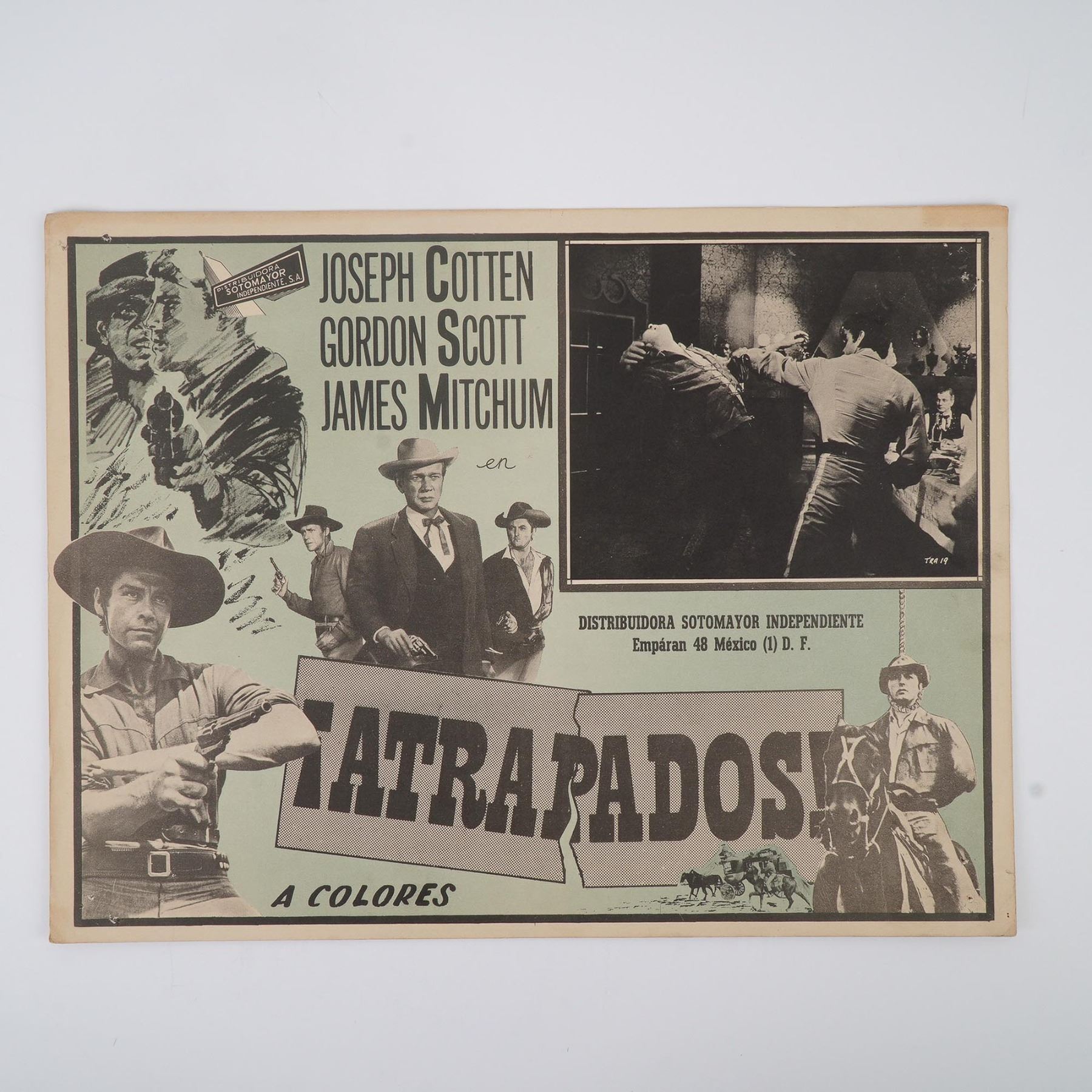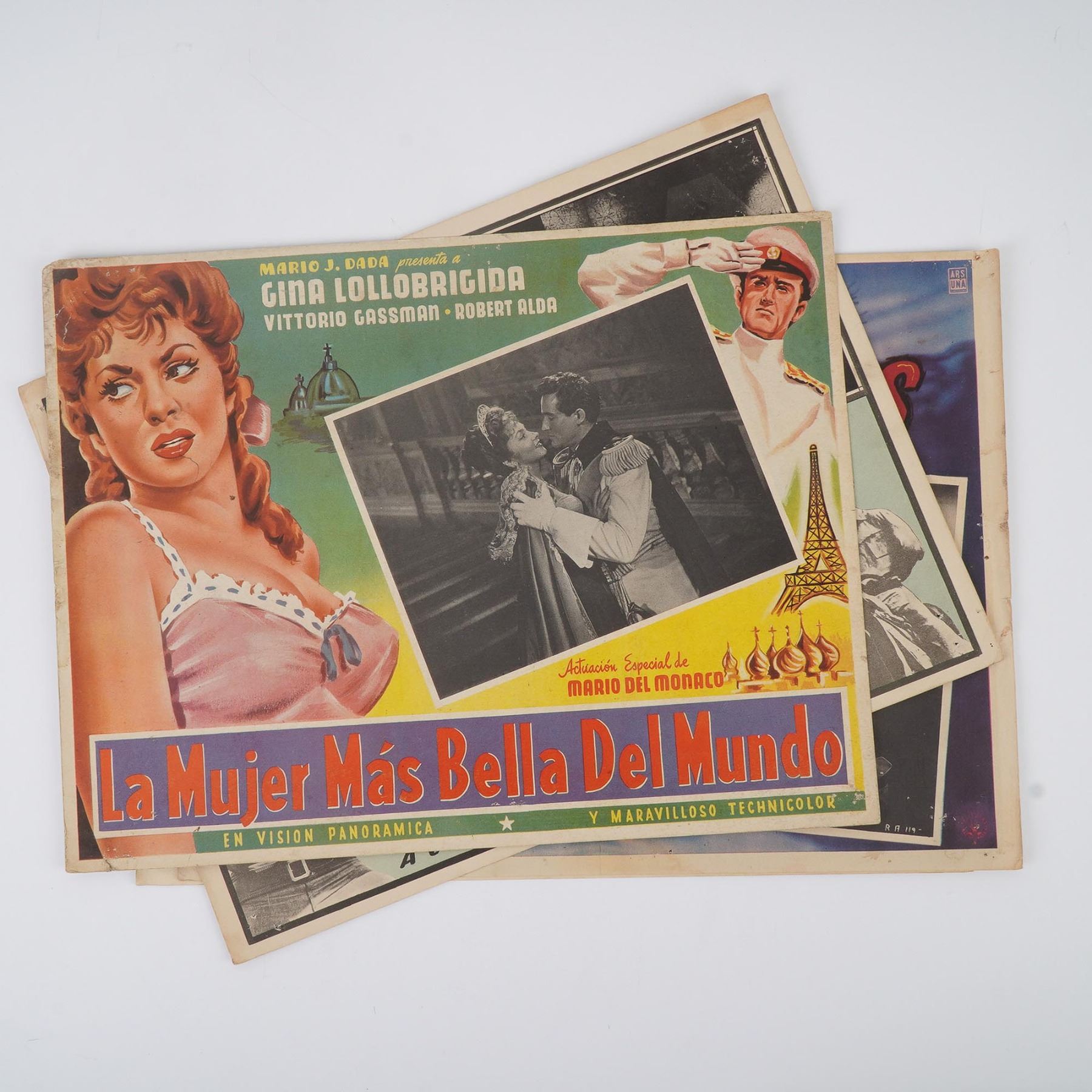Set of four vintage Mexican film display cards promoting a mix of domestic and international titles for Spanish-speaking audiences. This lot includes El Rio de las Animas (a supernatural western starring Joaquin Cordero), Atrapados (a color crime-western starring Joseph Cotten, Gordon Scott, and James Mitchum), La Mujer Mas Bella del Mundo (The Most Beautiful Woman in the World, featuring Gina Lollobrigida and Vittorio Gassman), and Un Asunto Delicado (a romantic comedy released by Metro-Goldwyn-Mayer starring Shirley Jones and Gig Young). Each card is printed with vibrant lithographic designs, expressive hand-drawn portraits, and photographic film stills. These display cards exemplify the bold graphic style of Mexican cinema advertising in the mid-20th century.