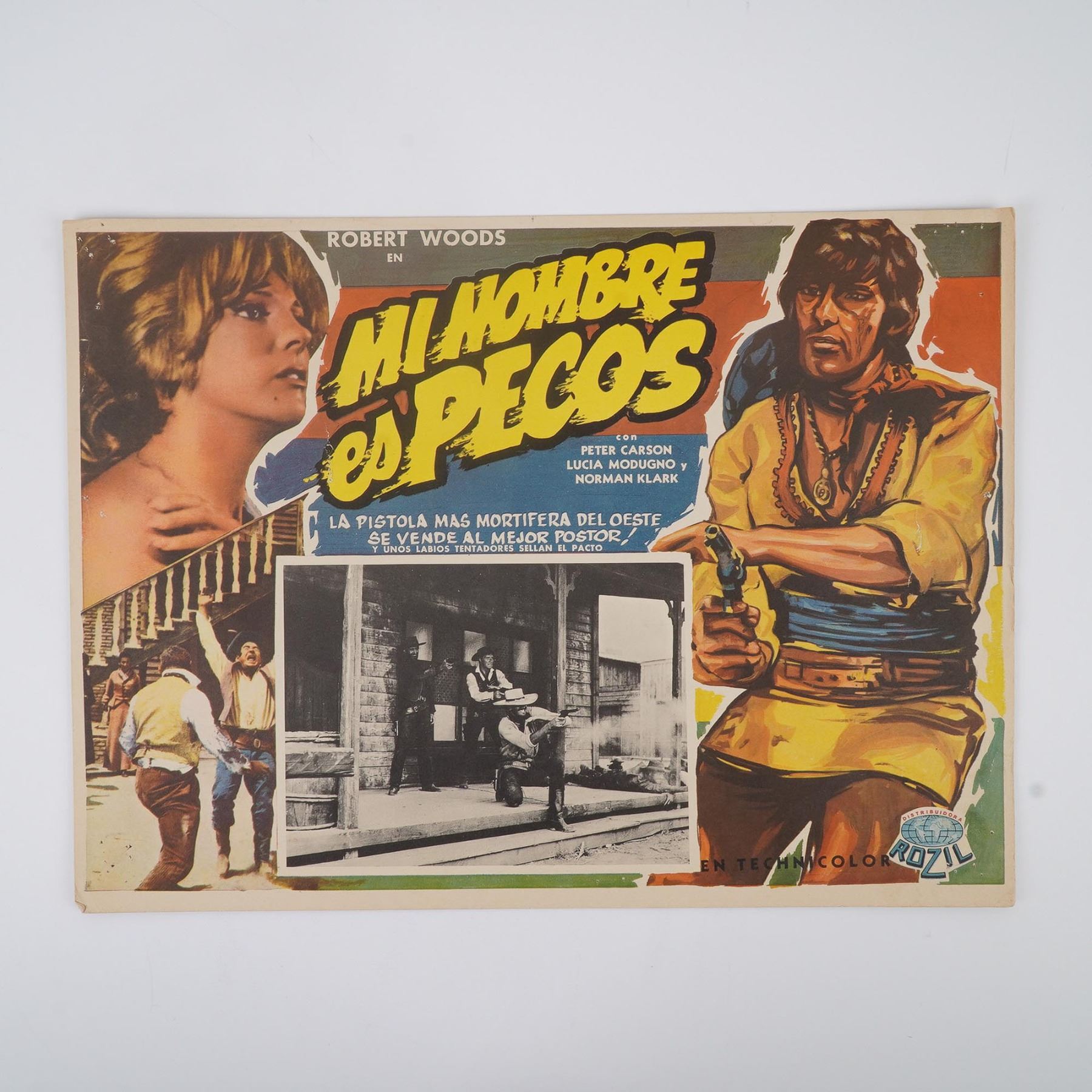 Group of four original Mexican film display cards, each printed in Spanish with vibrant lithography and photo insets, promoting a diverse range of mid-century international and domestic films. Titles include Bello Amanecer (a Puerto Rico-set romantic drama), Mendigar o Morir (an Indian social drama from Raj Kapoor), Mi Nombre es Pecos (a Technicolor Spaghetti Western starring Robert Woods), and El Grito de la Muerte (a Gothic Western horror hybrid featuring Gaston Santos). These cards showcase bold graphic styles, dramatic color palettes, and genre-spanning storytelling, from action to romance to mystery.