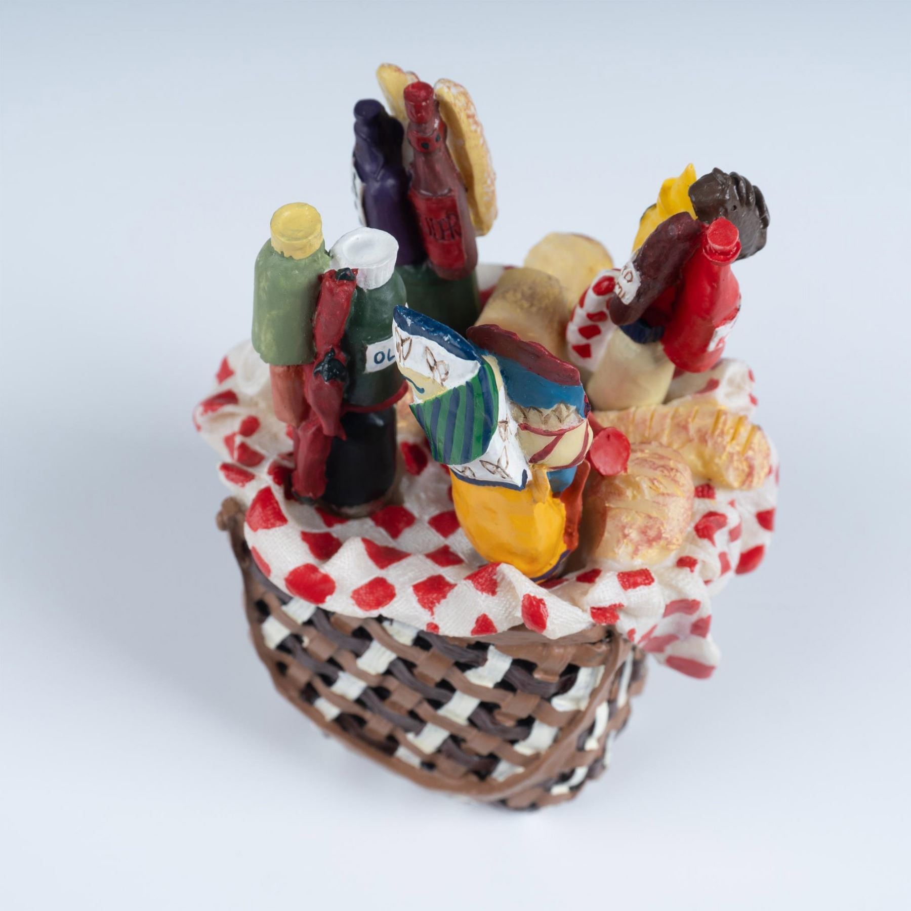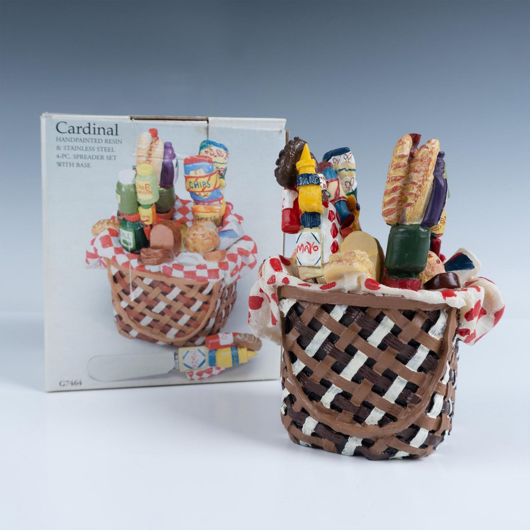 Adorable picnic basket that holds 4 stainless steel spreader knives. Each knife is decorated with picnic items and measures 5"L. The whole set measures 3"L x 3"W x 5"H. This item has its original box. Box measures 5.25"L x 4.25"W x 5.75"H.
