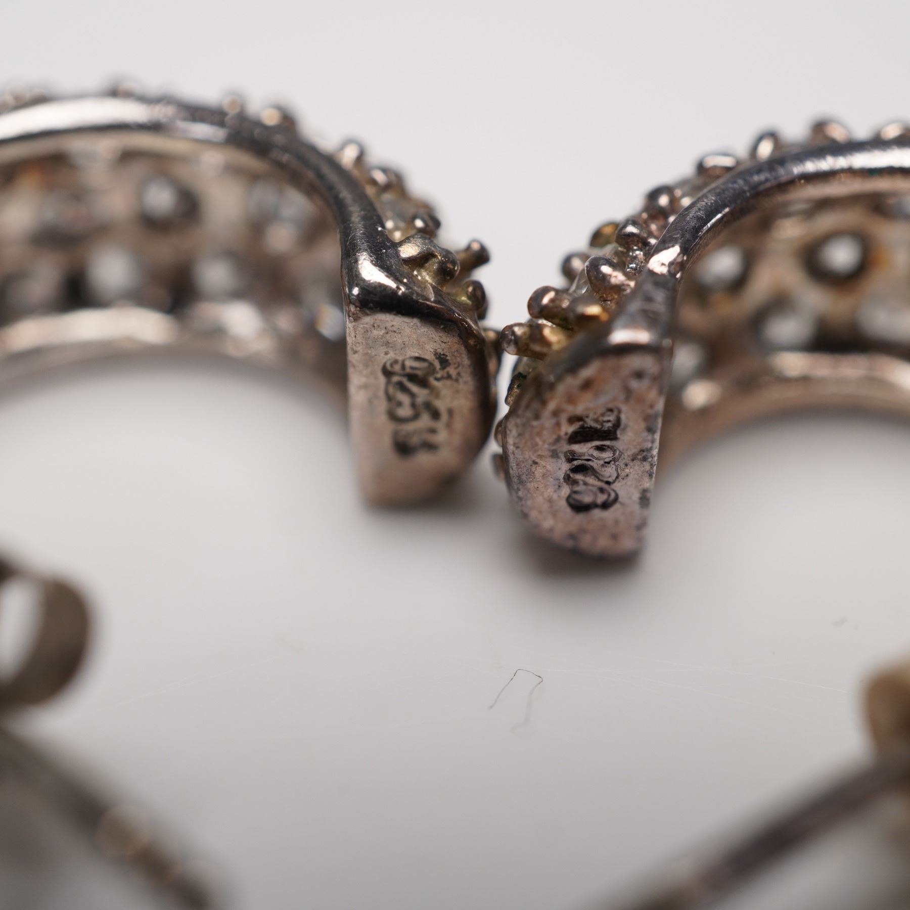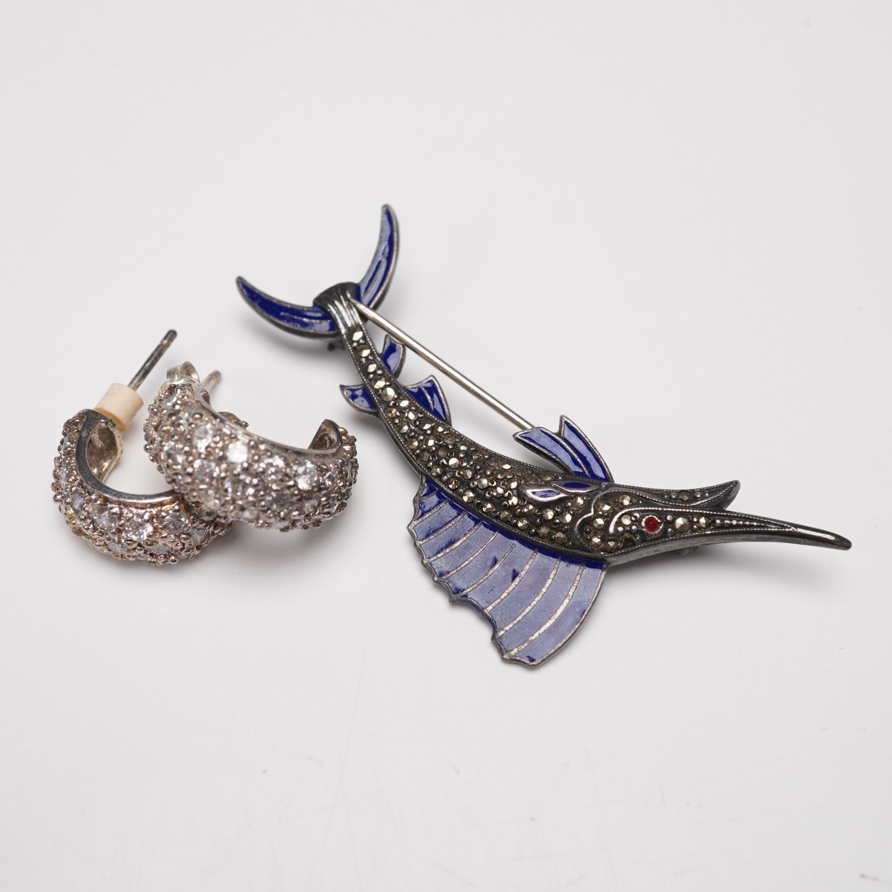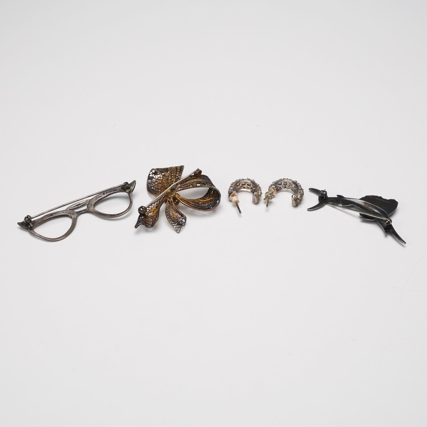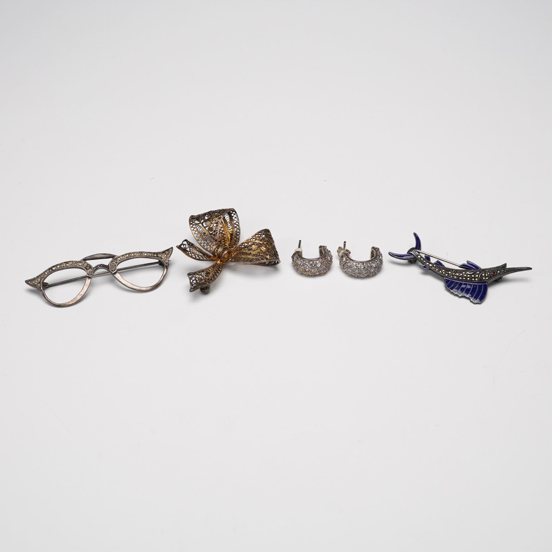 Collection of four jewelry pieces totaling five items, featuring a pair of sterling silver hoop earrings with sparkling pav-style stones, a sterling silver marlin brooch with blue enamel accents marked "Sterling," and a 925-marked eyeglass-form brooch with openwork detail. Also included is a finely crafted bow-form brooch in 800 silver with intricate filigree design. Total combined weight: 25 g.