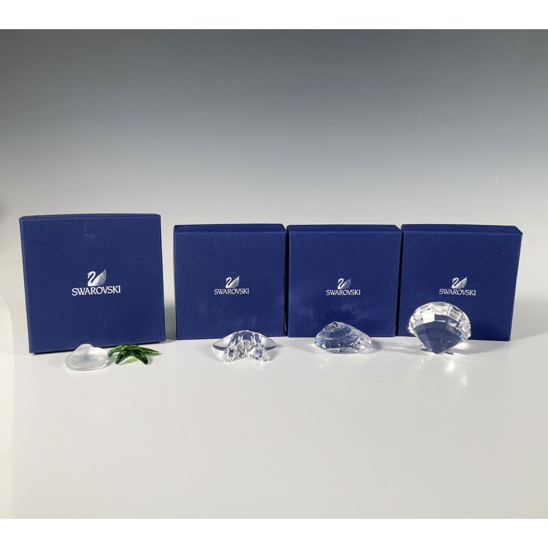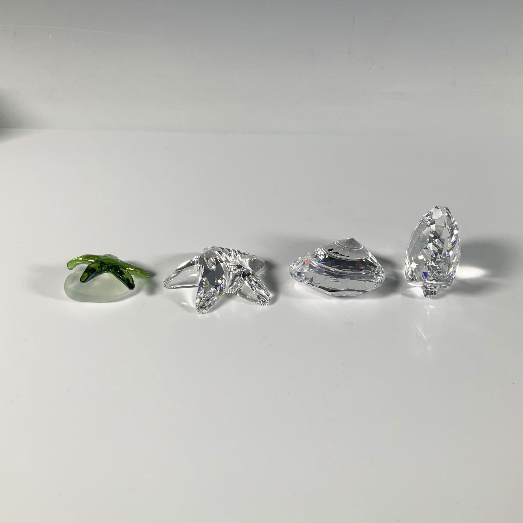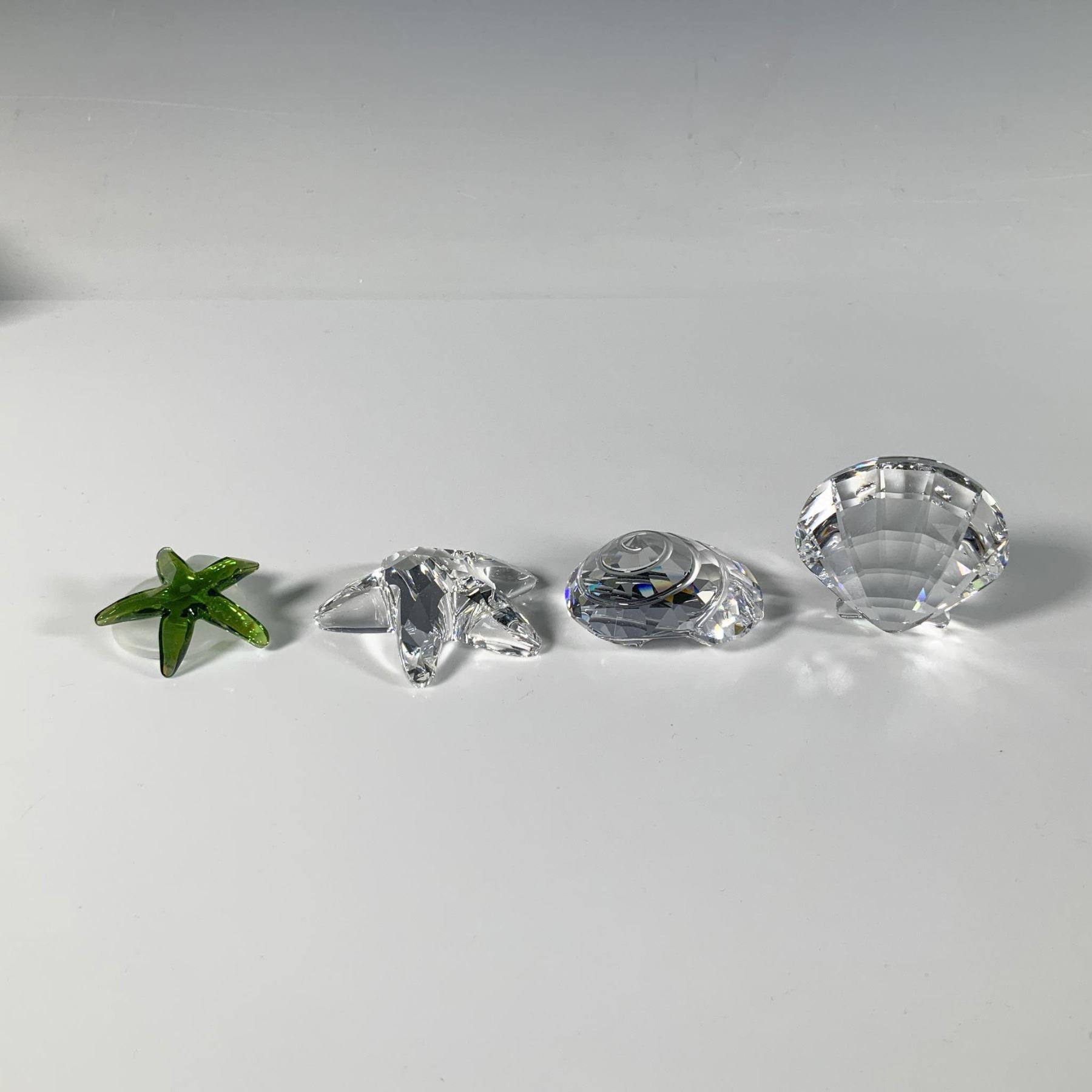 This brilliant set of cut crystal figures includes a green starfish with its frosted rock base, a clear starfish, a clear scallop, and a clear top shell. Swarovski marking. Largest figure: 2"L x 1.75"W x 1"H. Each item has its original box. Largest box: 4.5"L x 4.5"W x 2"H. Dimensions: See Description