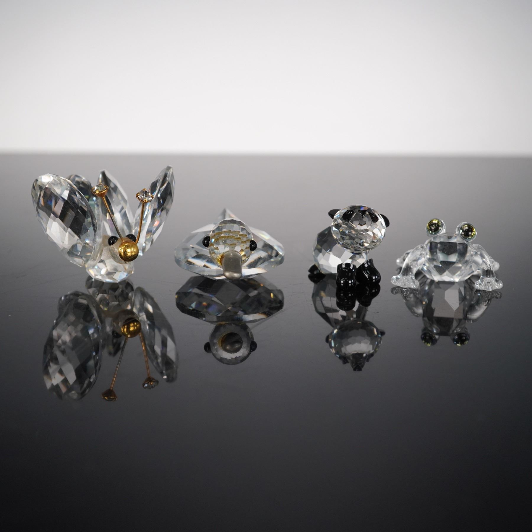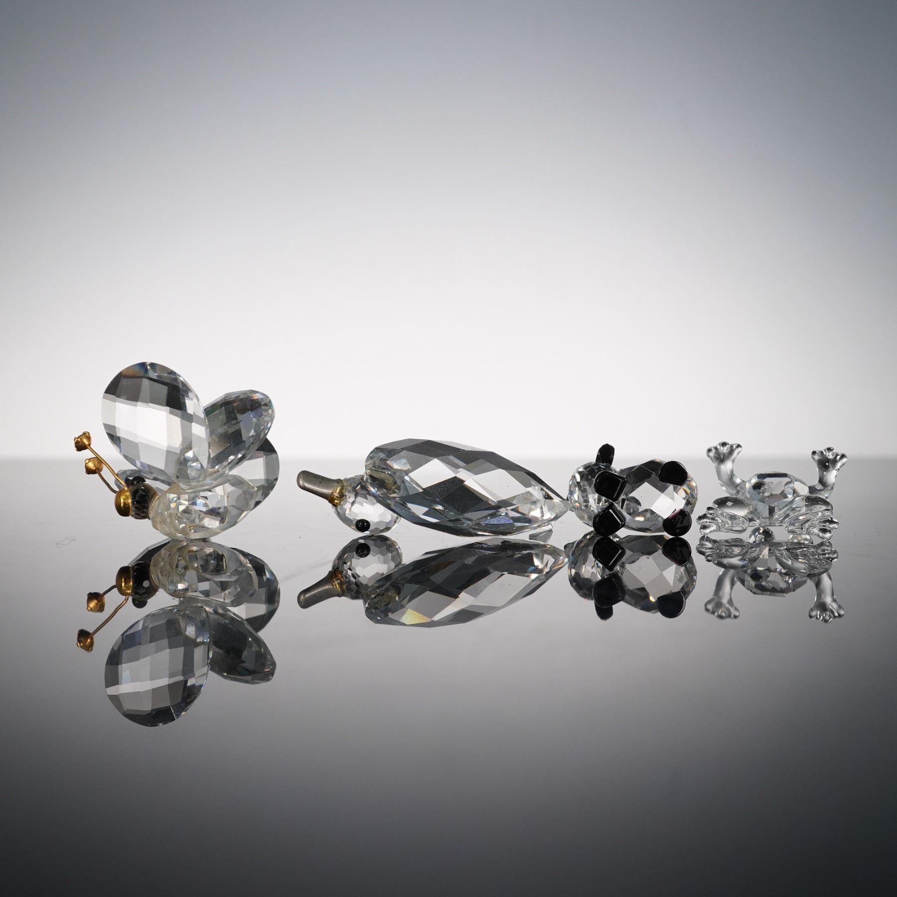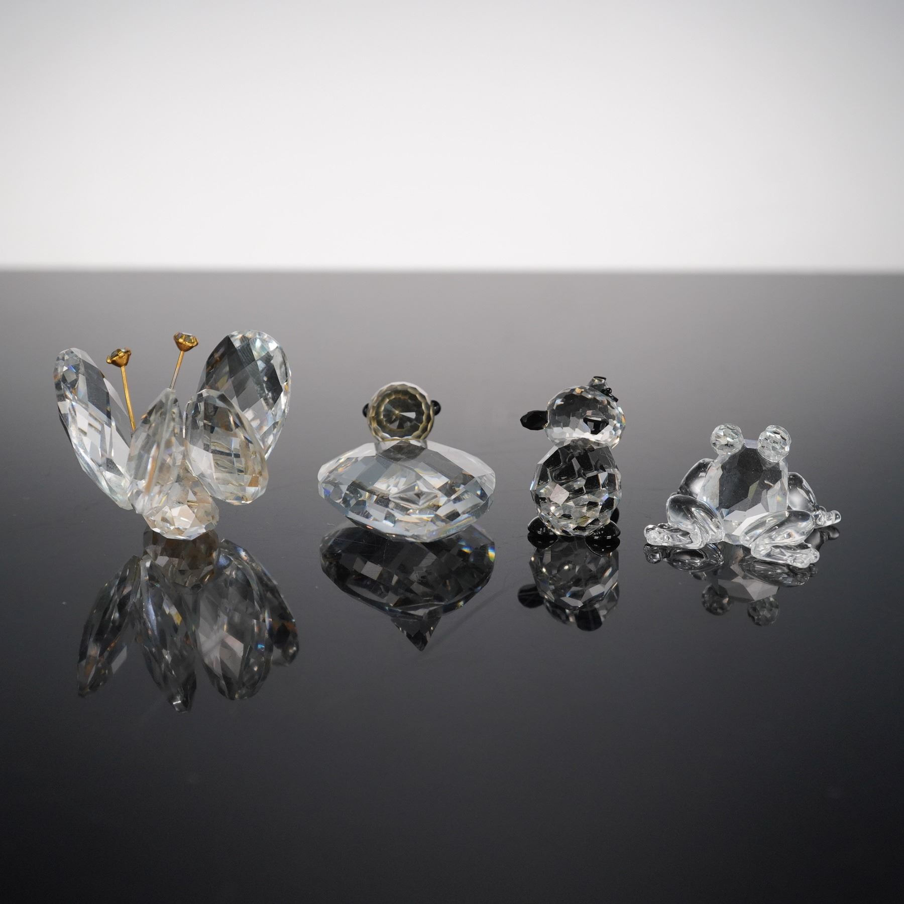 Group of four faceted clear crystal animal figurines including a butterfly with golden antennae, a duck with a silver bill, a panda with black crystal details, and a frog with green crystal eyes. Each etched with Swarovski backstamp.
