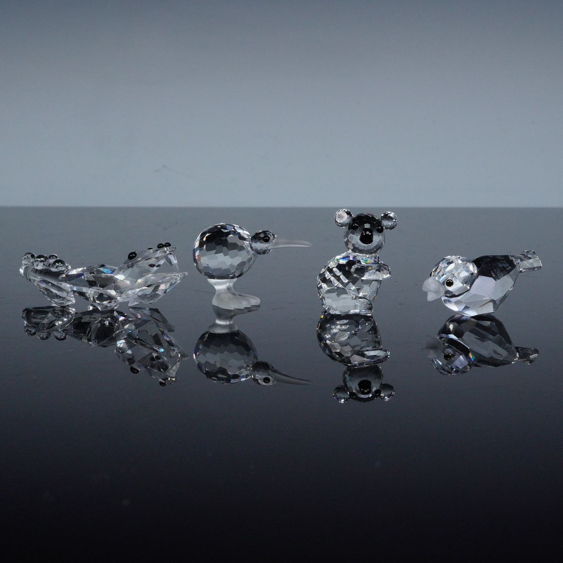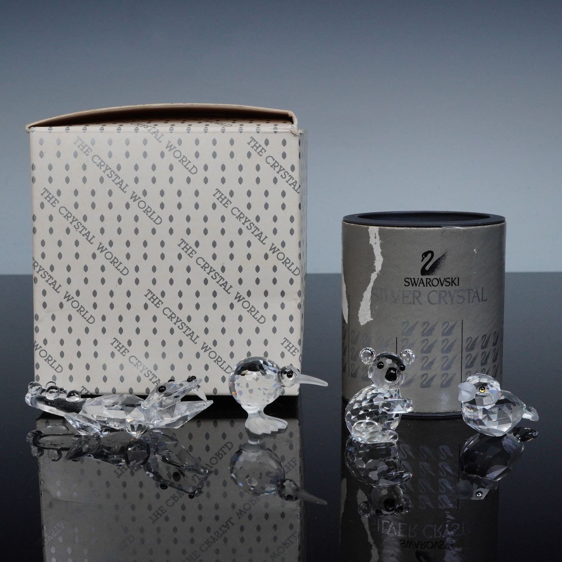 Set of four Swarovski crystal animal figurines including a kiwi bird, koala bear, sparrow, and alligator, each crafted in clear faceted crystal with black crystal eyes. The group showcases excellent clarity and detailed workmanship, reflecting Swarovski's signature precision cut. Includes original boxes marked Swarovski Silver Crystal and The Crystal World.