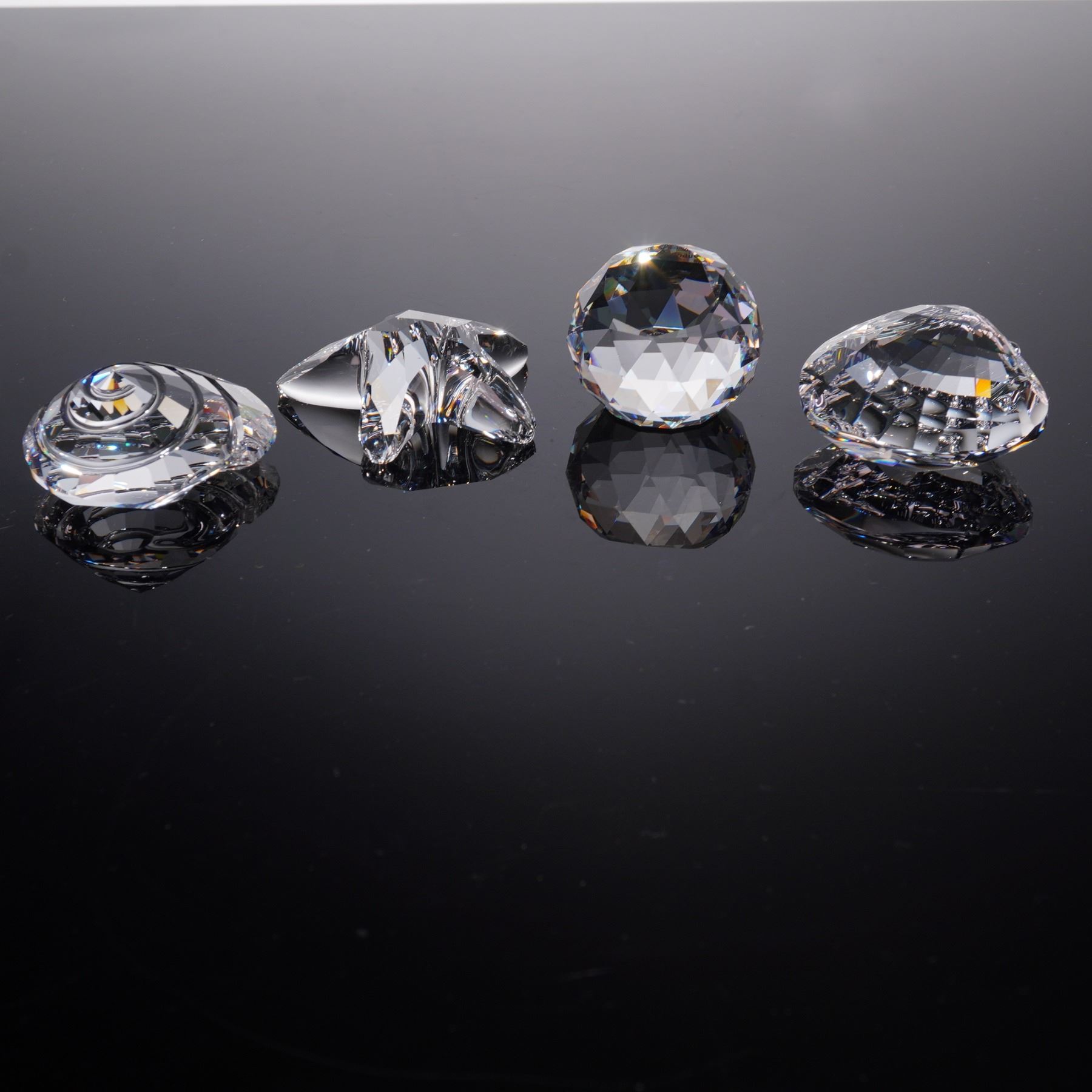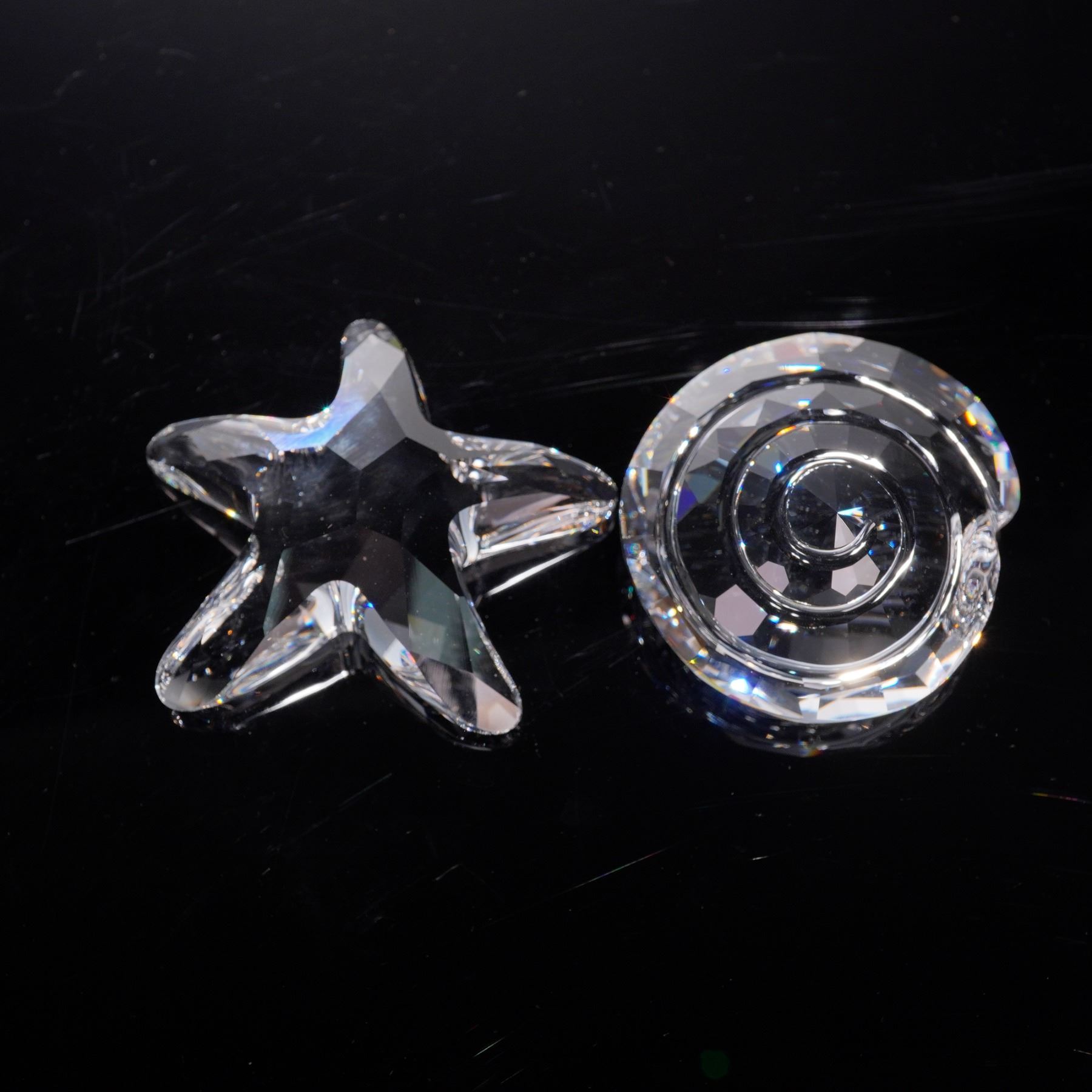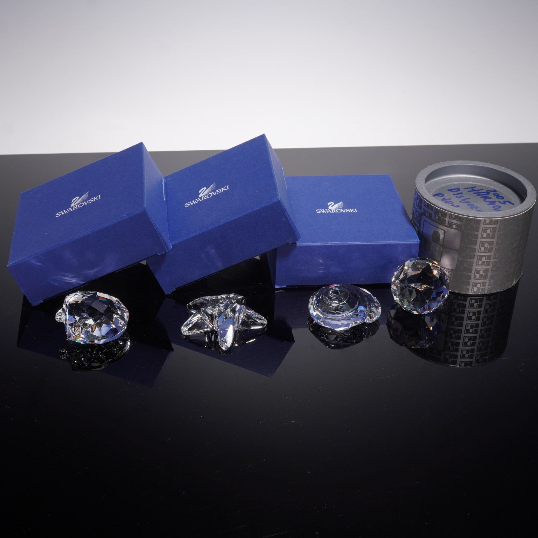 Crystal Figurines and Paperweight lot featuring pieces from the Wonders of the Sea Renewal collection and the 2005 Harmony Designer Event. The group includes intricately cut clear crystal figures in the shapes of a starfish and a shell, along with faceted crystal paperweights, one engraved with a clown fish motif commemorating the 2005 event. Each piece bears the Swarovski swan hallmark .This item has its original box. Starfish: 2.25"L x 0.25"W x 2"H. Scallop: 1.75"L x 1"W x 2"H. Top shell: 2"L x 0.75"W x 2"H. Harmony event paperweight: 1.5"L x 1"W x 1.25"H.