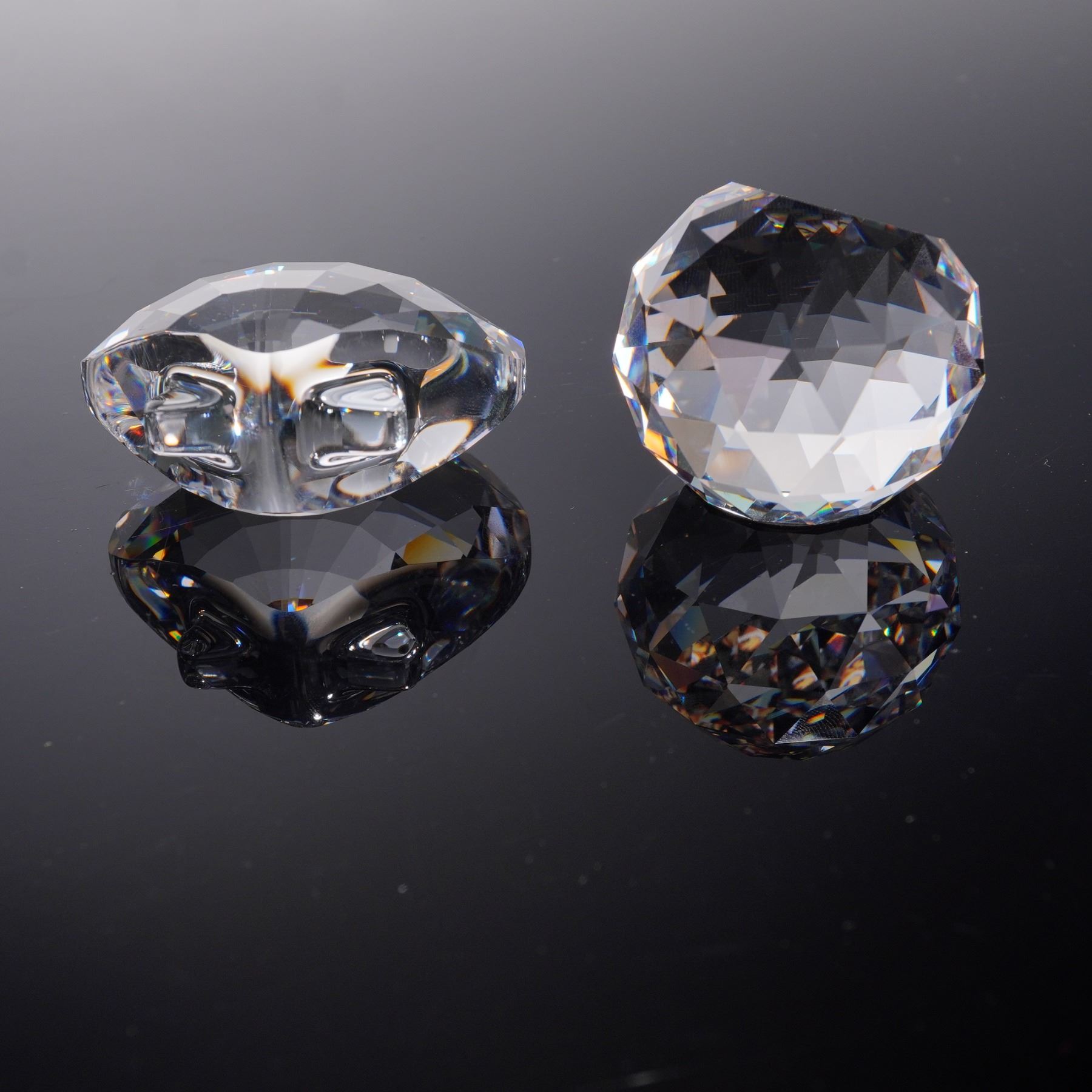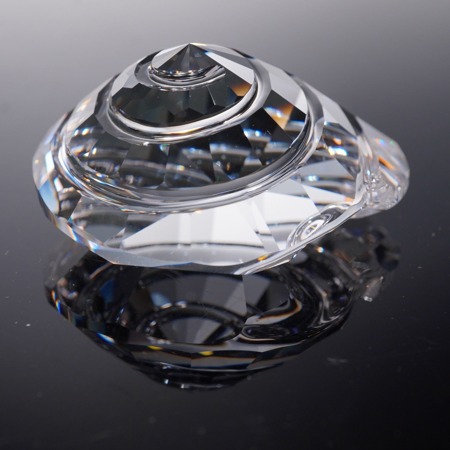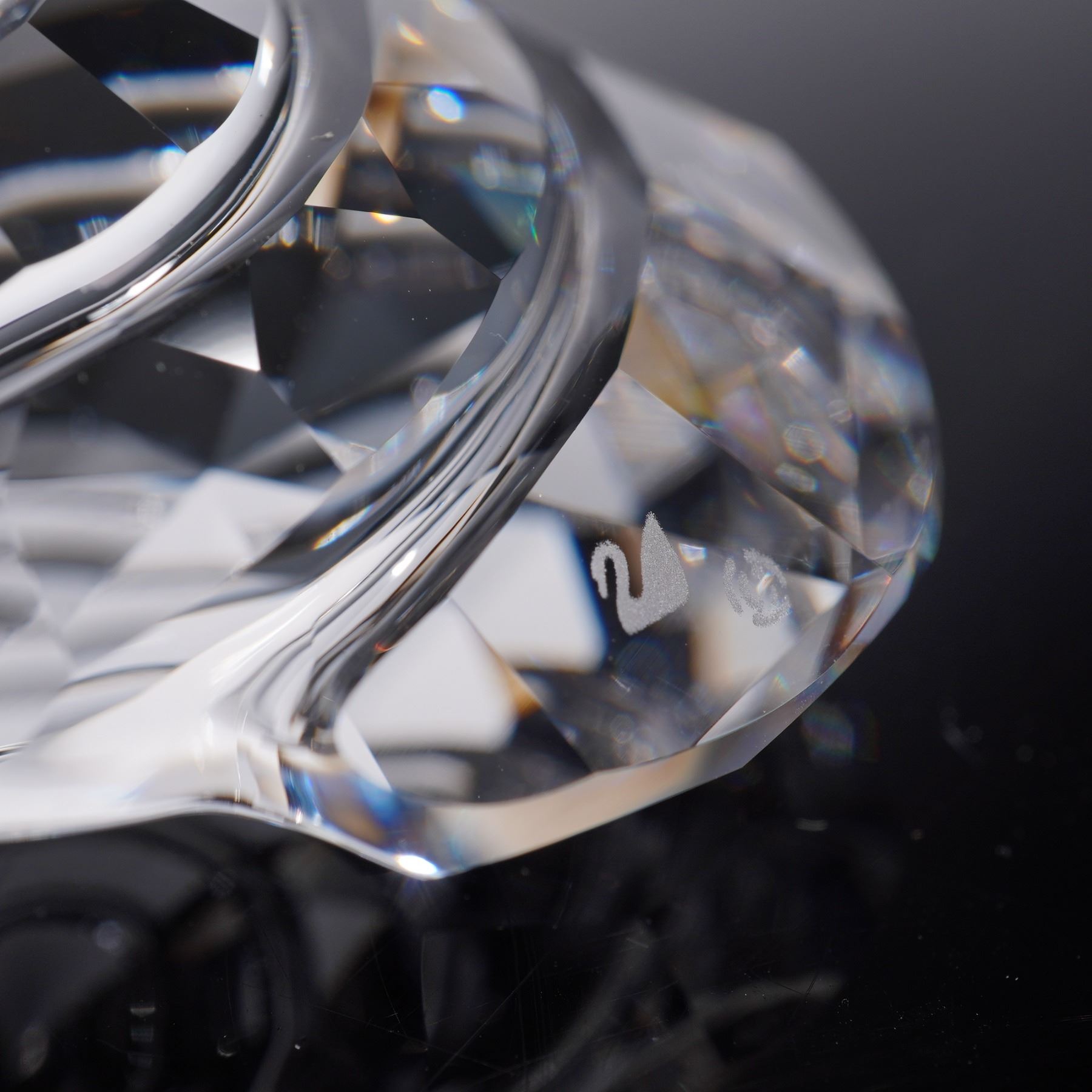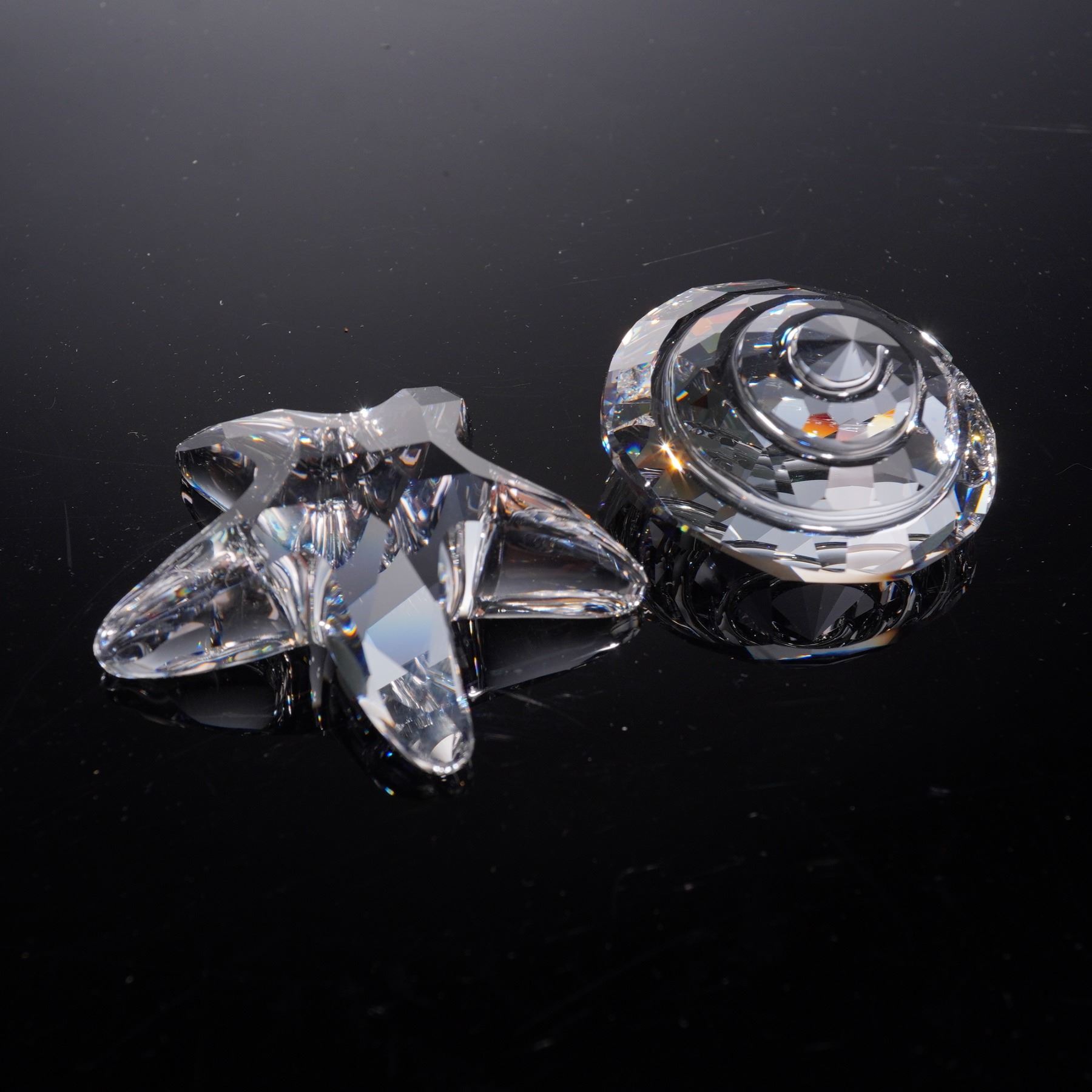 Crystal Figurines and Paperweight lot featuring pieces from the Wonders of the Sea Renewal collection and the 2005 Harmony Designer Event. The group includes intricately cut clear crystal figures in the shapes of a starfish and a shell, along with faceted crystal paperweights, one engraved with a clown fish motif commemorating the 2005 event. Each piece bears the Swarovski swan hallmark .This item has its original box. Starfish: 2.25"L x 0.25"W x 2"H. Scallop: 1.75"L x 1"W x 2"H. Top shell: 2"L x 0.75"W x 2"H. Harmony event paperweight: 1.5"L x 1"W x 1.25"H.