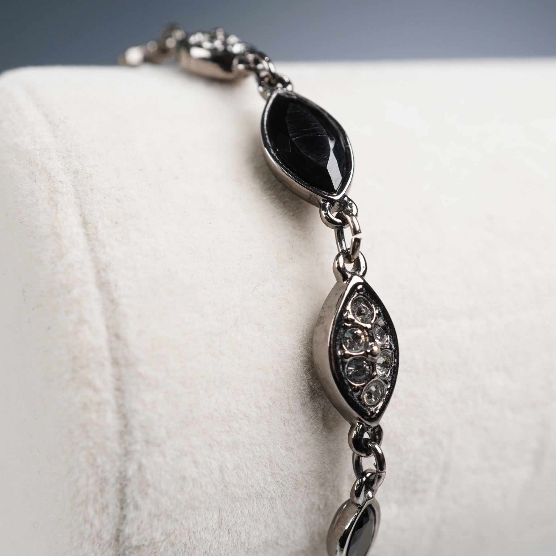 A stylish four-piece Swarovski crystal jewelry set including a necklace, bracelet, and earrings. Each piece features marquise-shaped links accented with clear Swarovski crystals and faceted black crystal elements, all set in silvertone metal. The necklace showcases a delicate drop design, while the matching earrings and bracelet complete the coordinated look. All pieces are marked Swarovski.