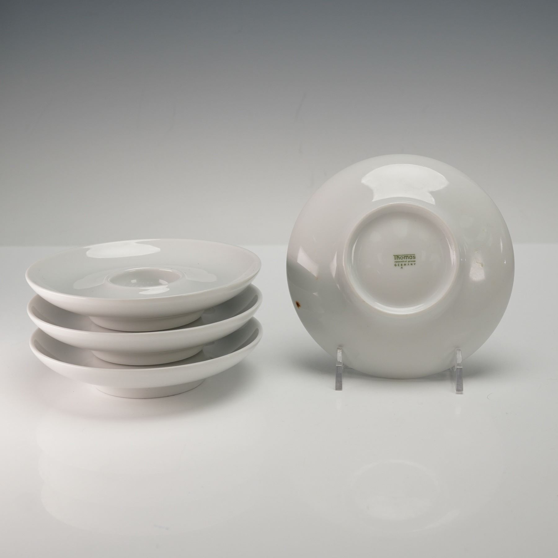 Each formed as a shallow circular dish with a raised central well designed to securely accommodate a taper candle, displaying smooth, clean lines and a uniform white glaze; the underside of each piece bears the "Thomas" logo, identifying the manufacturer within the Rosenthal group, and the set collectively reflects a consistent design profile with gently flared rims and slightly elevated bases, offering four matching functional components intended for candle display.