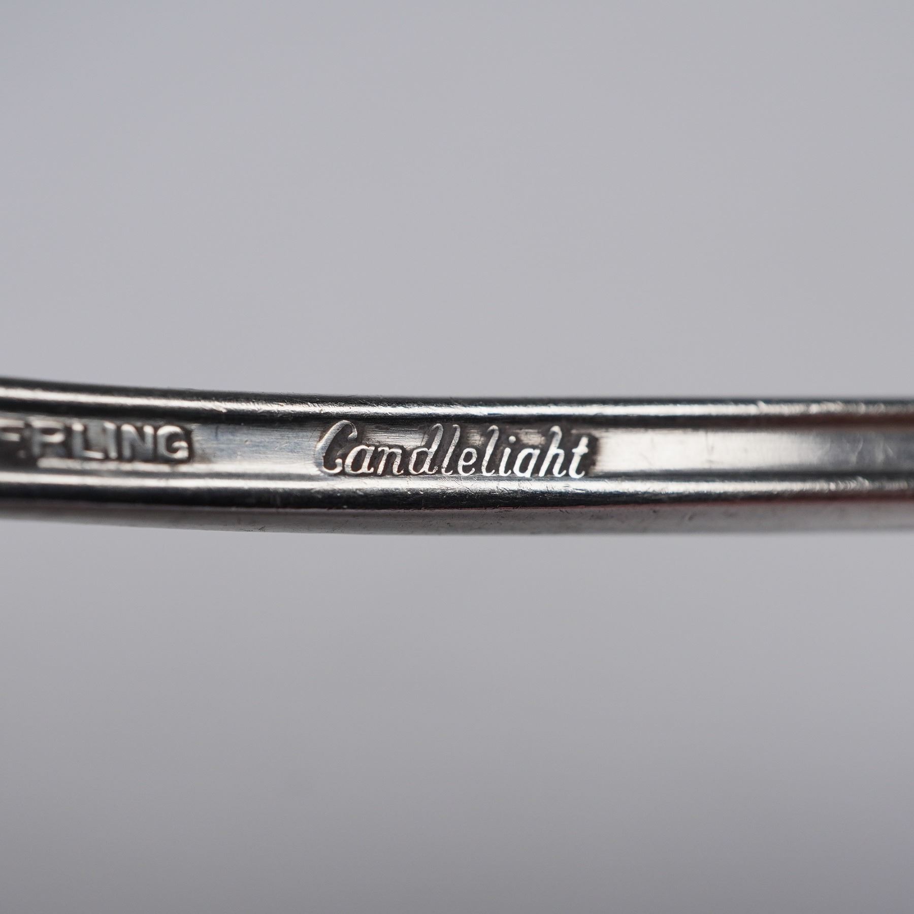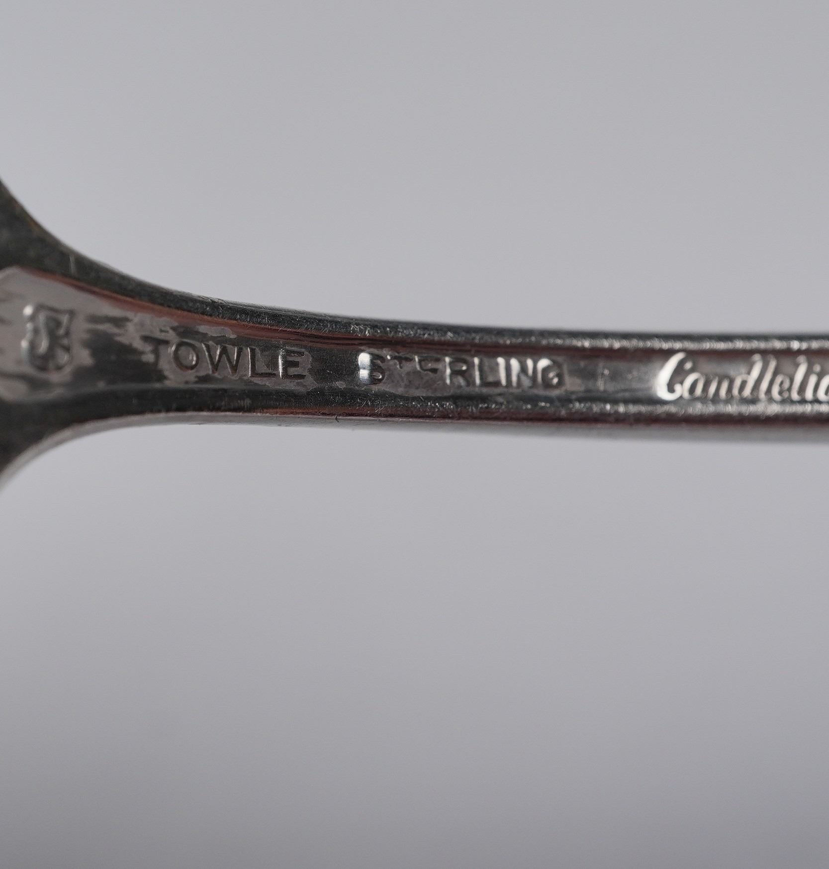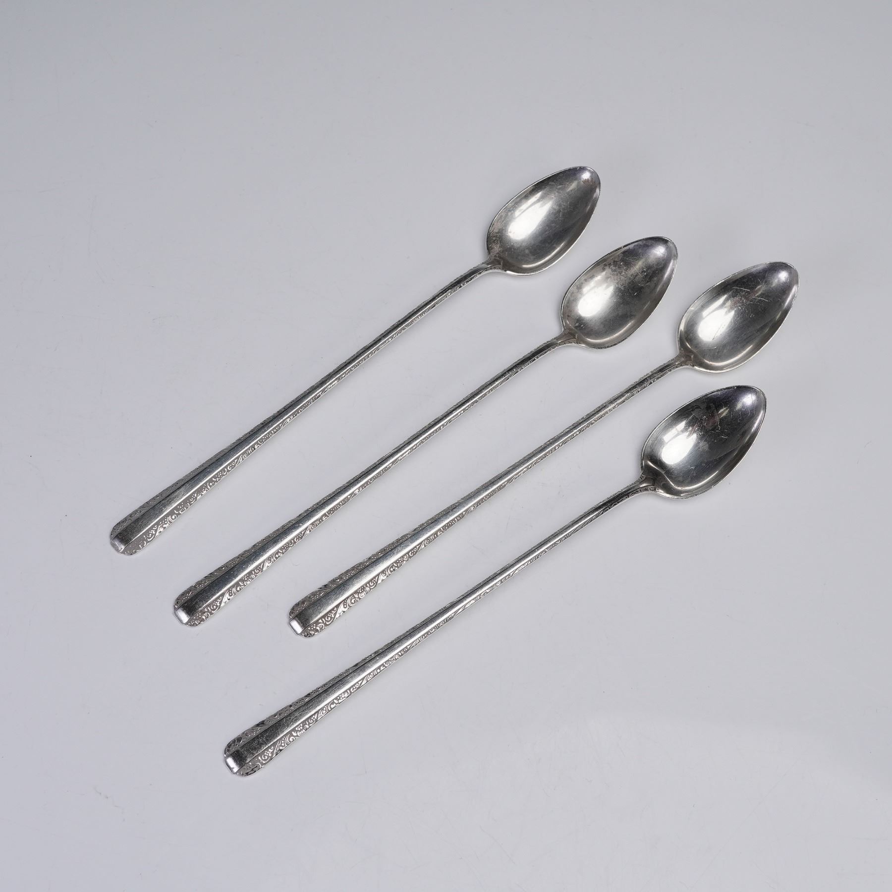 A 4 piece set of Towle sterling silver iced tea spoons in the Candlelight pattern, introduced in 1934. Inspired by Renaissance embroidery, the Candlelight pattern blends aristocratic elegance with lasting versatility, making it a popular choice for pairing with many china and crystal settings. Each piece is marked Towle Sterling Candlelight. Combined Net Silver 3.75 troy oz.