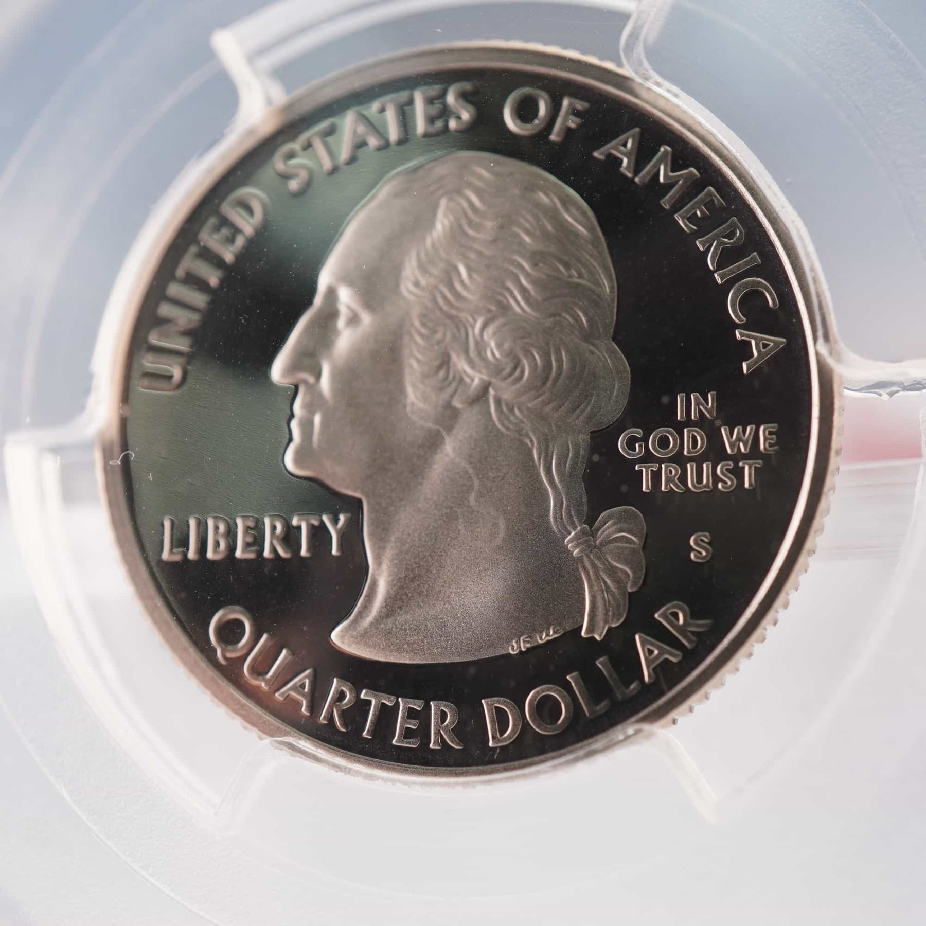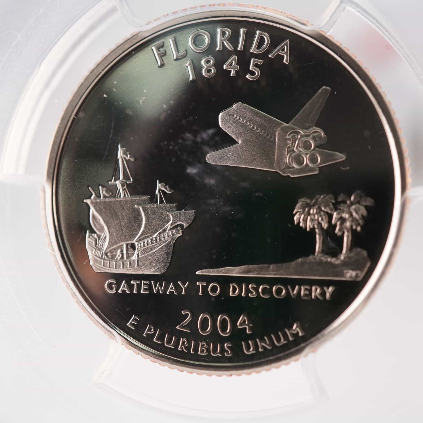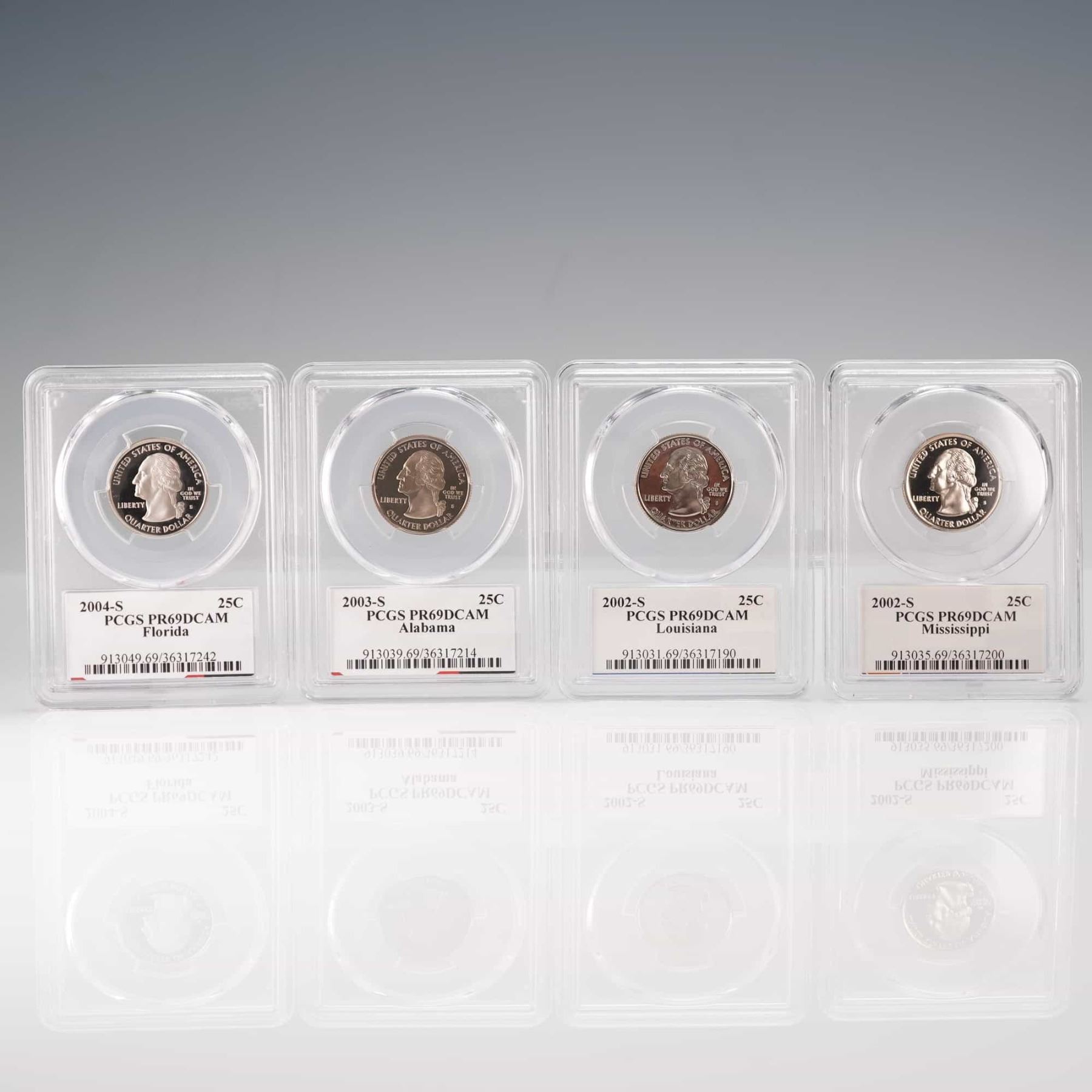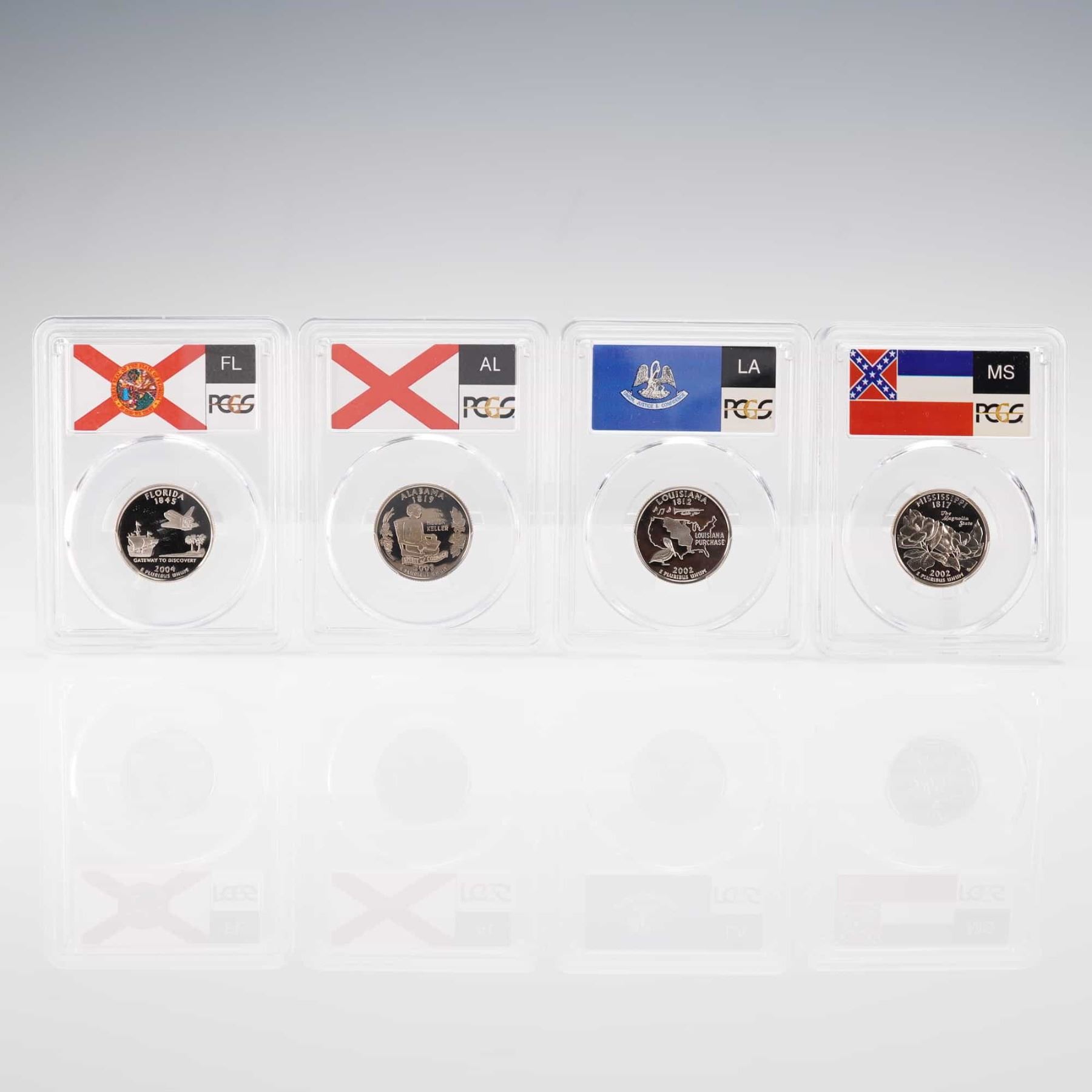 A collection of four US Quarter Dollar coins (25c) from the 50 State Quarters Program. All coins are San Francisco (S) Mint proof issues. The lot includes the 2002-S Mississippi, 2002-S Louisiana, 2003-S Alabama, and 2004-S Florida quarters. Obverse design is the Washington profile by John Flanagan.& nbsp;All coins housed in professionally graded PCGS slabs. All coins housed in professionally graded PCGS slabs.