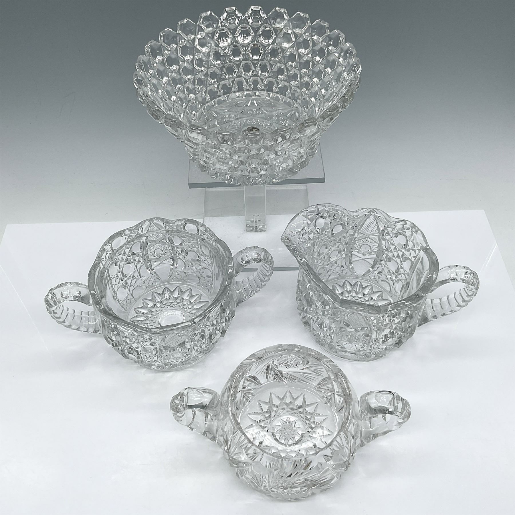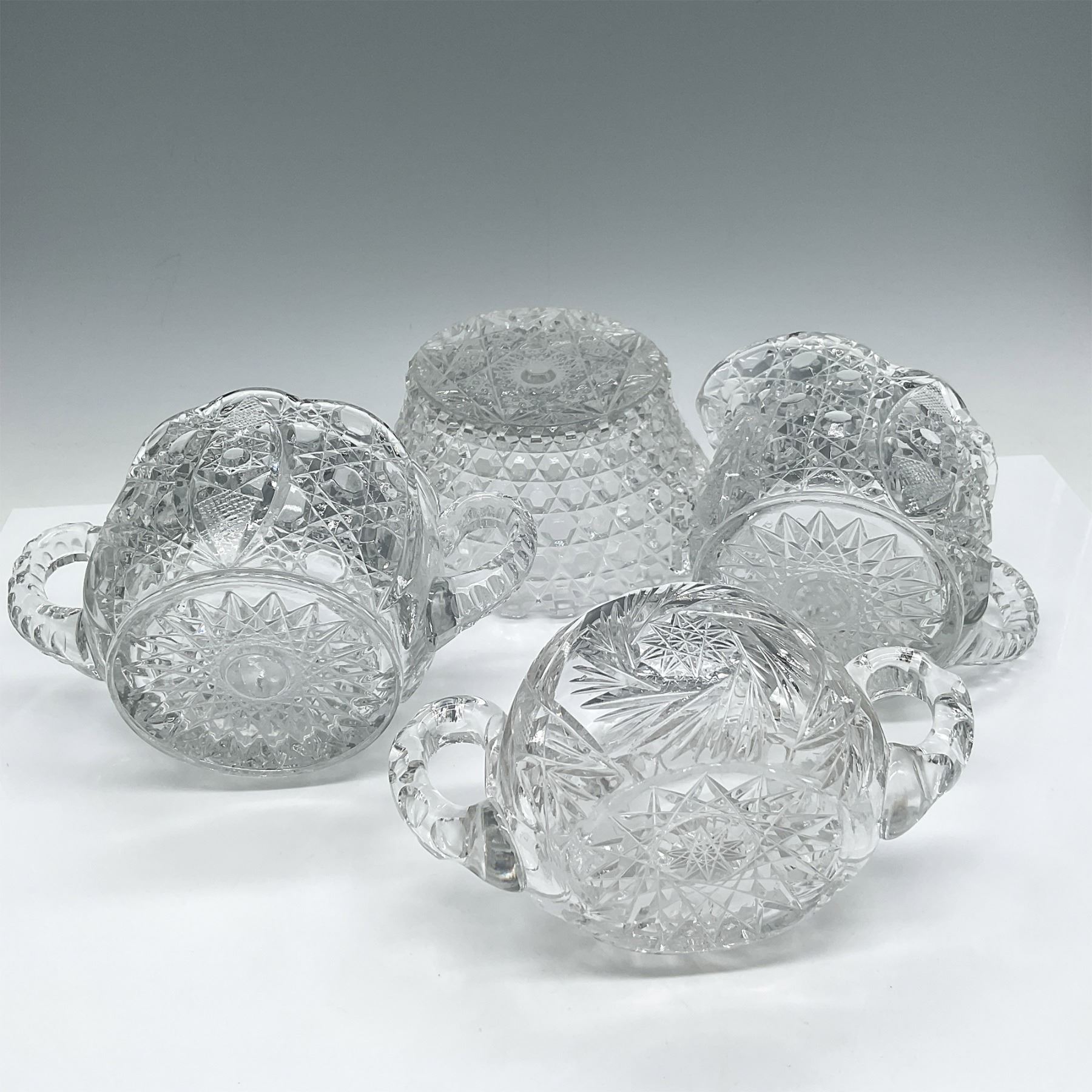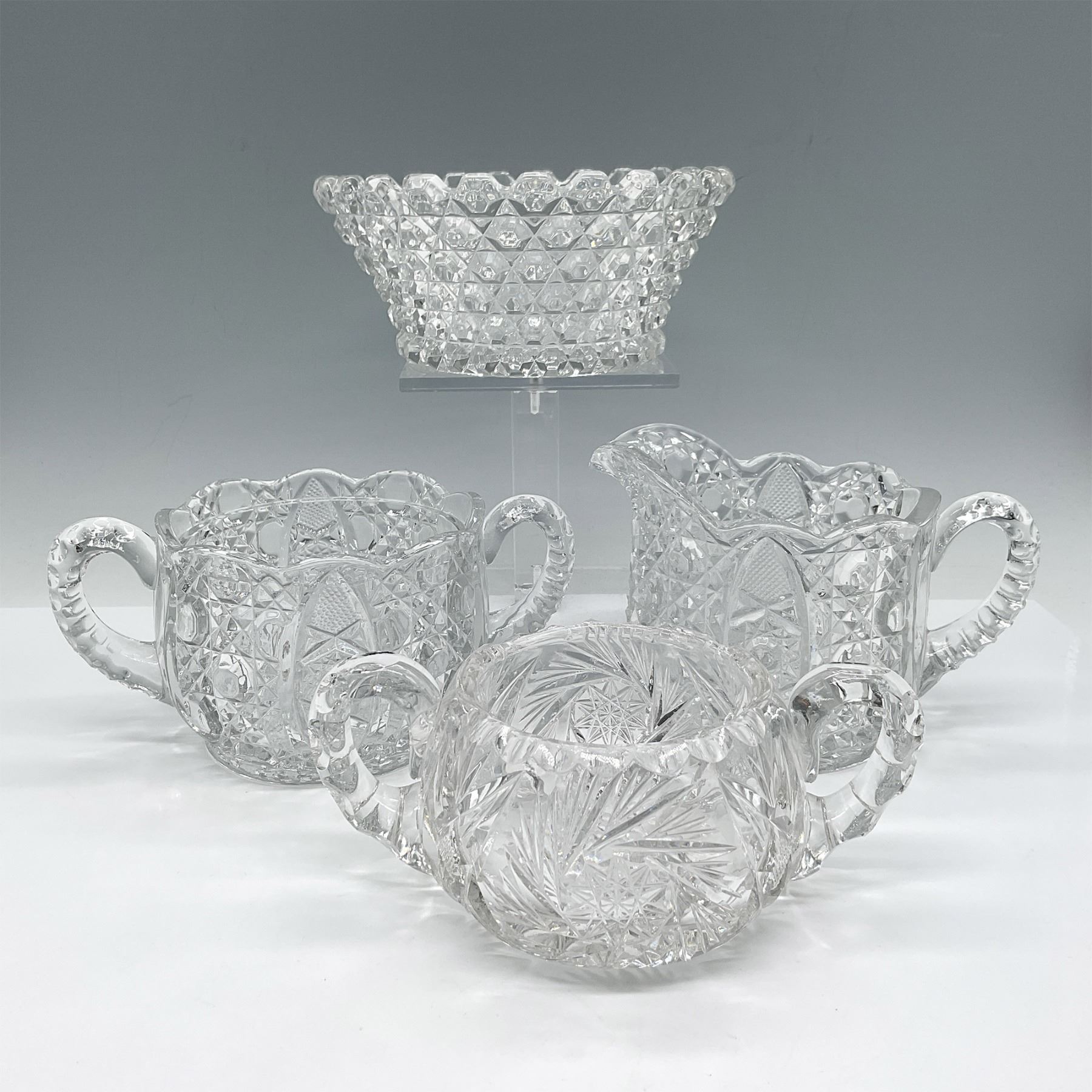 Lovely cut and designed items with pinwheels, starburst and cross hatches. Pieces included Creamer jug (6"L); decorative bowl (6" dia.); dual handled sugar bowl - no cover (7"L); and dual handled sugar bowl (6.25"L). Largest piece 3"H x 6" dia.