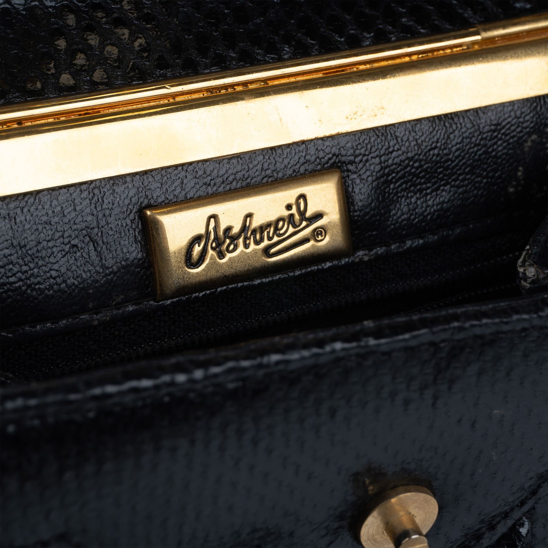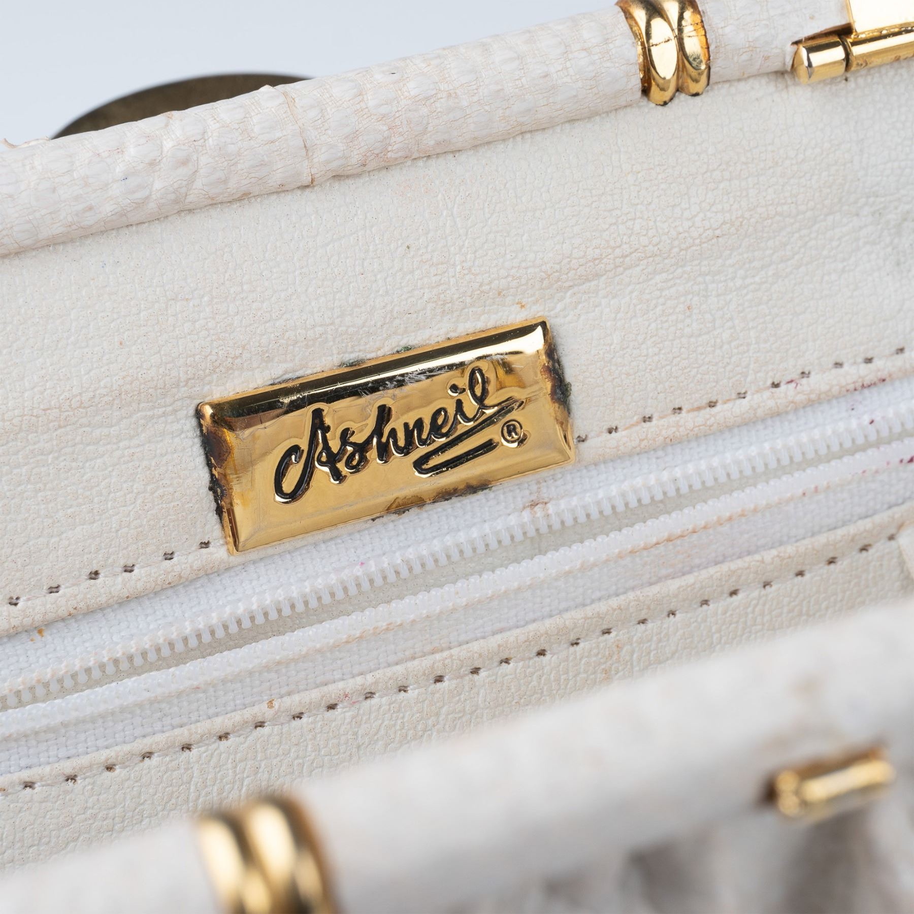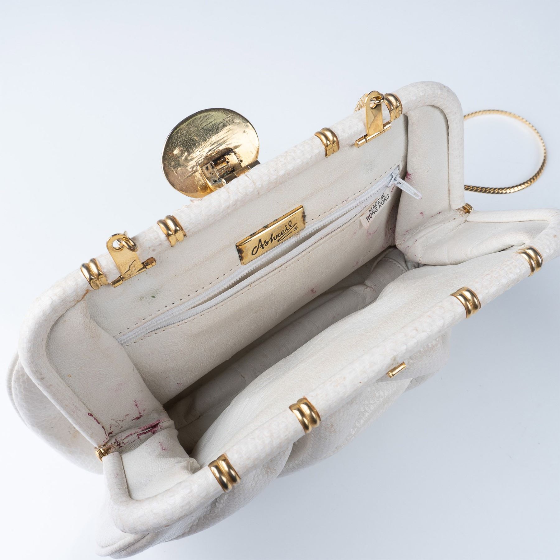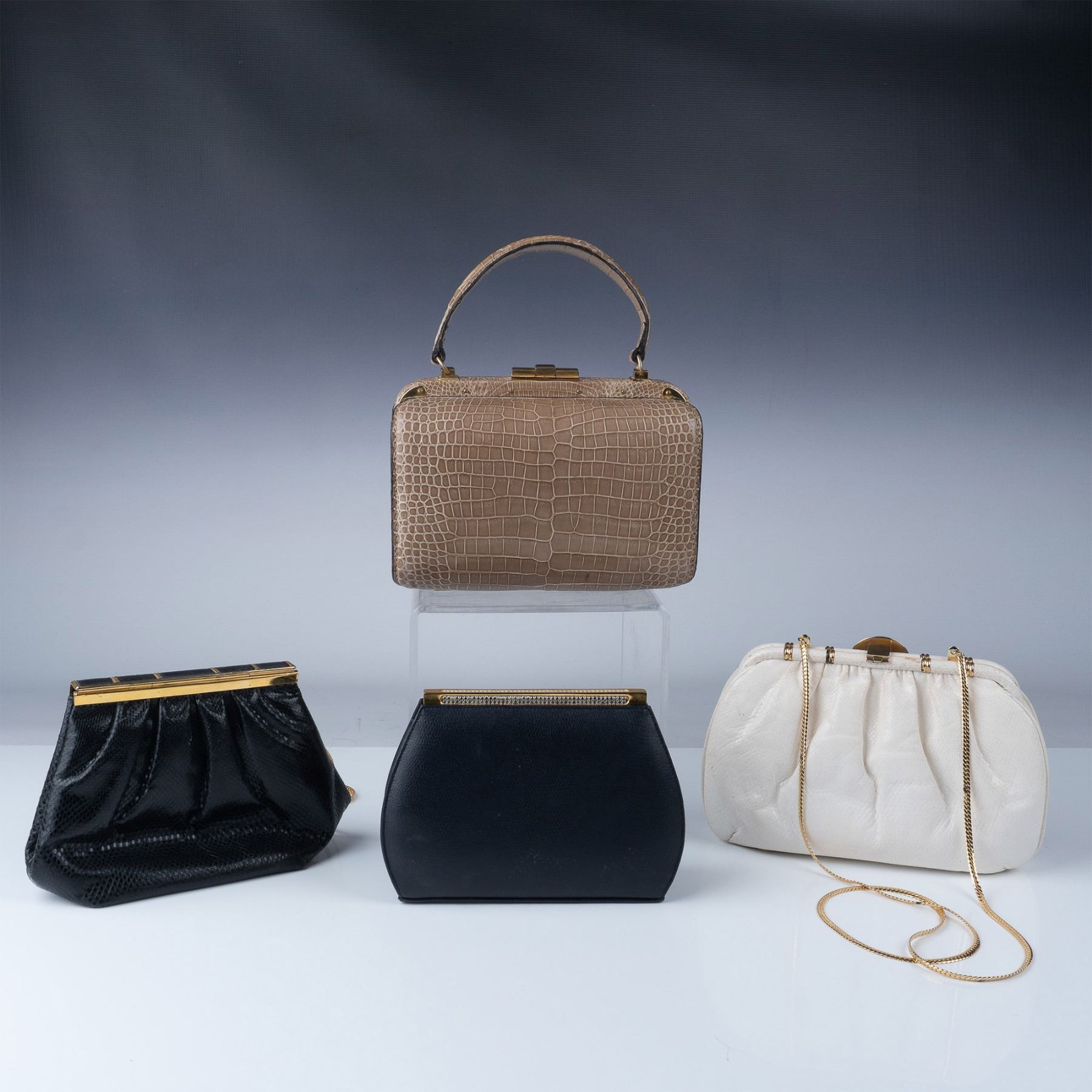 A lot of four vintage designer purses featuring timeless styles from notable brands. The collection includes two Ashneil bags—one black evening bag and one white clutch—both labeled "Made in Hong Kong" and designed with gold-tone hardware. The highlight of this lot is a crocodile-embossed brown handbag by Fernande Desgranges, marked "Made in France," renowned for its elegant Parisian craftsmanship. The lot also includes a plain black clutch with rhinestone detailing along the gold-tone top frame, adding a touch of vintage glamour. This curated set offers a blend of mid-century elegance and enduring fashion from respected designers. Largest purse (Fernande Desgranges) 10"H.