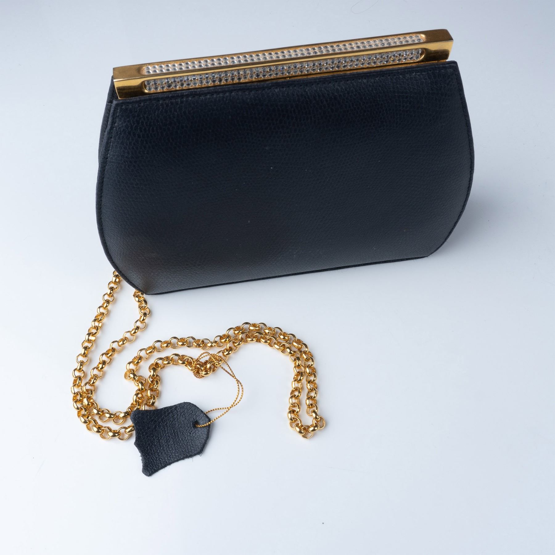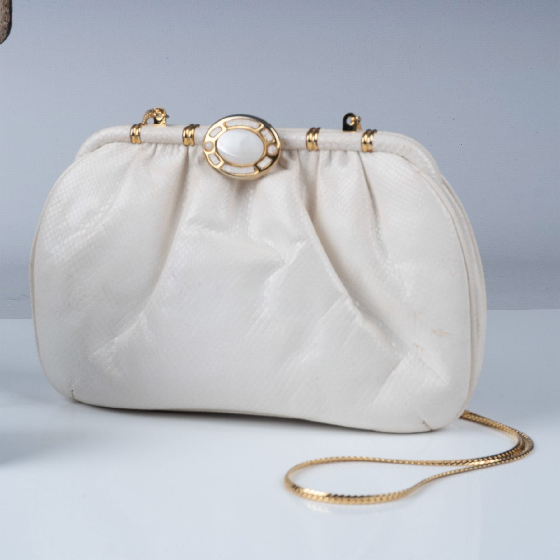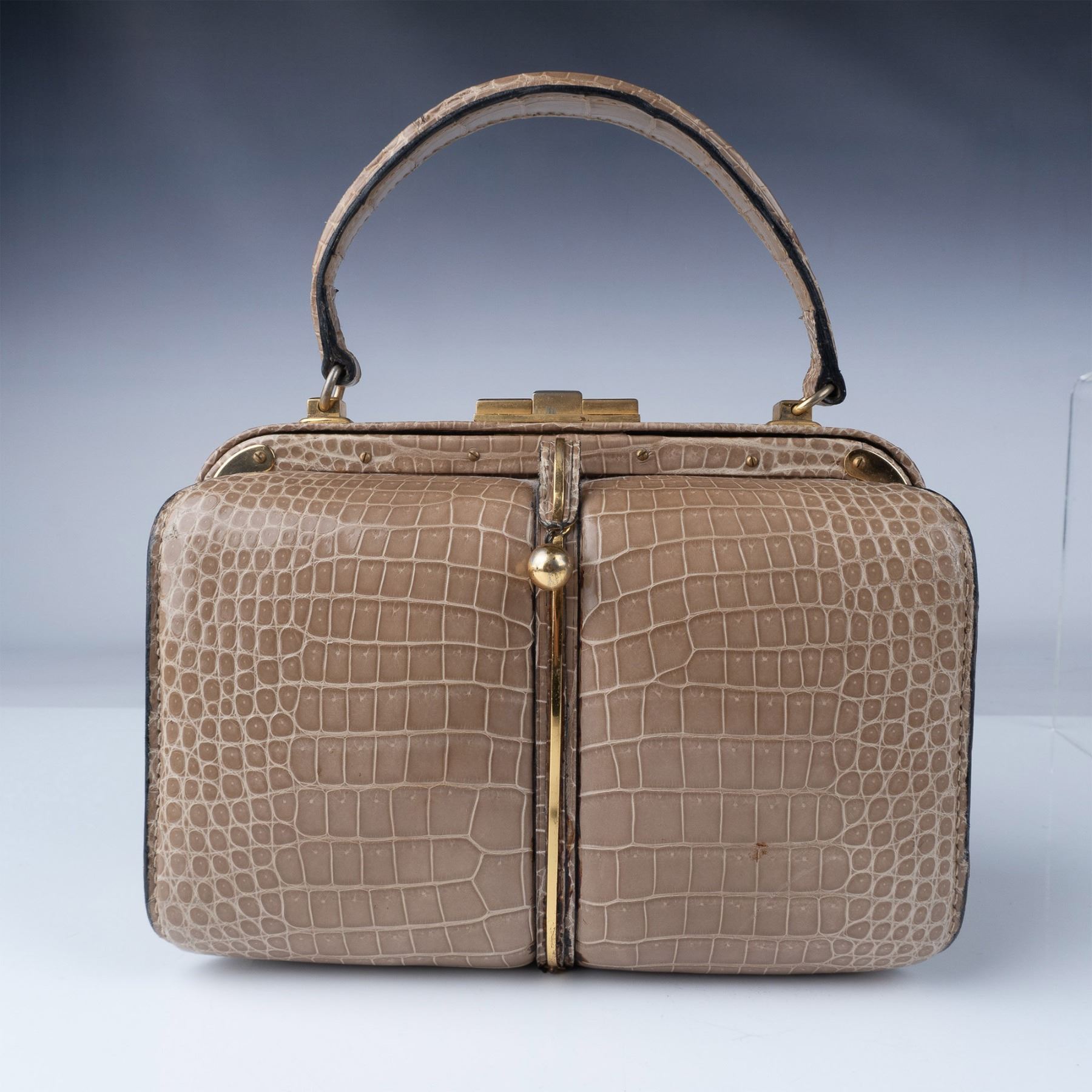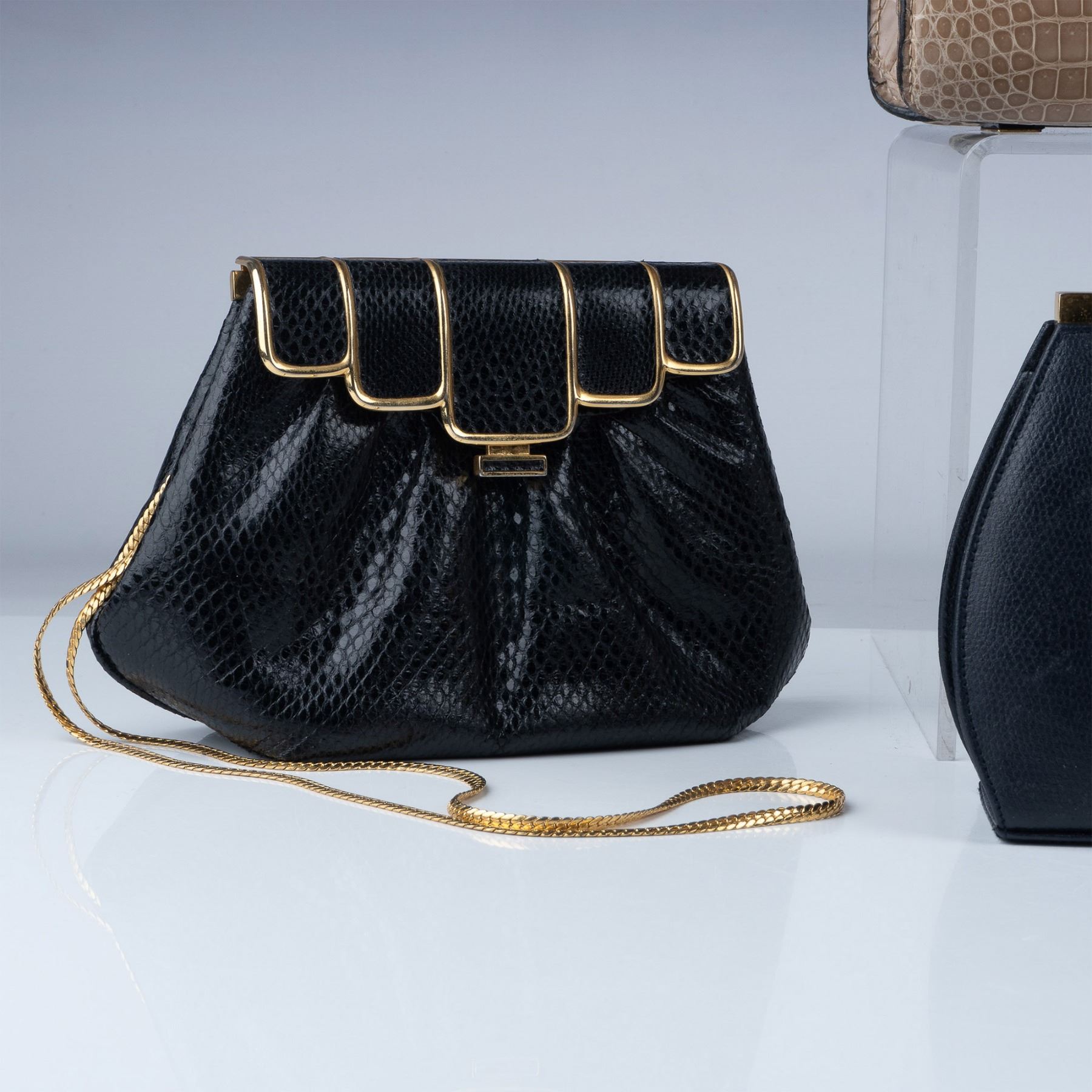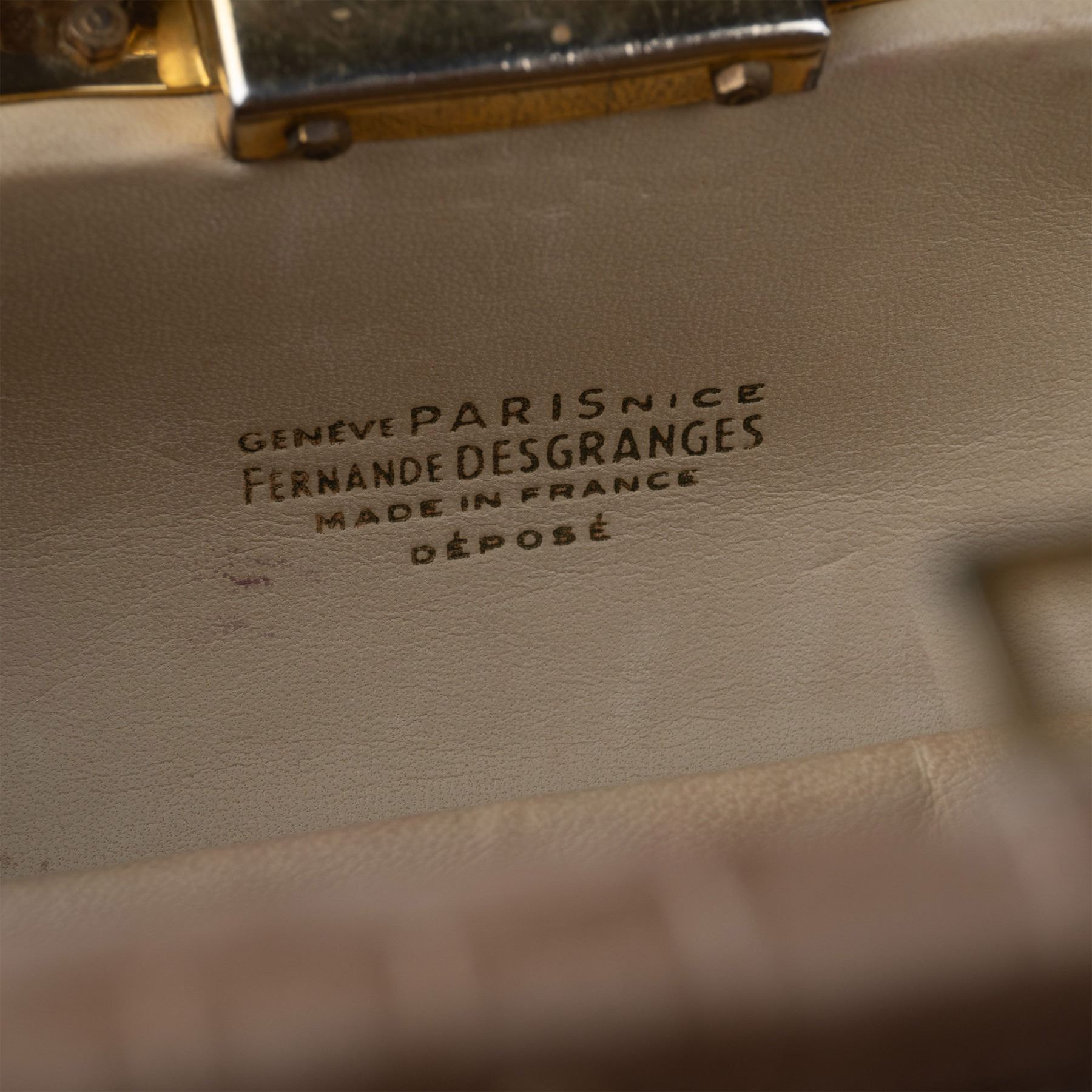 A lot of four vintage designer purses featuring timeless styles from notable brands. The collection includes two Ashneil bags—one black evening bag and one white clutch—both labeled "Made in Hong Kong" and designed with gold-tone hardware. The highlight of this lot is a crocodile-embossed brown handbag by Fernande Desgranges, marked "Made in France," renowned for its elegant Parisian craftsmanship. The lot also includes a plain black clutch with rhinestone detailing along the gold-tone top frame, adding a touch of vintage glamour. This curated set offers a blend of mid-century elegance and enduring fashion from respected designers. Largest purse (Fernande Desgranges) 10"H.