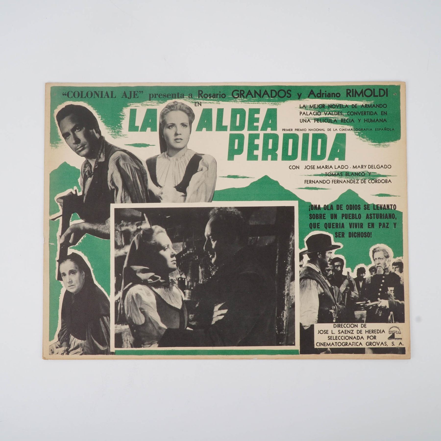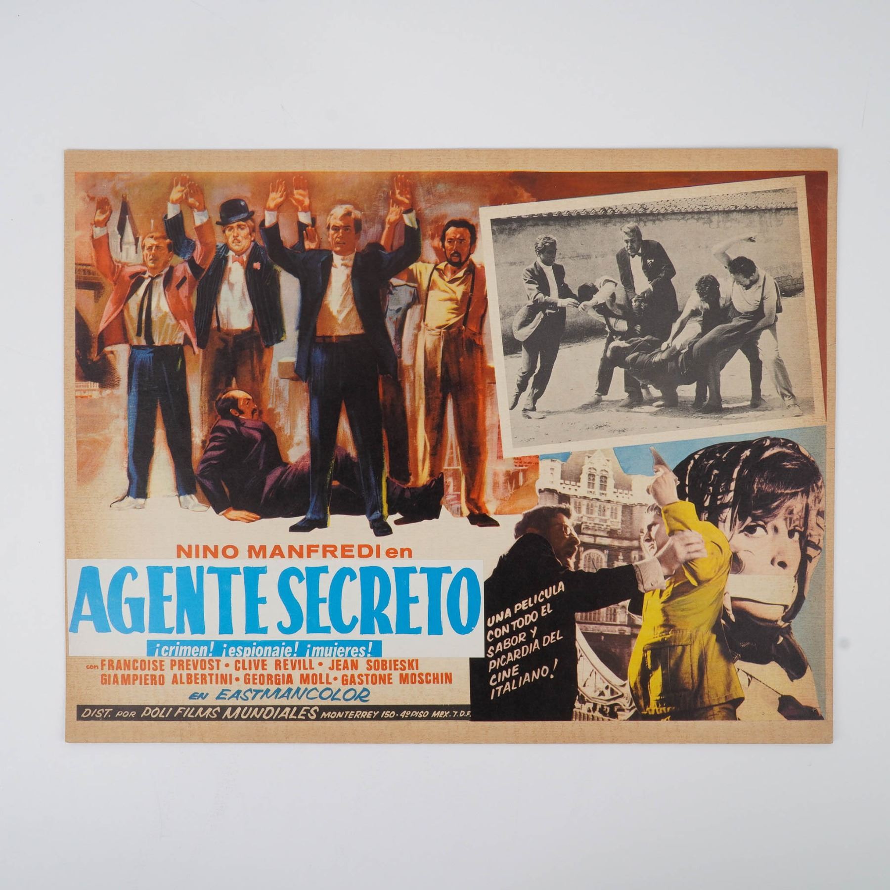 Group of four vibrant mid-20th-century Mexican film display cards, each showcasing bold graphics and promotional images from notable Spanish-language films. Includes: La Aldea Perdida starring Rosario Granados and Adriano Rimoldi, based on the novel by Armando Palacio Valdes; Agente Secreto featuring Nino Manfredi in a crime and espionage thriller; Secreto Profesional with Rosario Granados and Enrique Rambal, directed by Joaquín Pardave; and Dormitorio para Senoritas starring Manolo Fabregas and Mapita Cortes in a comedic ensemble directed by Fernando Cortes. Each card combines vivid color printing with black-and-white stills, highlighting key scenes and characters. These display pieces offer a nostalgic glimpse into the golden age of Latin American cinema.